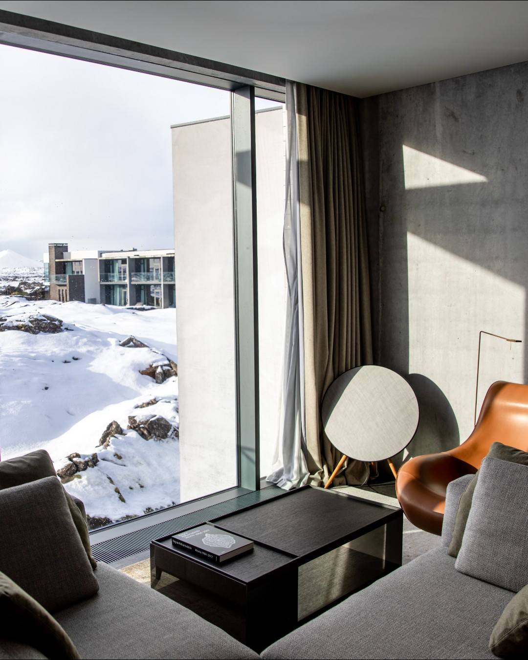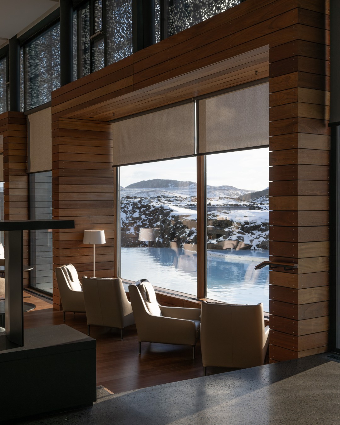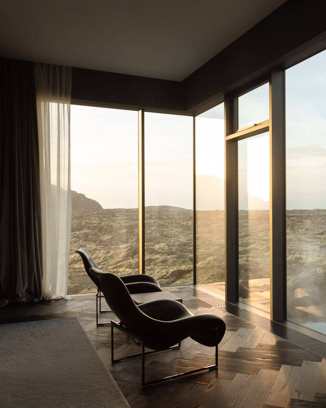 Двухэтажное здание кажется сошедшим с экрана: паровые гейзеры создают эффектную обстановку, а минималистичные интерьеры (здесь нет даже телевизоров) приглашают оставить реальность за дверью, наслаждаясь неземными видами и ленивыми прогулками по отелю в мягком как облако халате.