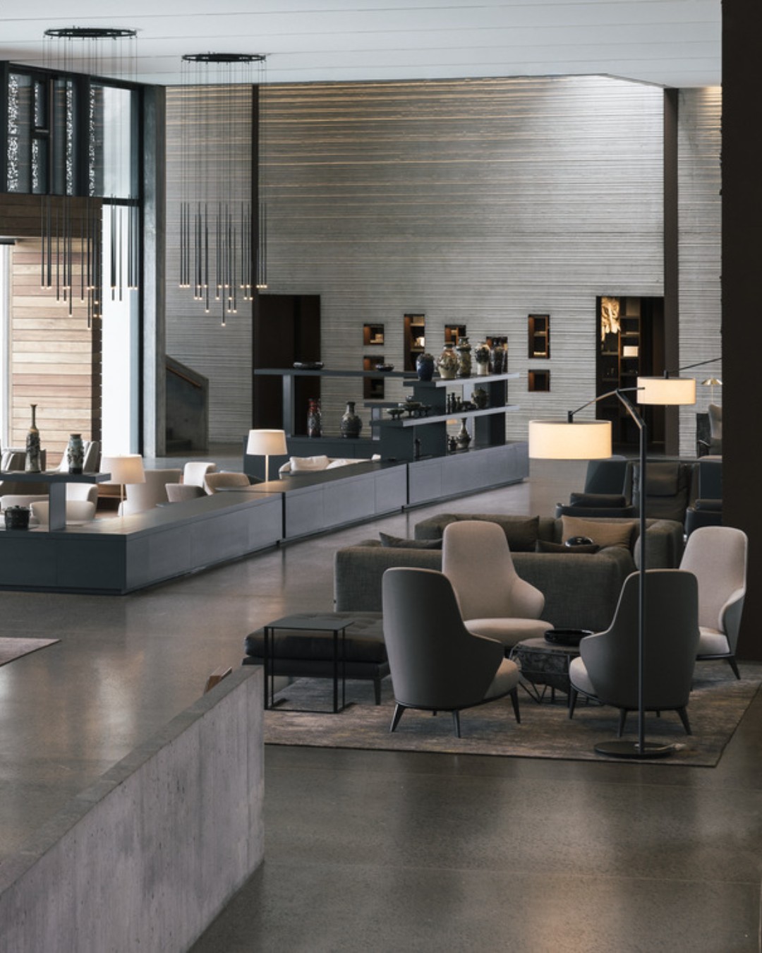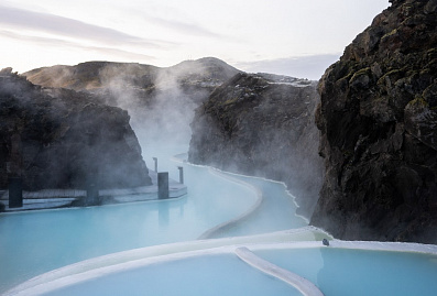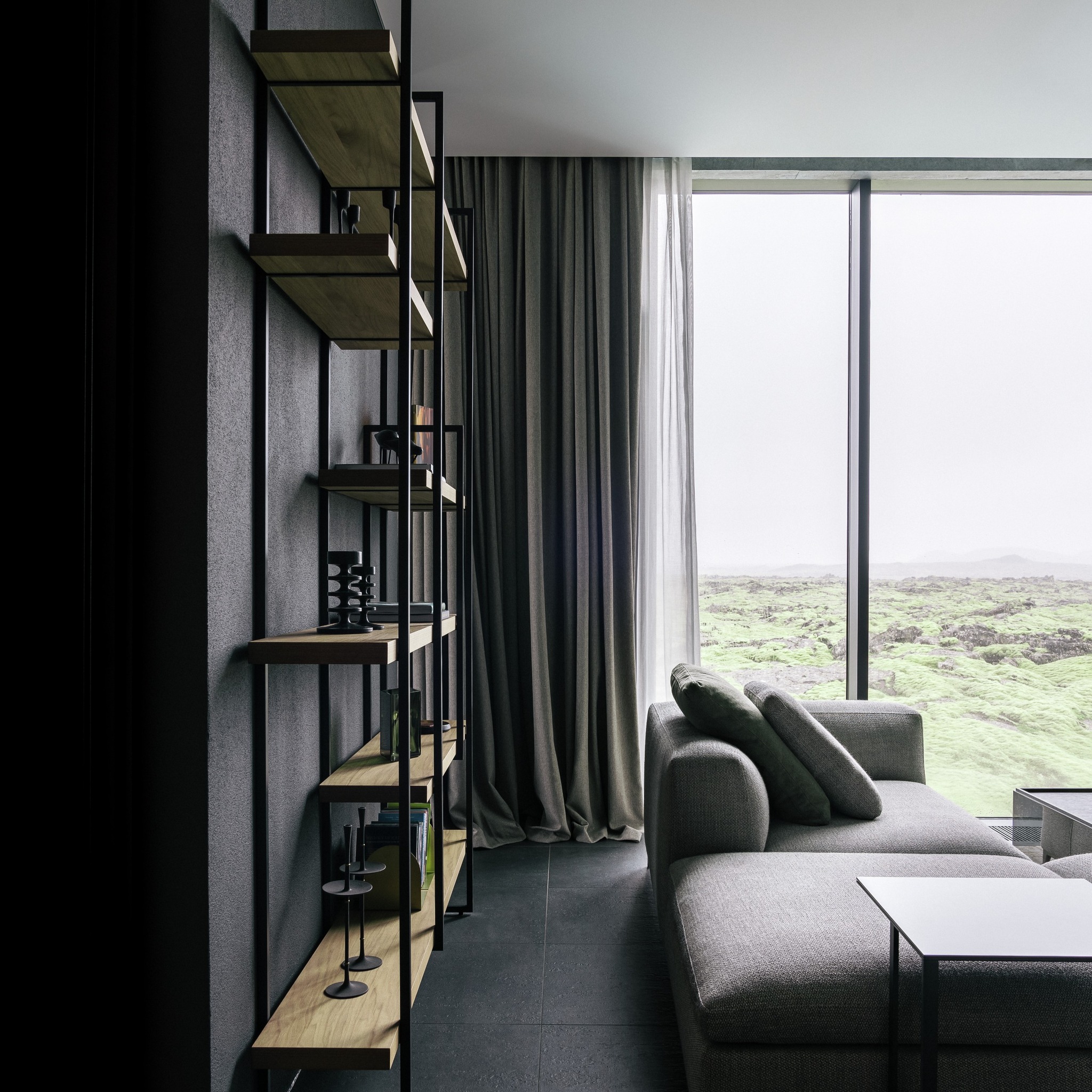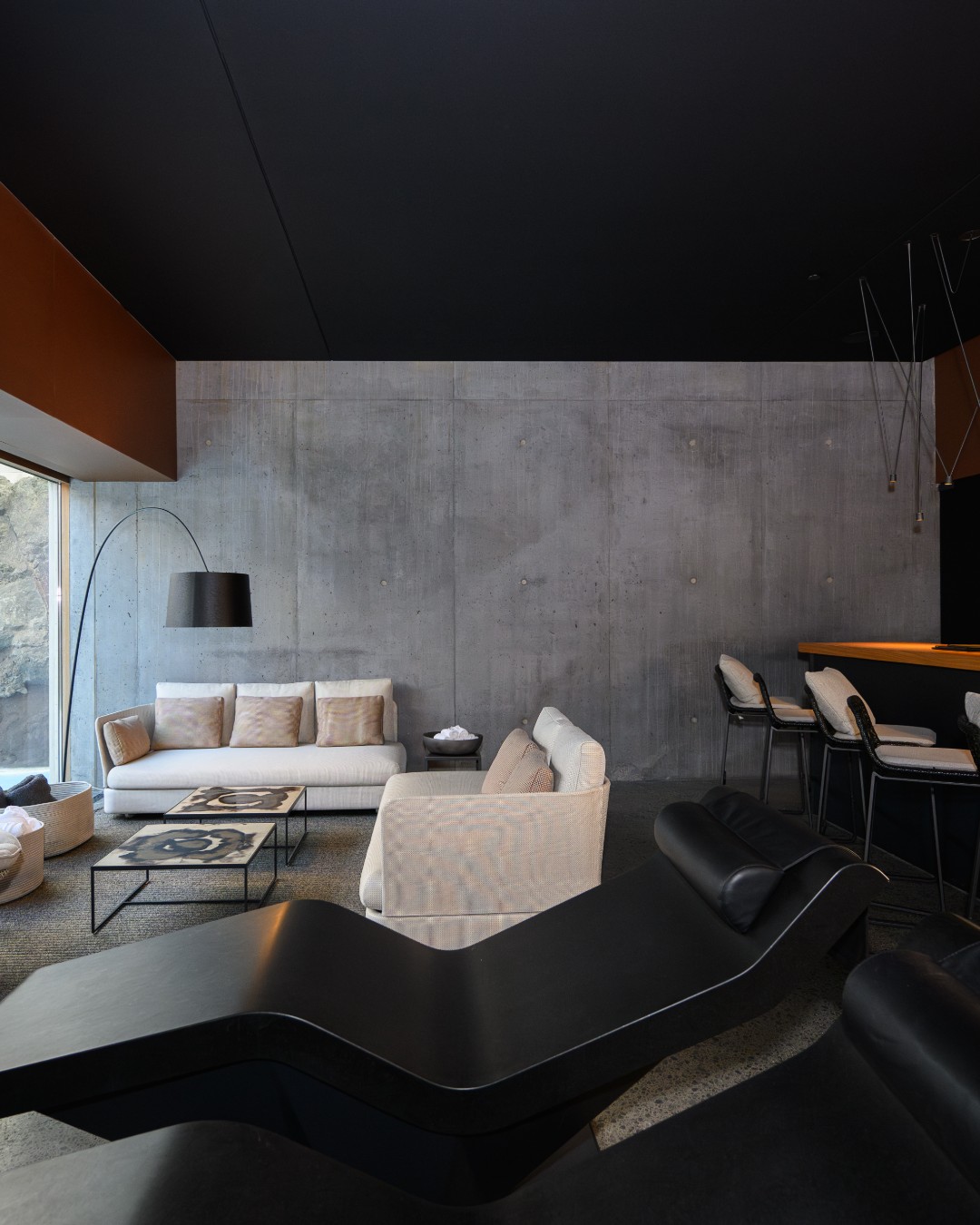 Двухэтажное здание кажется сошедшим с экрана: паровые гейзеры создают эффектную обстановку, а минималистичные интерьеры (здесь нет даже телевизоров) приглашают оставить реальность за дверью, наслаждаясь неземными видами и ленивыми прогулками по отелю в мягком как облако халате.