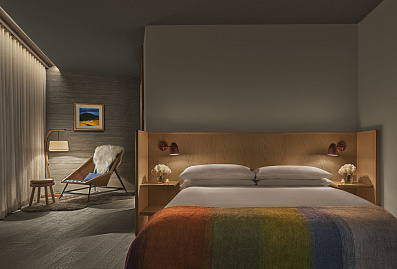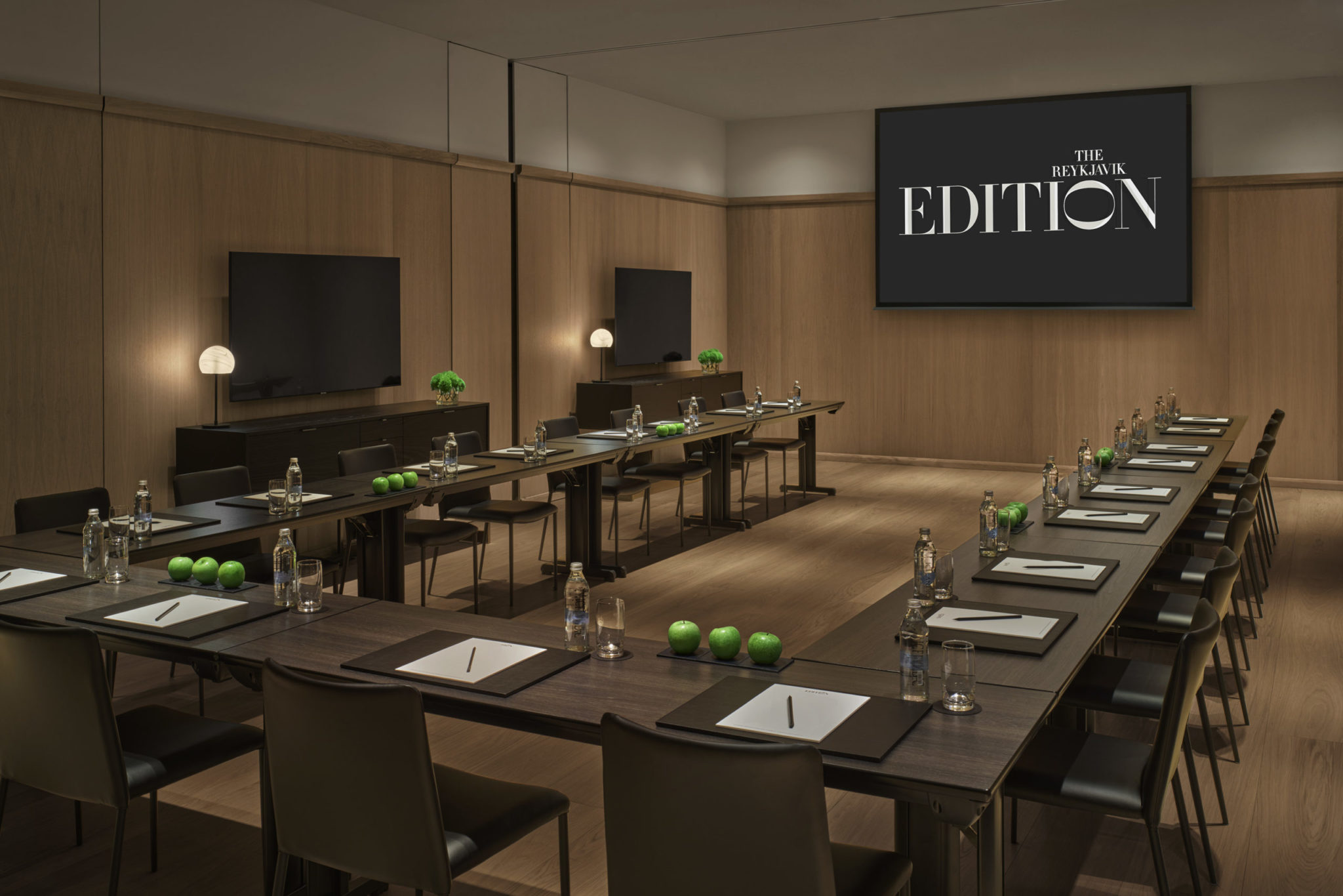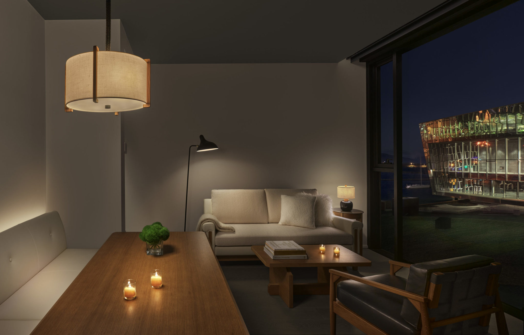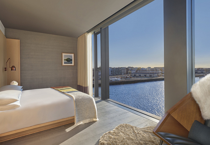 Как и сам город, этот отель — Исландия в миниатюре. В номерах — светлое дерево, работы местных художников и традиционные детали. Общие пространства космополитичны, но отсылки к исландской культуре можно найти везде, да и четырехметровый базальтовый тотем в лобби не даст забыть, где вы.