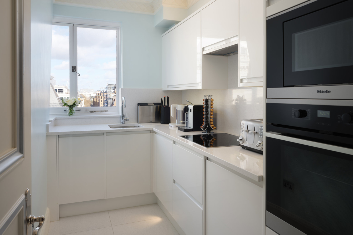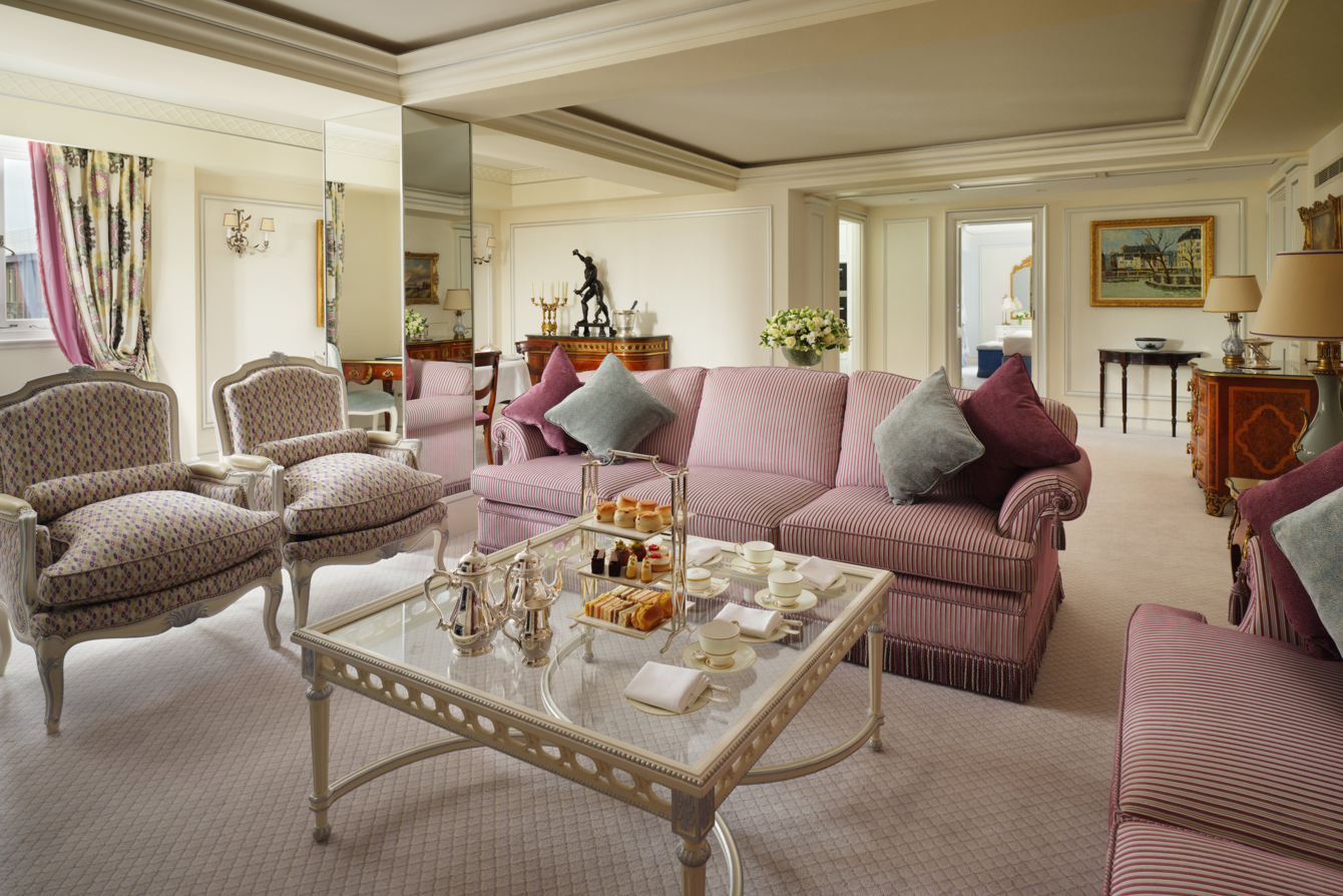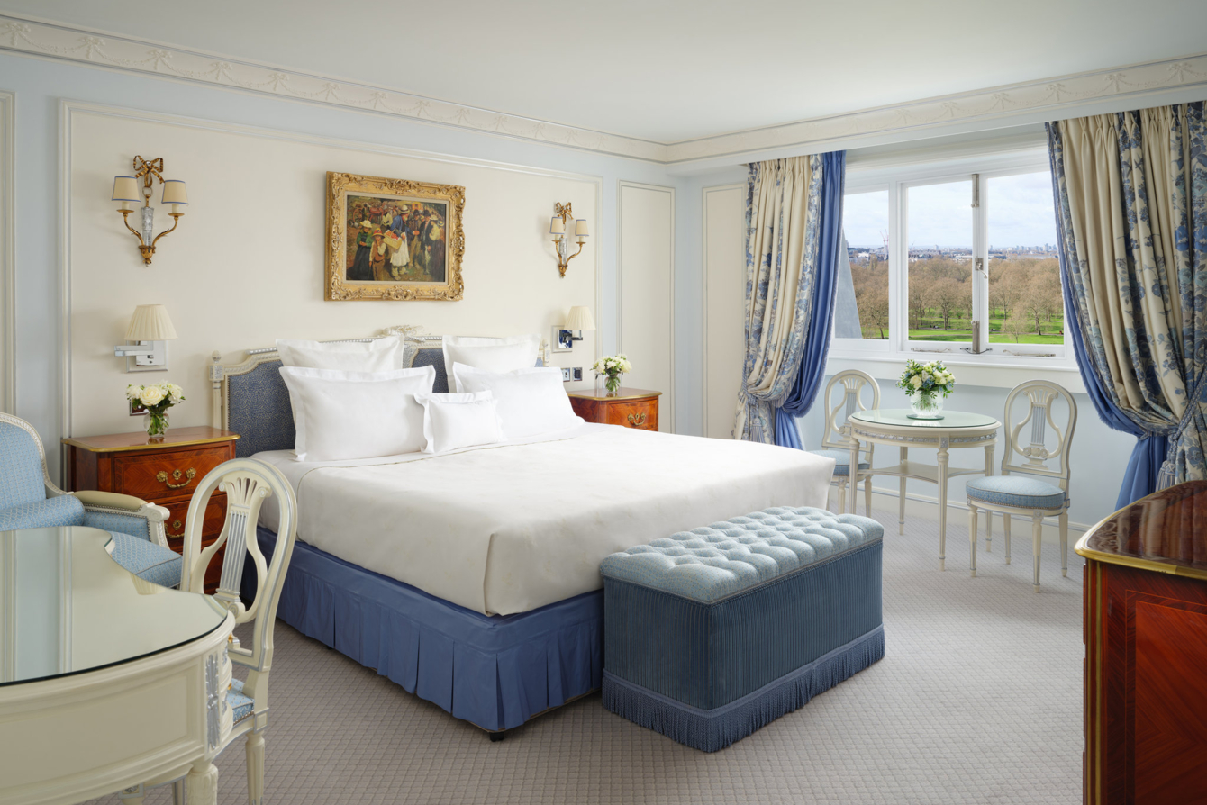 Люкс с двумя спальнями и собственной отдельной кухней. Ванная комната с двумя раковинами и ванной в каждой спальне. Из спальни открывается вид на Грин-парк, из просторной гостиной — на Пикадилли.