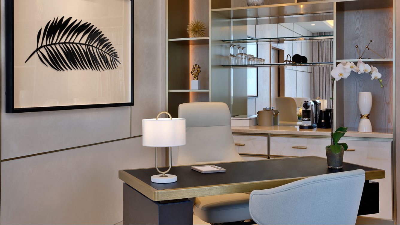 Просторный люкс с видом на море, одной спальней, двумя отдельными гостиными и обеденной зоной. Гостевой туалет, ванная с душем, биде, двумя раковинами и отдельно стоящей ванной. Кровать размера king-size.