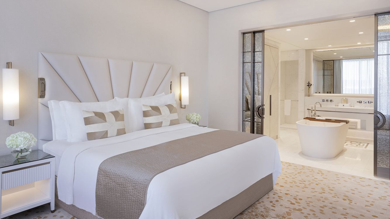 Люкс с видом на море и отдельной спальней с кроватью размера king-size. Просторная гостиная и обеденная зона, гостевой туалет. В ванной комнате есть биде, душевая кабина, две раковины и отдельно стоящая ванна.