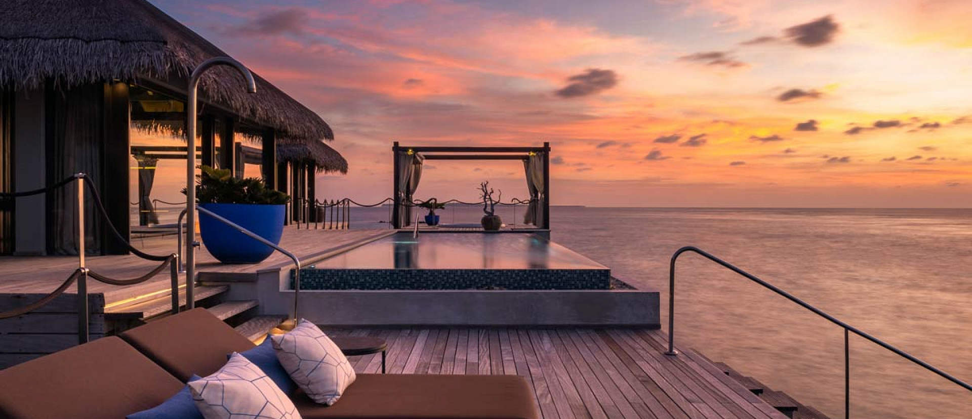 Вилла на воде с двумя спальнями, каждая из которых выходит к океану. Терраса с джакузи, двумя беседками для обедов на открытом воздухе, инфинити-бассейн. Кровати в спальнях super king-size. Две ванные комнаты с двумя раковинами, тропическим душем и ваннами с видом на океан.
