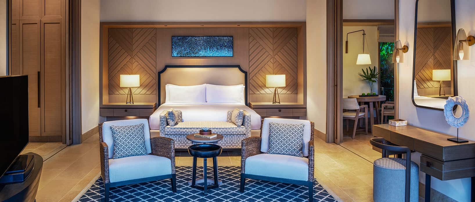 Вилла на пляже с отдельной гостиной зоной, террасой, инфинити-бассейном и беседкой для обедов на свежем воздухе. Кровать king-size в спальне. Душевая кабина и ванна внутри виллы, тропический душ на открытом воздухе. Разросшаяся растительность может закрывать вид на океан.