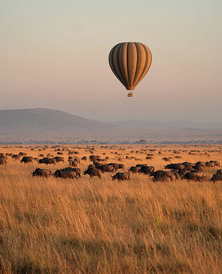 Под вами — саванна: полосы рек, стада, следы ночных троп. Солнце встает медленно, и земля меняет цвет — от серого к медному, от медного к золотому. Травоядные просыпаются, хищники уходят в тень. Шампанское? Разумеется!