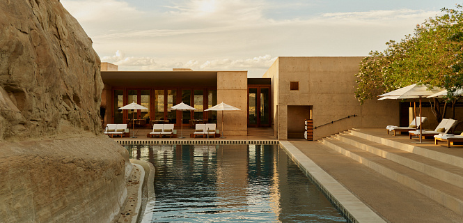 После обеда на воде — заселение в отель Amangiri, который сливается с ландшафтом и позволяет вам стать частью этого без преувеличения совершенного пейзажа.