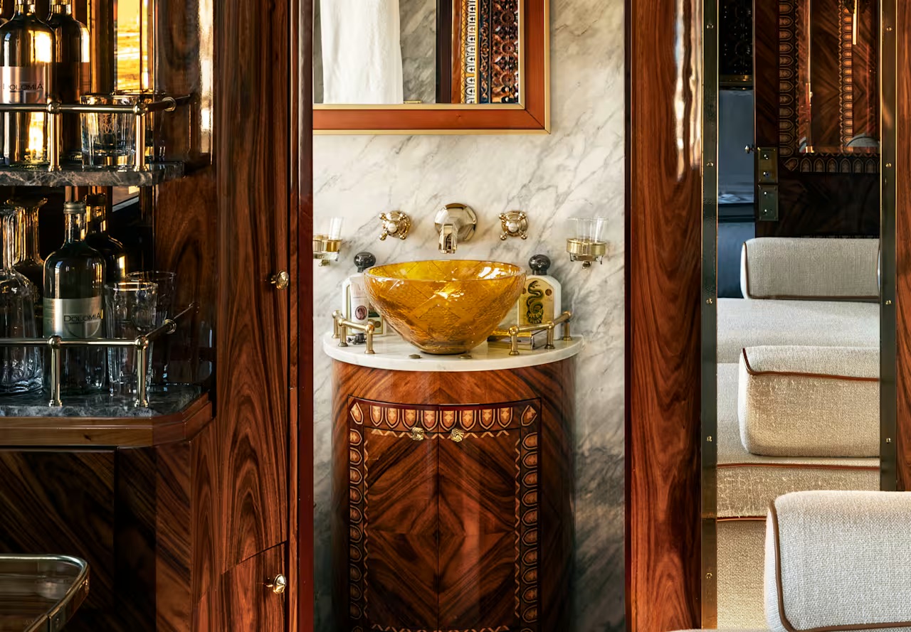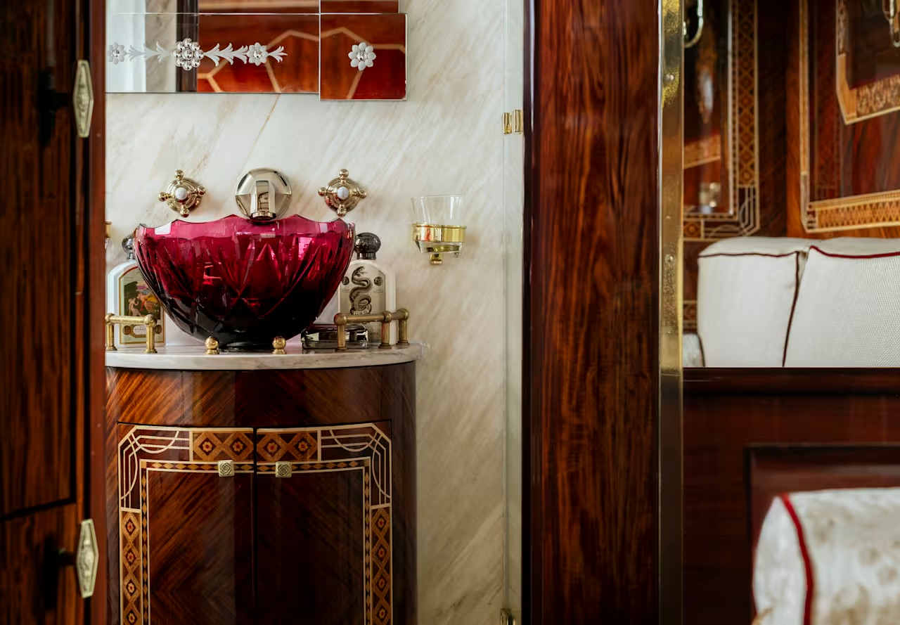 Чтобы вернуть этот состав на рельсы, Belmond собрал лучших ремесленников современности: от потомственных стеклодувов и реставраторов до мастеров маркетри. Их работа превратила поезд в роскошное видение эпохи, где каждый лакированный изгиб и каждая панель Рене Лалика сохранили свой первозданный блеск и эстетику.