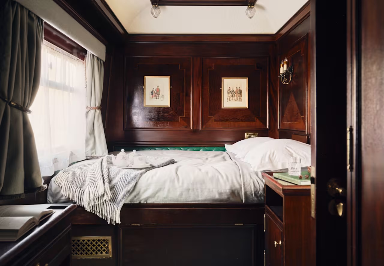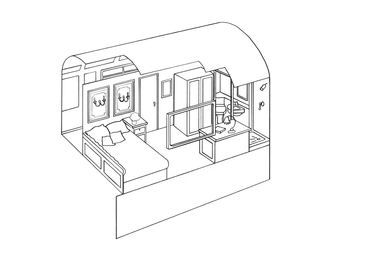 Купе с двуспальной кроватью, письменным столом, вместительным гардеробном и собственной душевой комнатой.