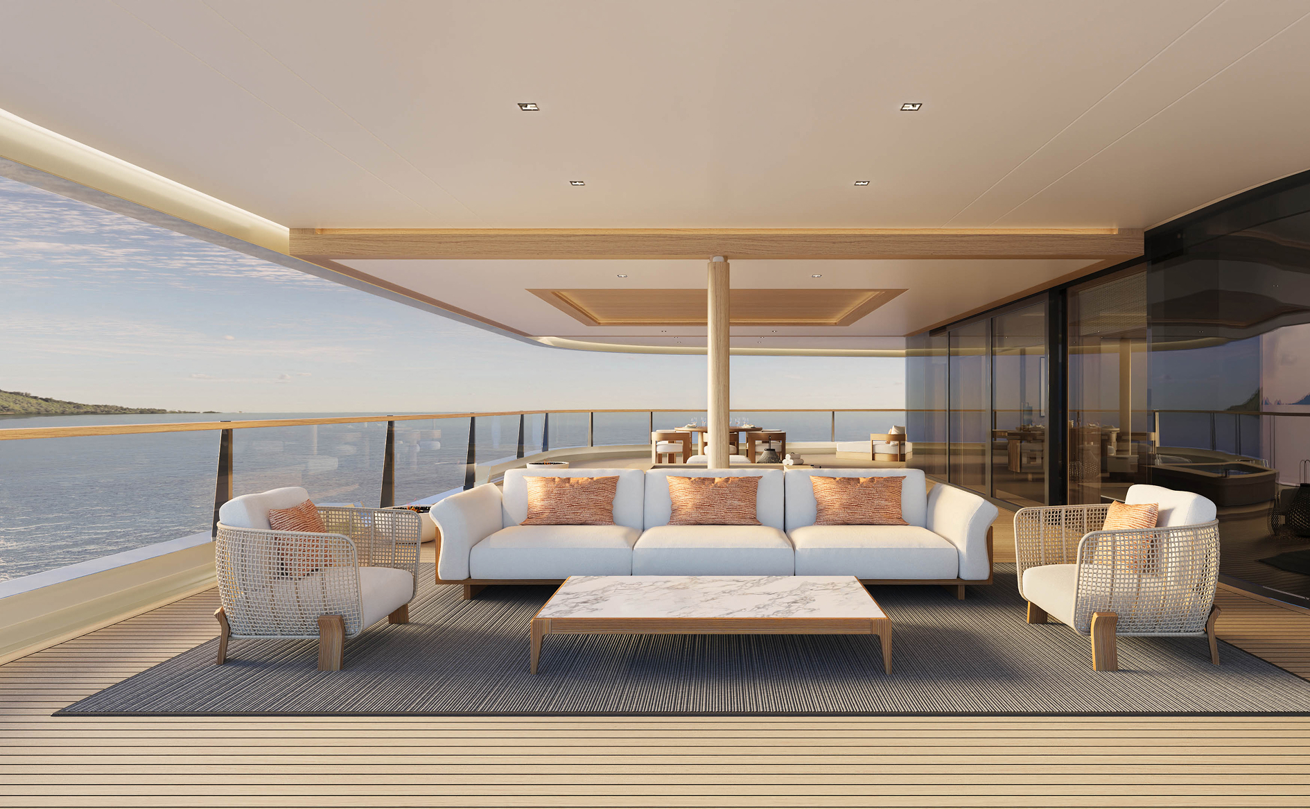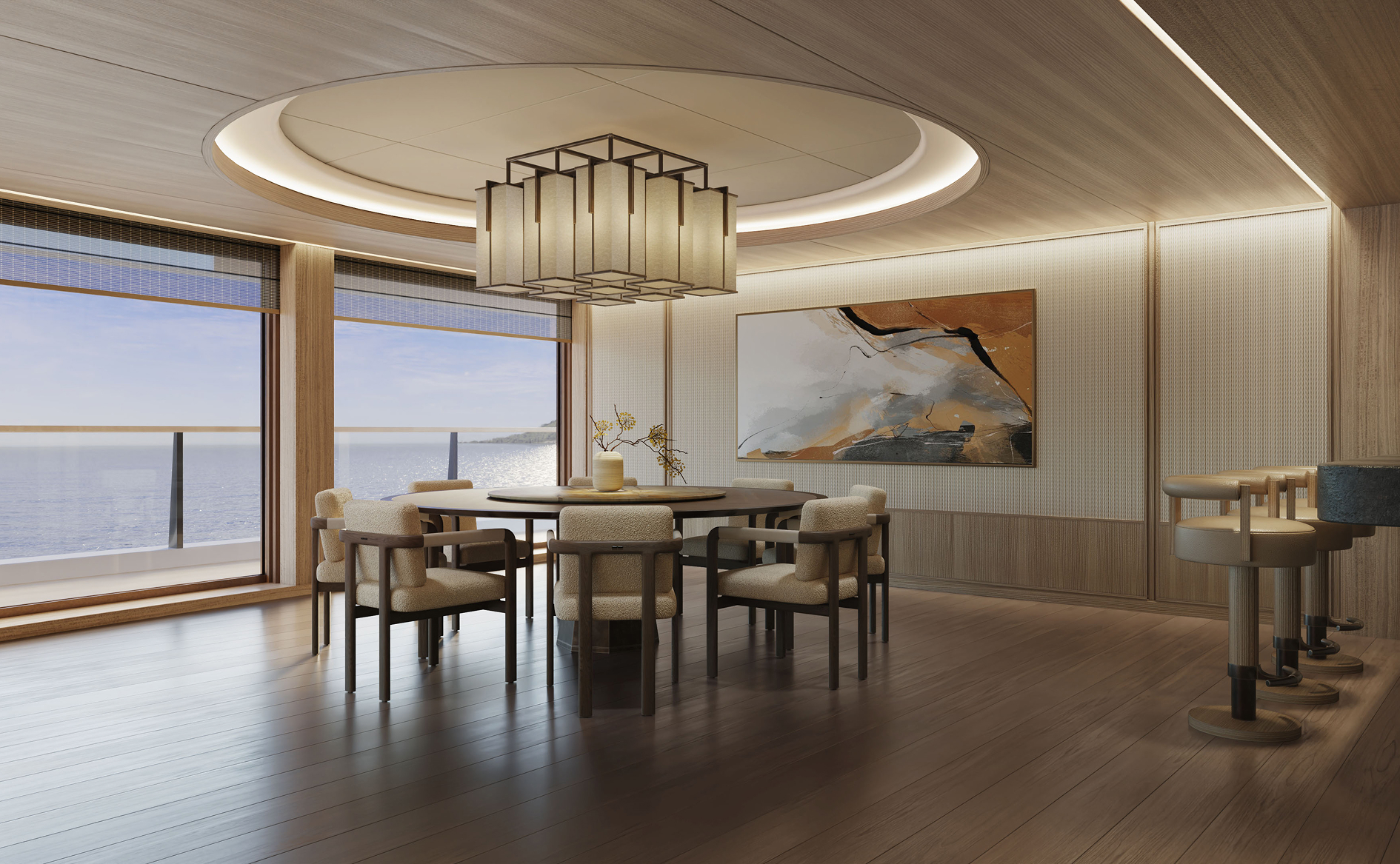 Самый большой номер яхты в кормовой части пятой палубы. Частный лифт, высокие потолки, панорамные окна и просторная гостиная с обеденной зоной, баром и столом на двенадцать персон.