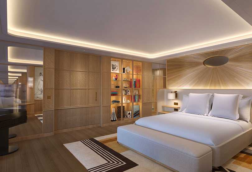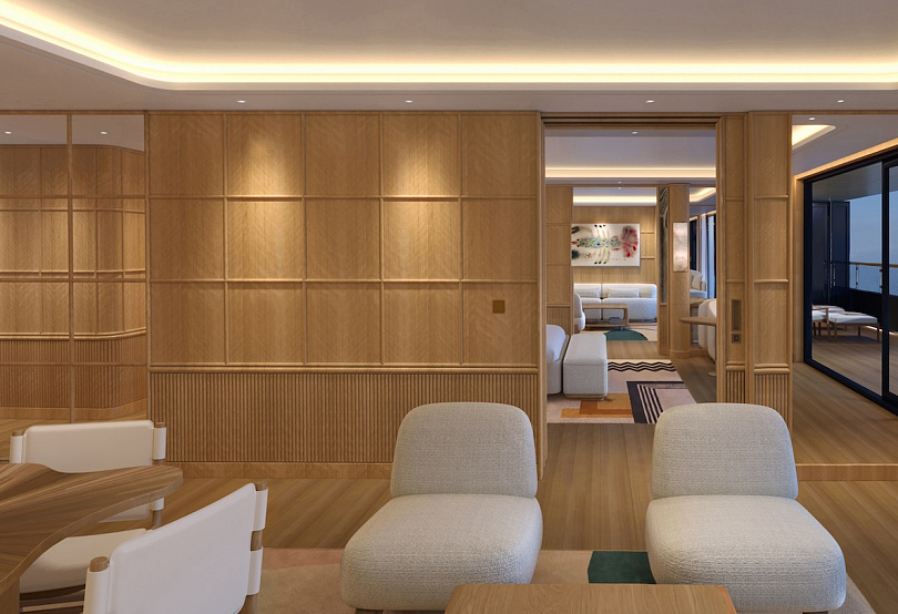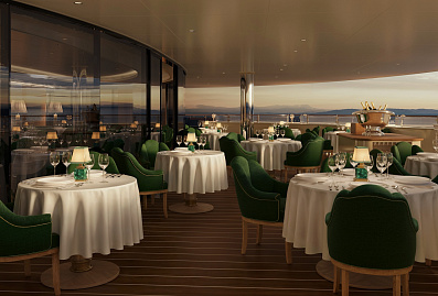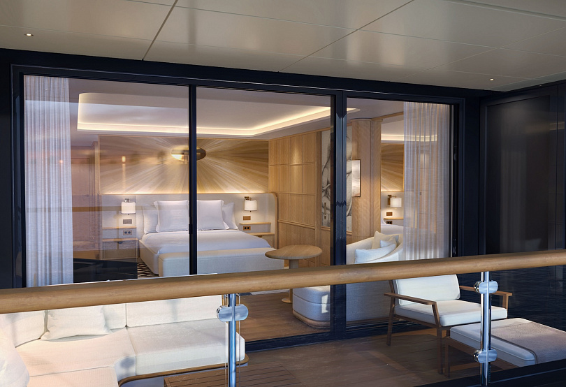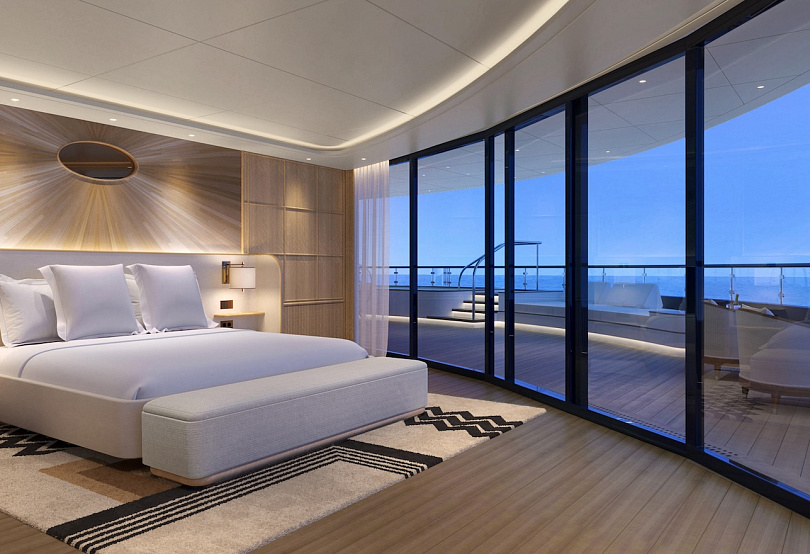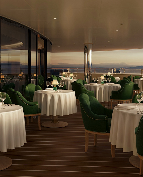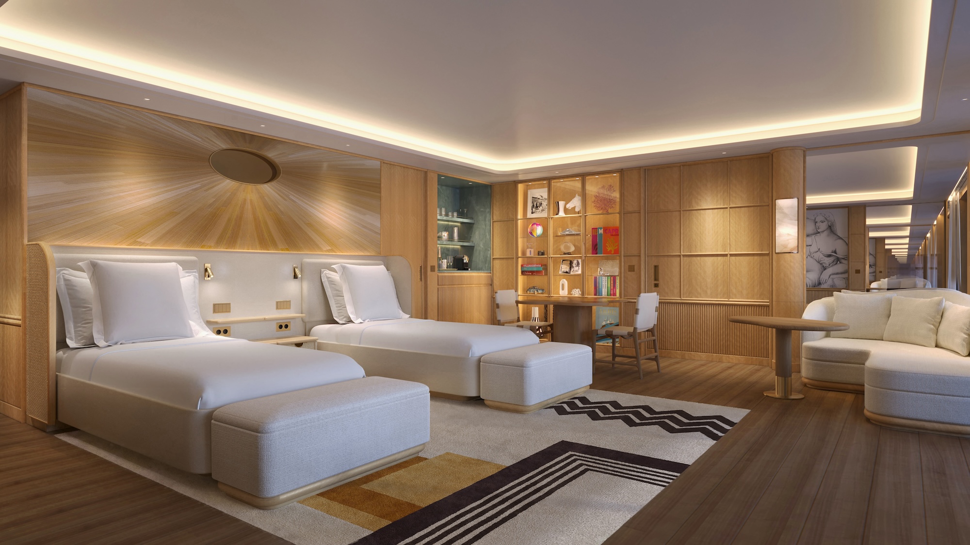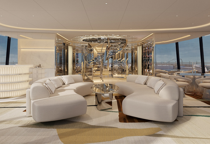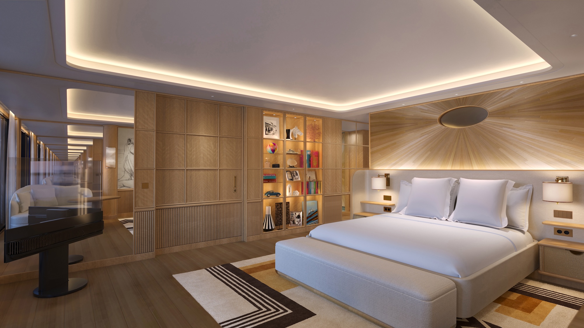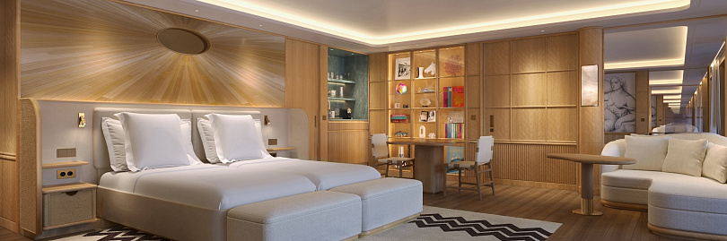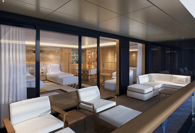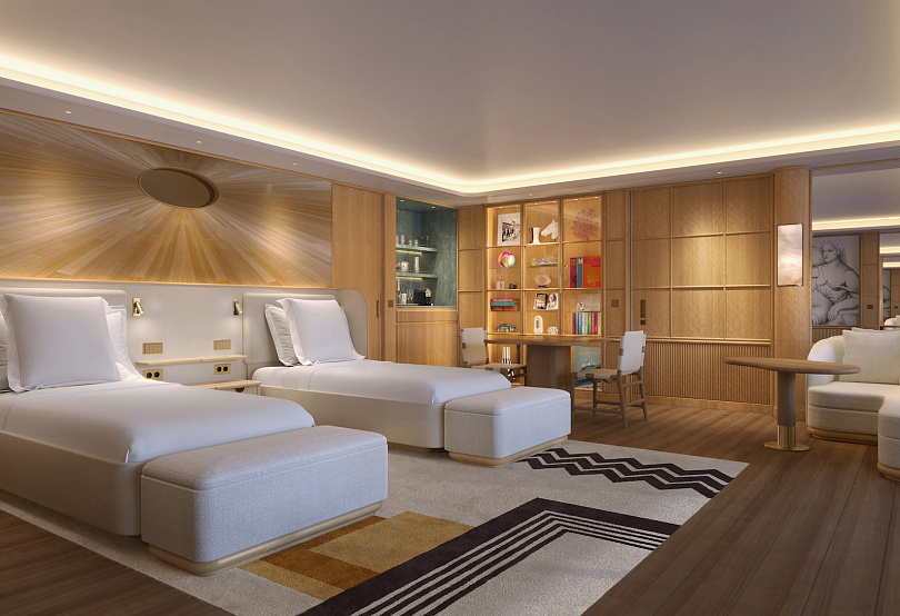 Главный шедевр — четырехуровневый пентхаус Funnel Suite: почти тысяча квадратных метров, изогнутые панорамные окна с обзором на 280°, собственный бассейн и отдельная зона для spa-процедур. Пространство рассчитано всего на шестерых гостей и станет одним из самых больших сьютов в истории морских путешествий.