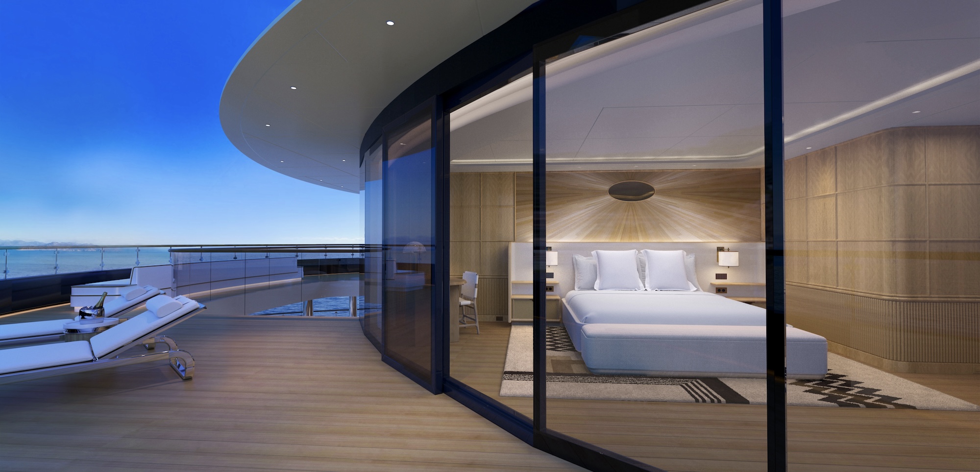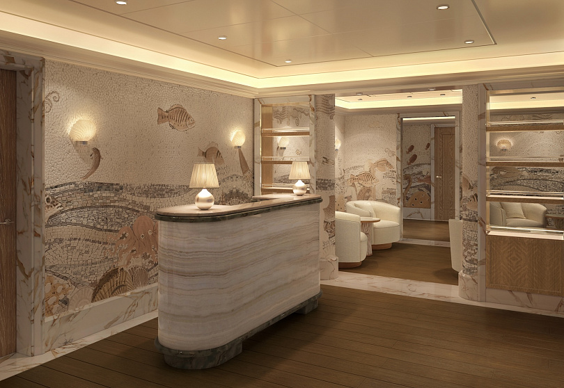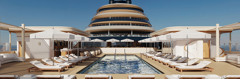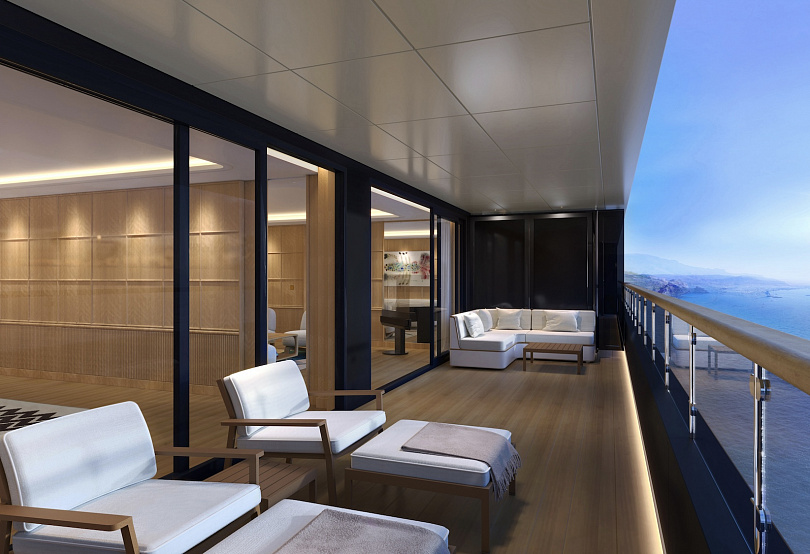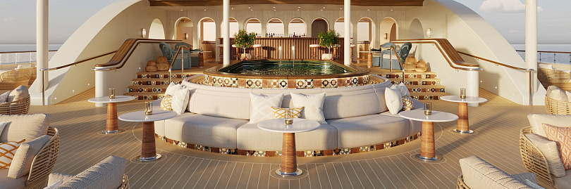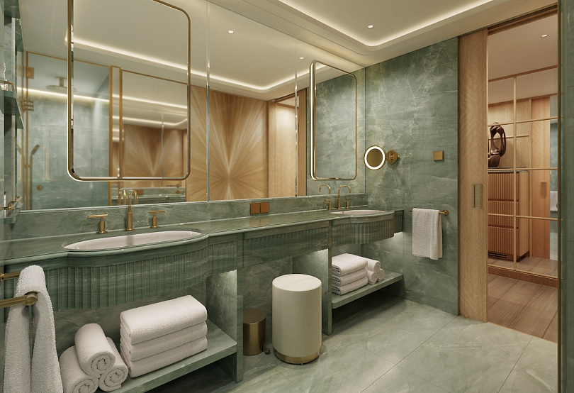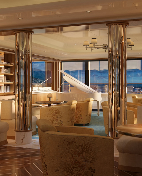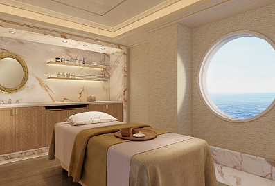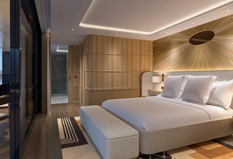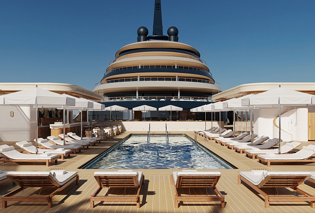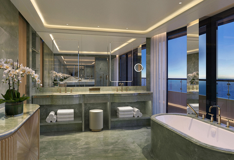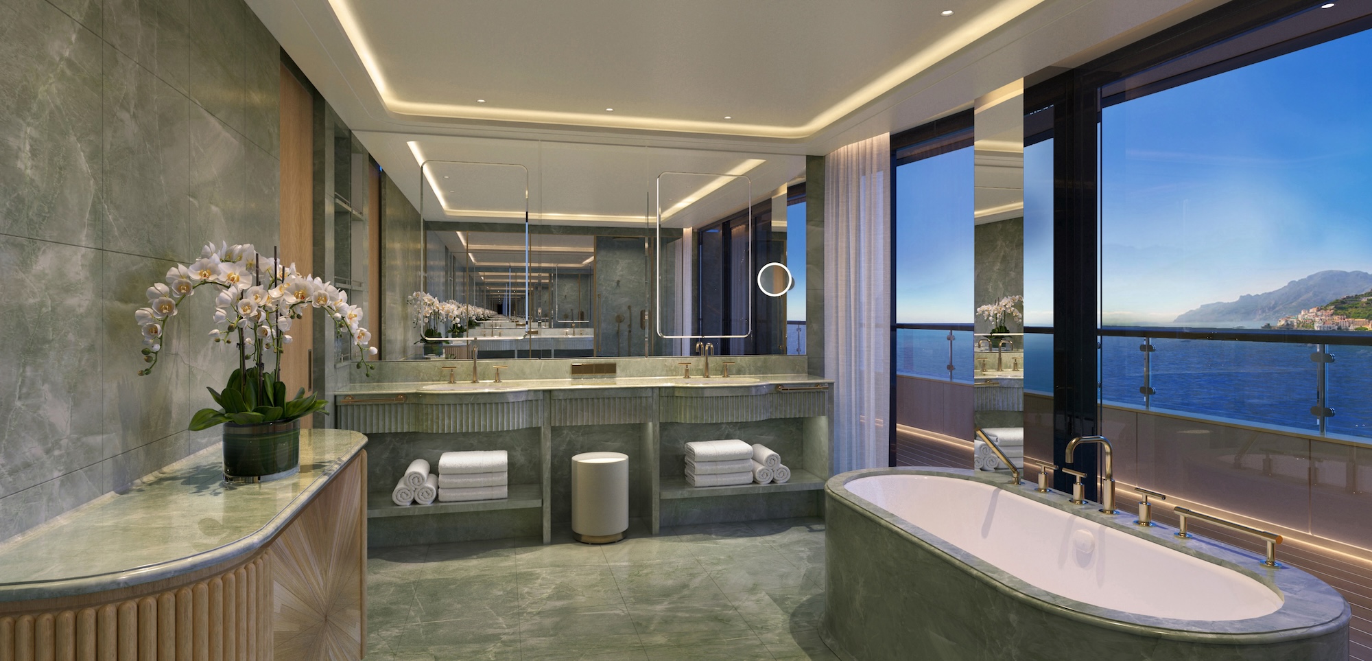 Главный шедевр — четырехуровневый пентхаус Funnel Suite: почти тысяча квадратных метров, изогнутые панорамные окна с обзором на 280°, собственный бассейн и отдельная зона для spa-процедур. Пространство рассчитано всего на шестерых гостей и станет одним из самых больших сьютов в истории морских путешествий.