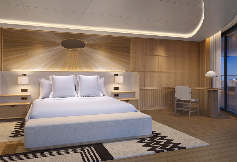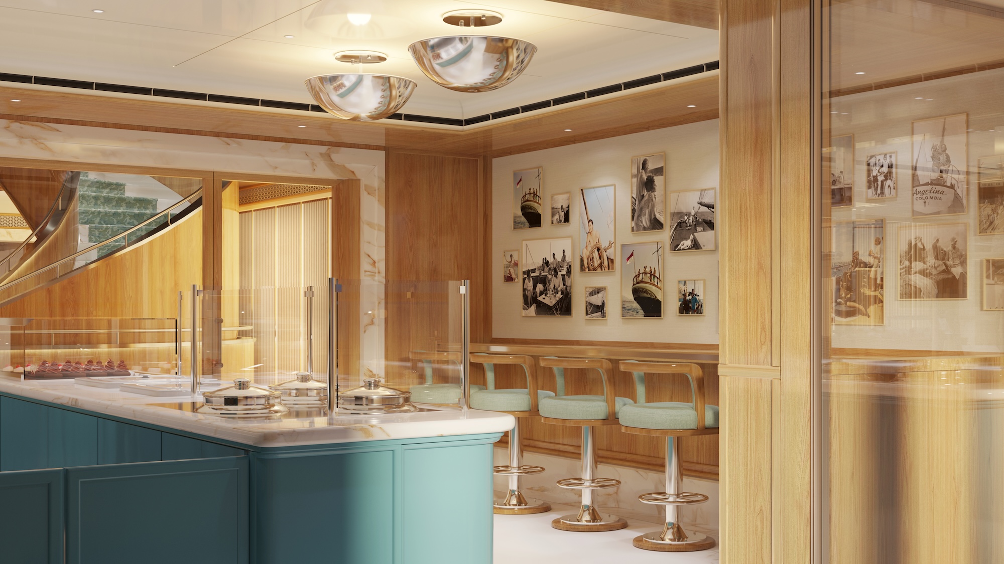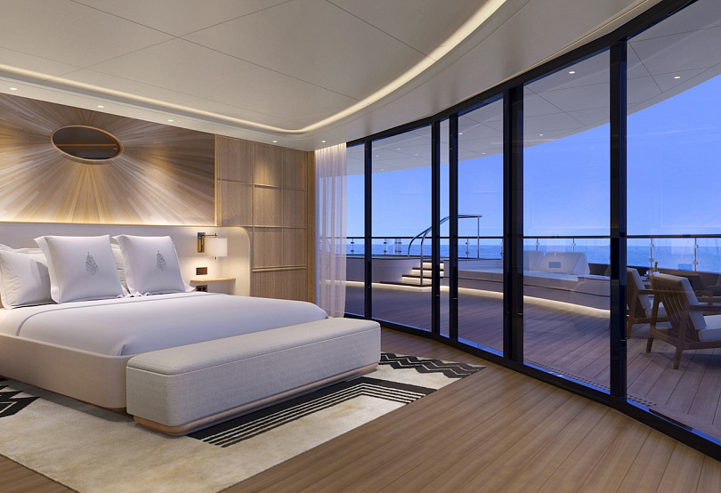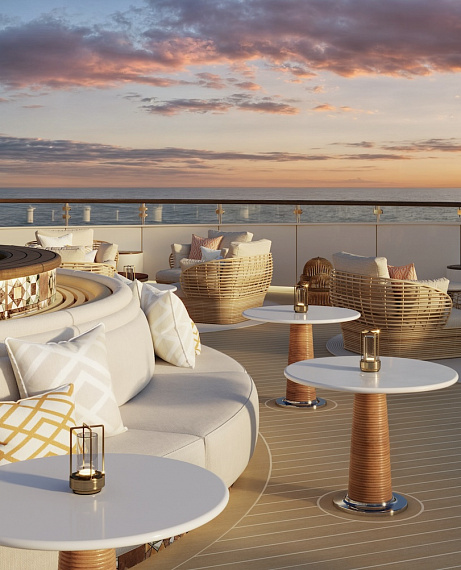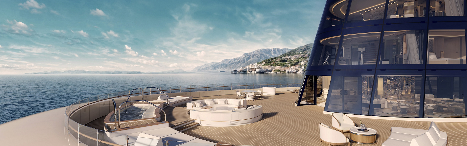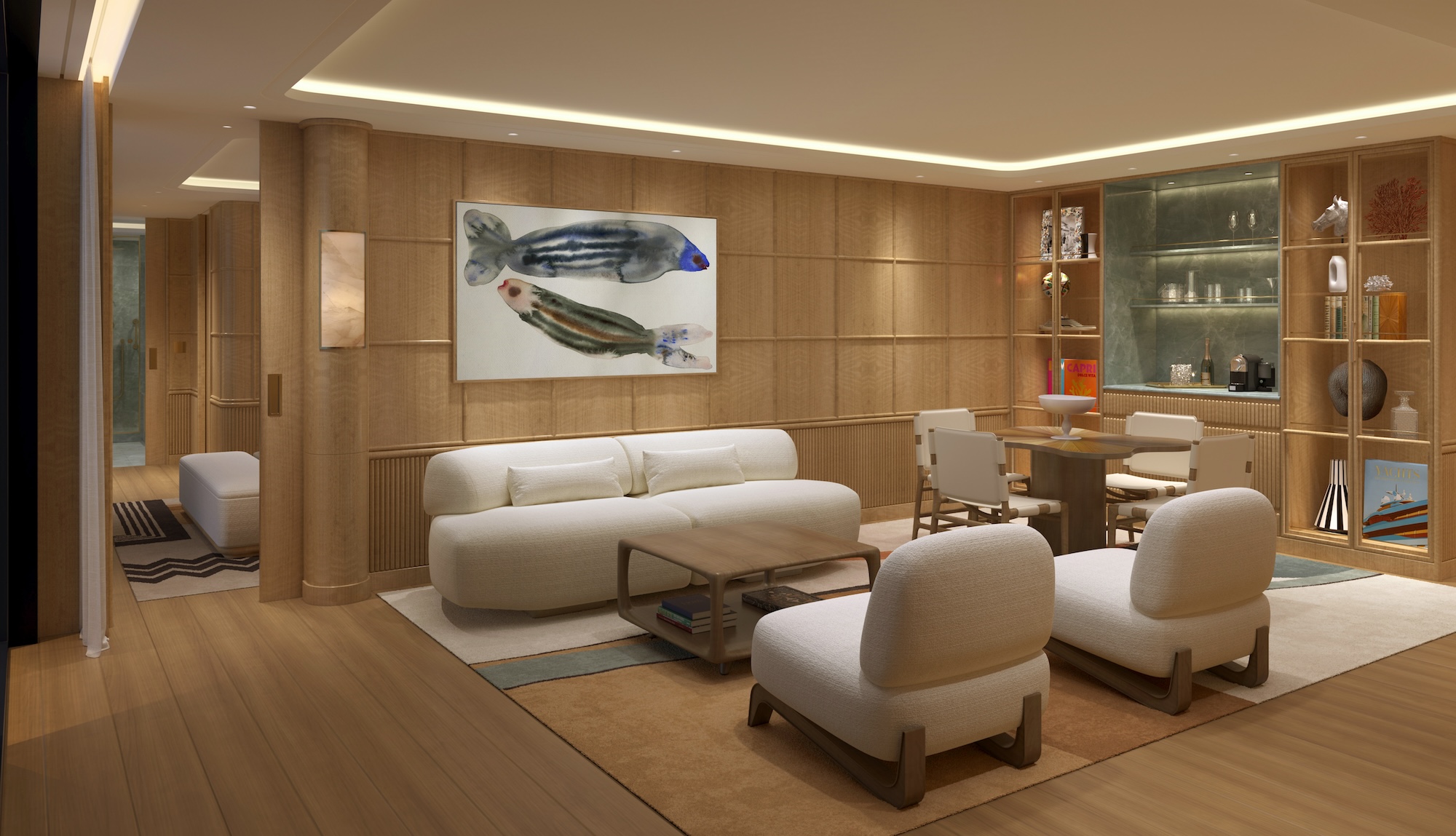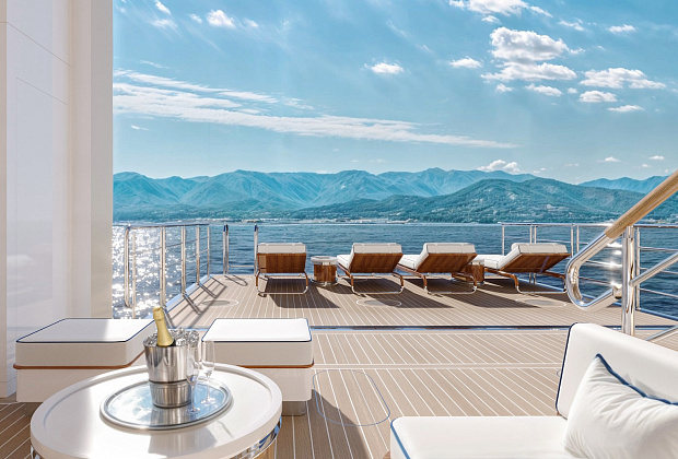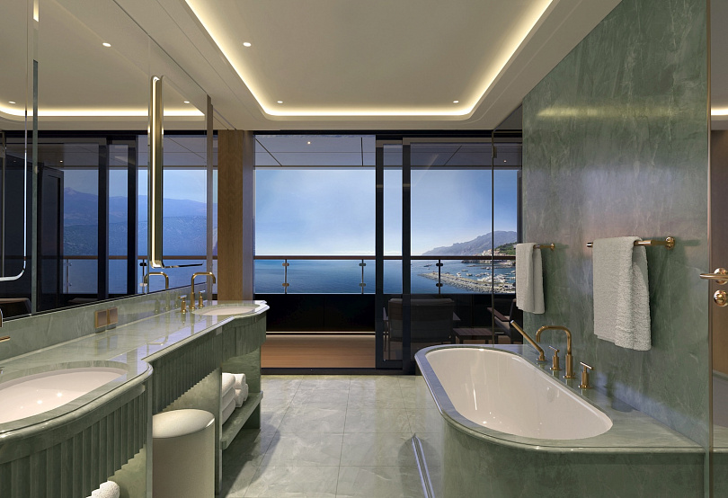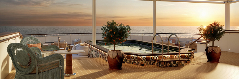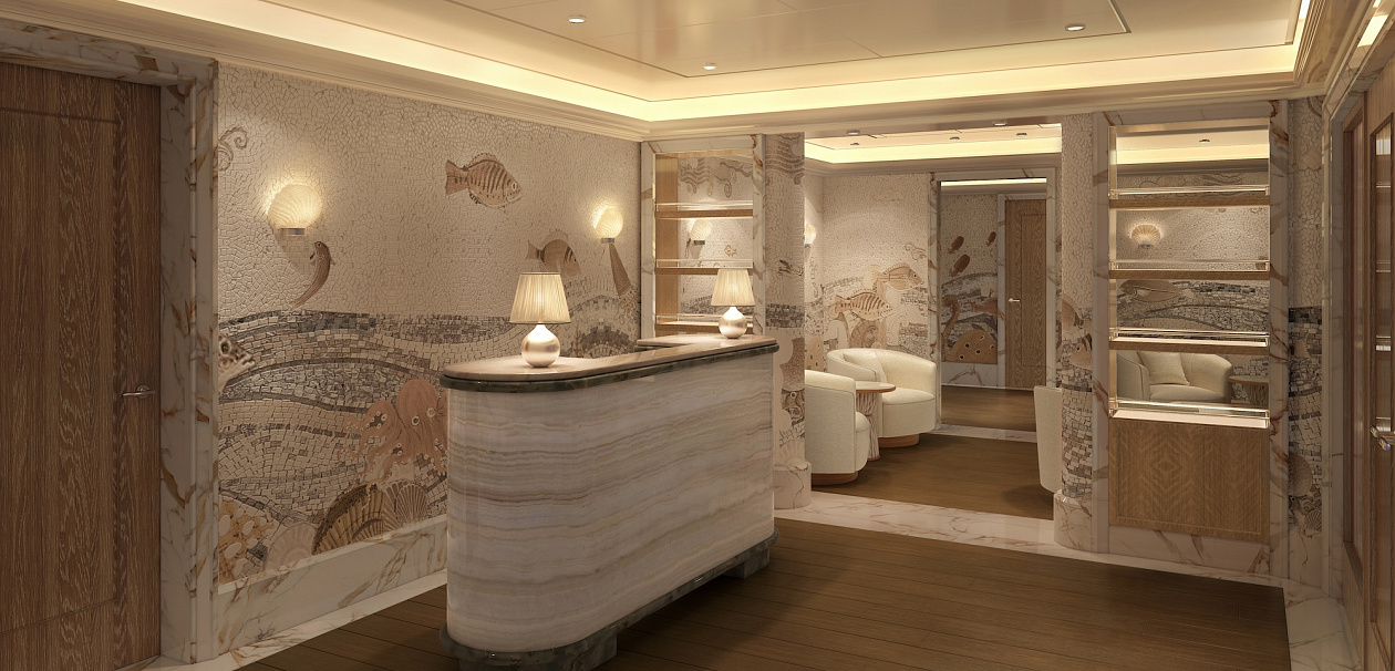 Главный шедевр — четырехуровневый пентхаус Funnel Suite: почти тысяча квадратных метров, изогнутые панорамные окна с обзором на 280°, собственный бассейн и отдельная зона для spa-процедур. Пространство рассчитано всего на шестерых гостей и станет одним из самых больших сьютов в истории морских путешествий.