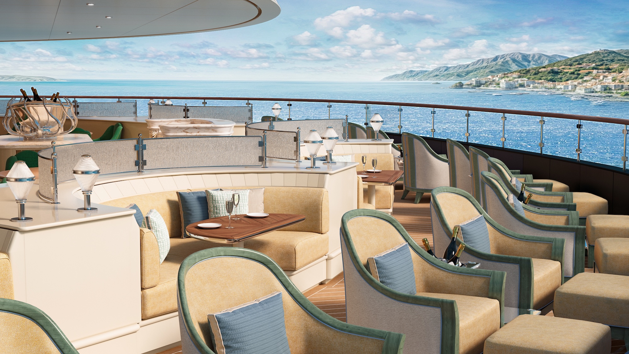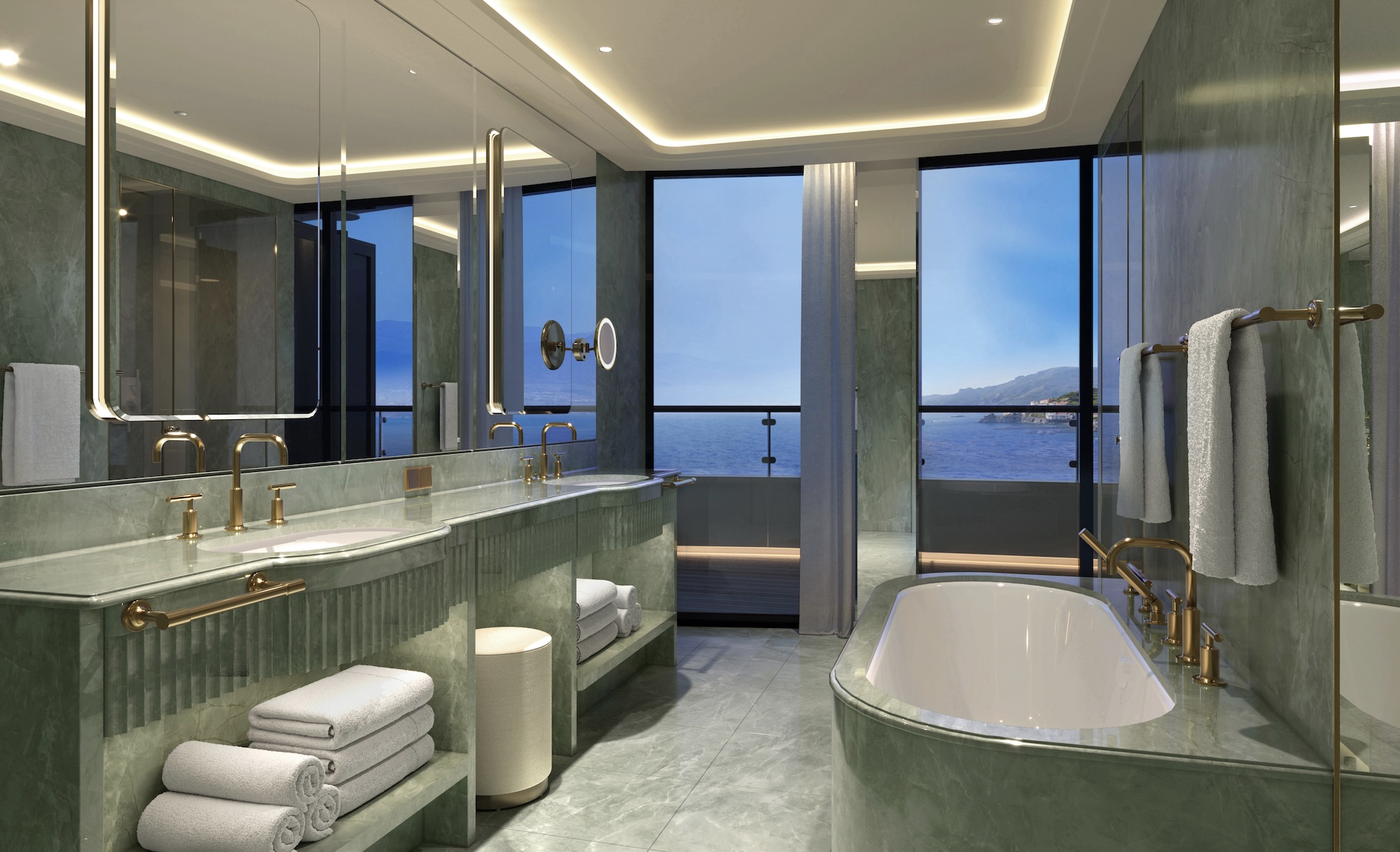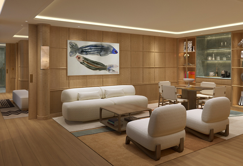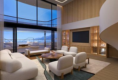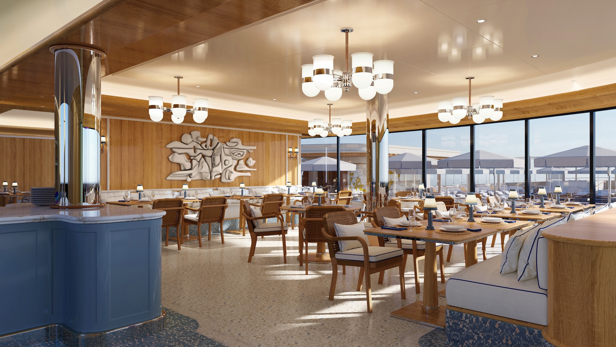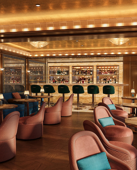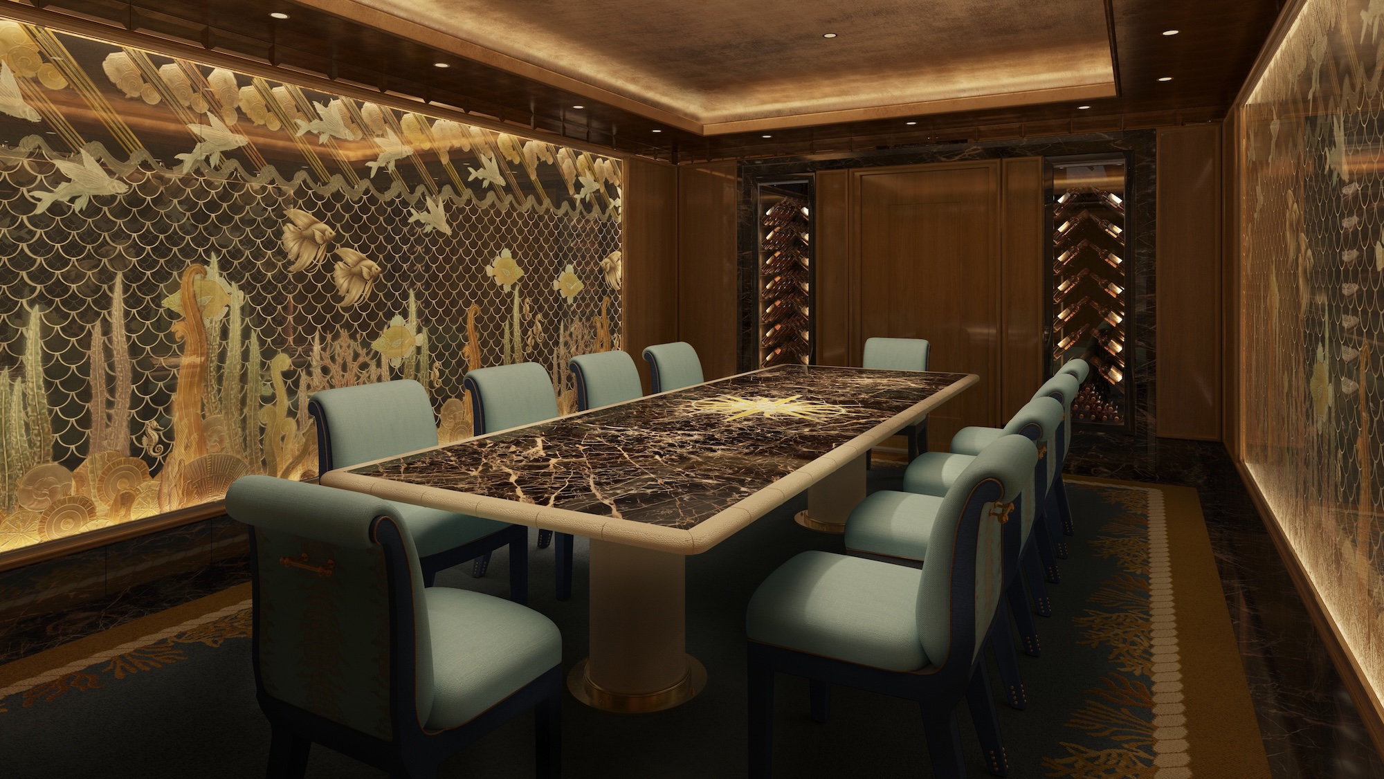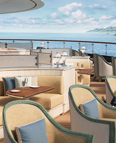 Главный шедевр — четырехуровневый пентхаус Funnel Suite: почти тысяча квадратных метров, изогнутые панорамные окна с обзором на 280°, собственный бассейн и отдельная зона для spa-процедур. Пространство рассчитано всего на шестерых гостей и станет одним из самых больших сьютов в истории морских путешествий.