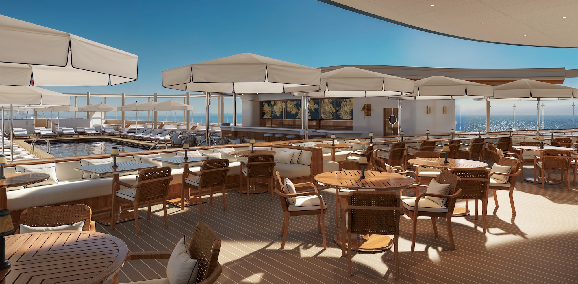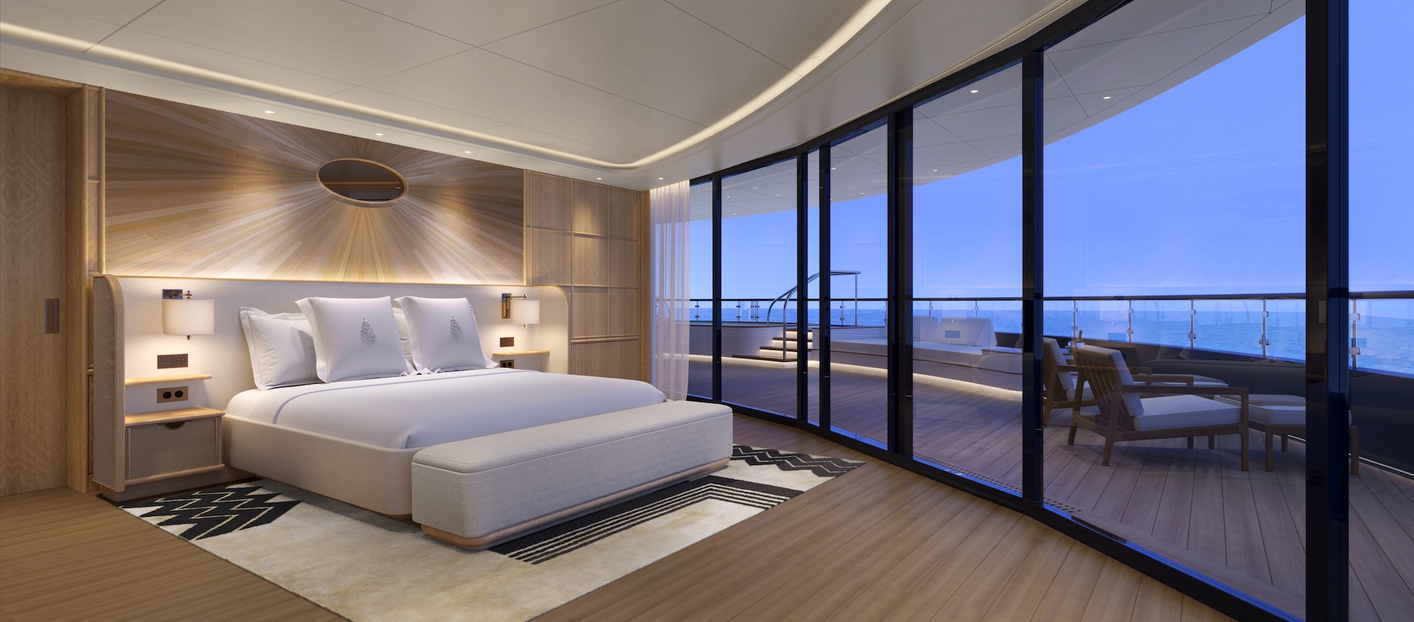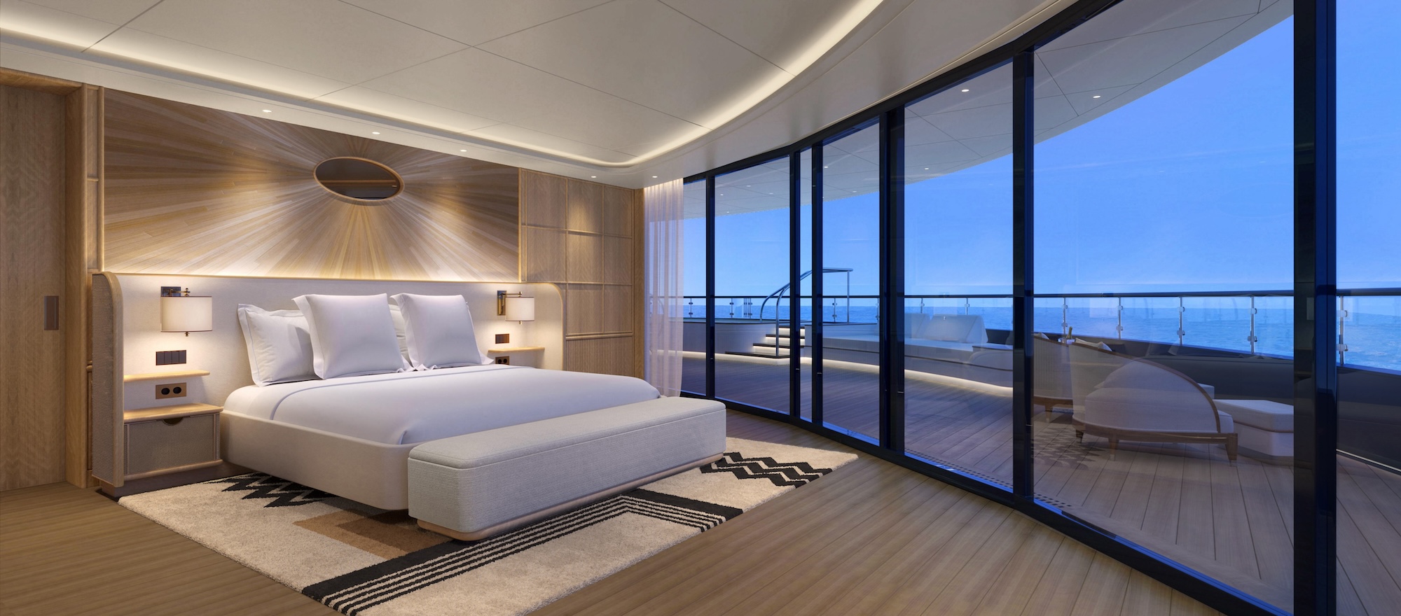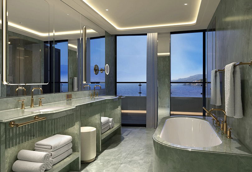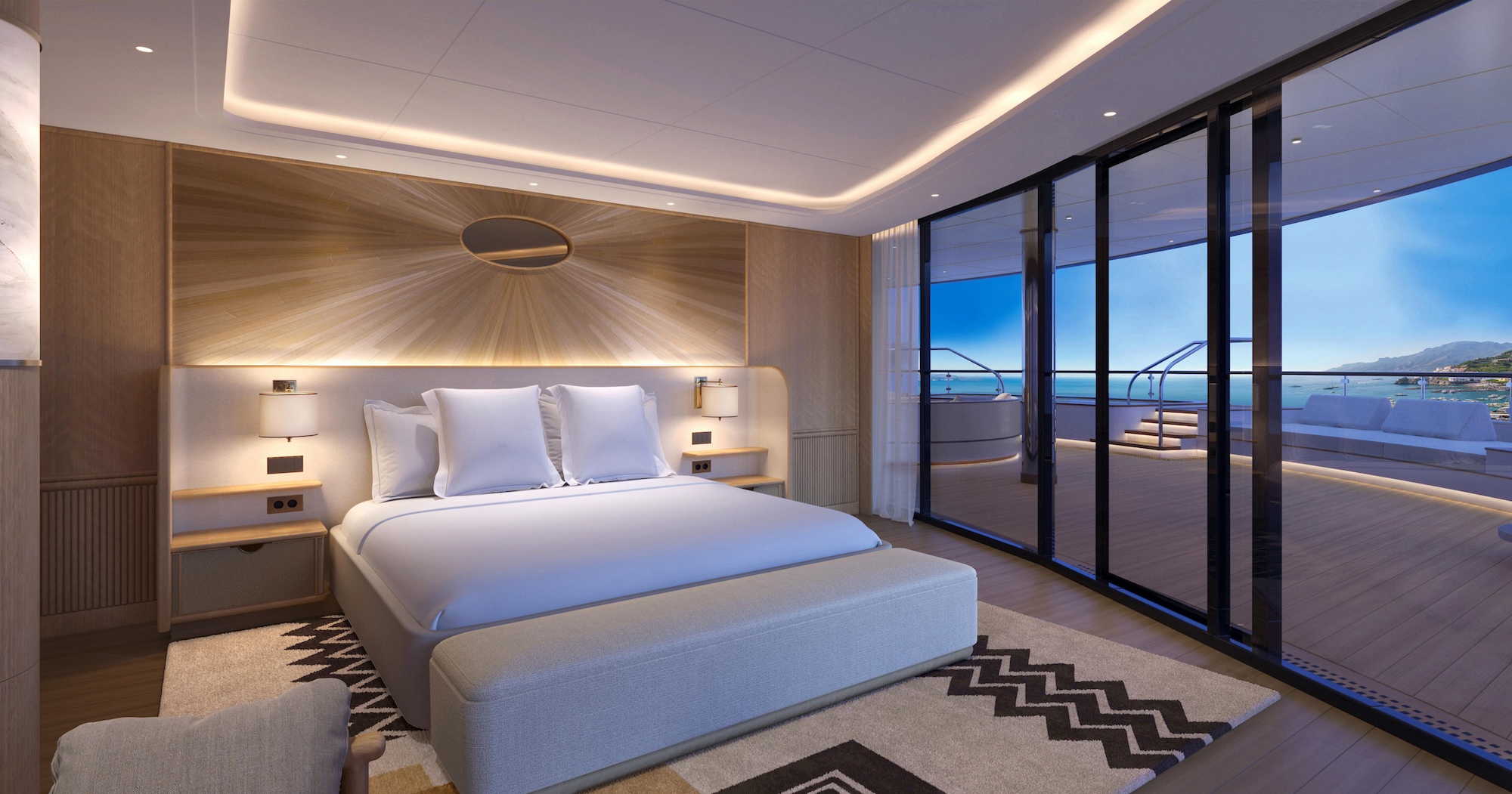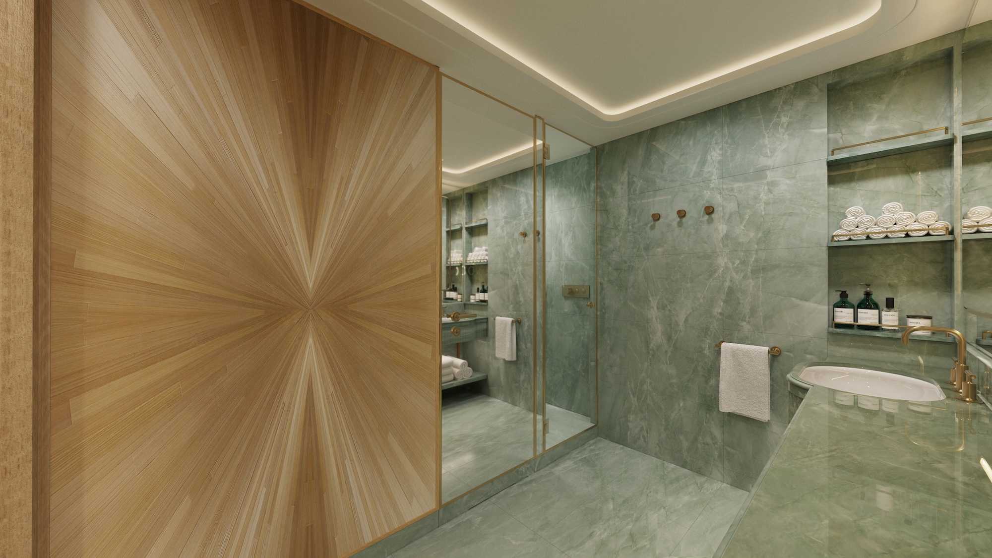 Главный шедевр — четырехуровневый пентхаус Funnel Suite: почти тысяча квадратных метров, изогнутые панорамные окна с обзором на 280°, собственный бассейн и отдельная зона для spa-процедур. Пространство рассчитано всего на шестерых гостей и станет одним из самых больших сьютов в истории морских путешествий.