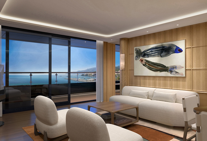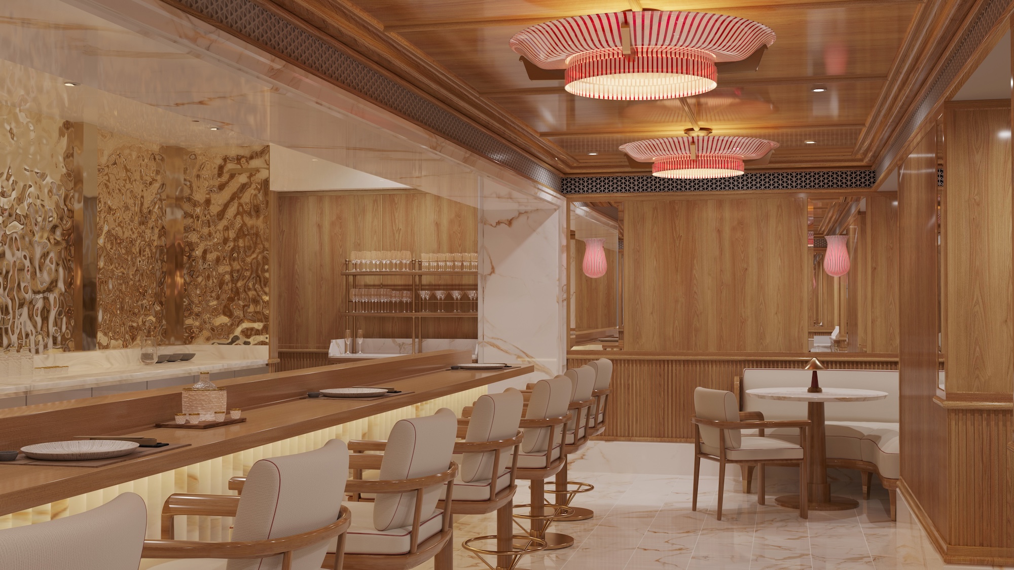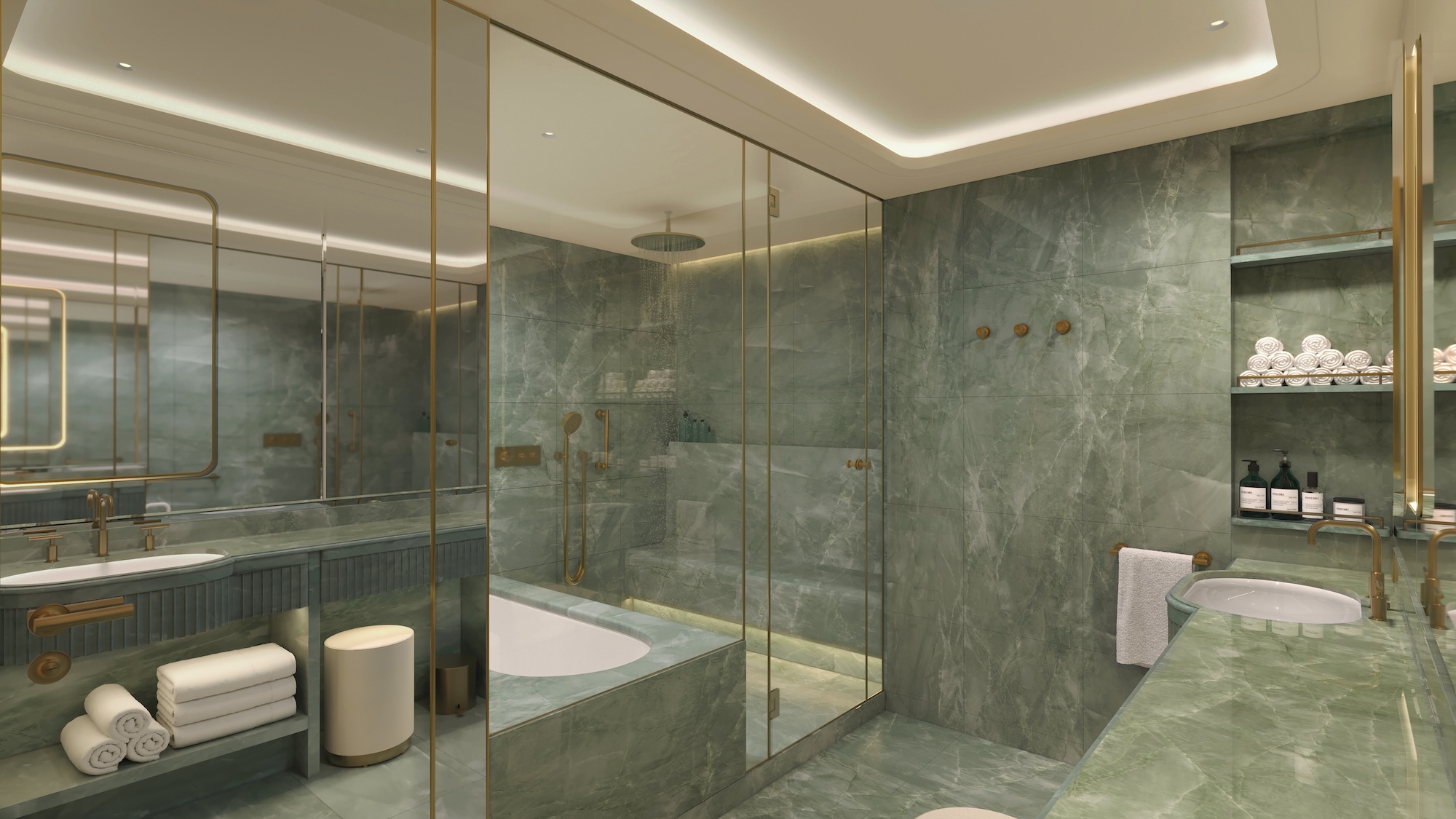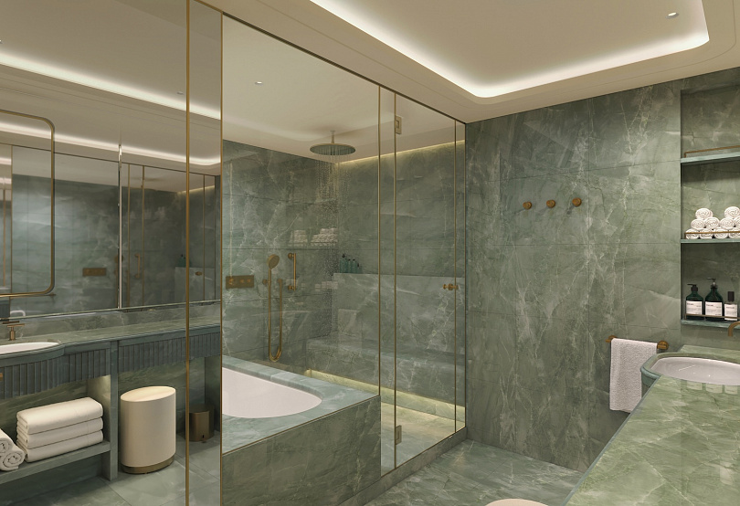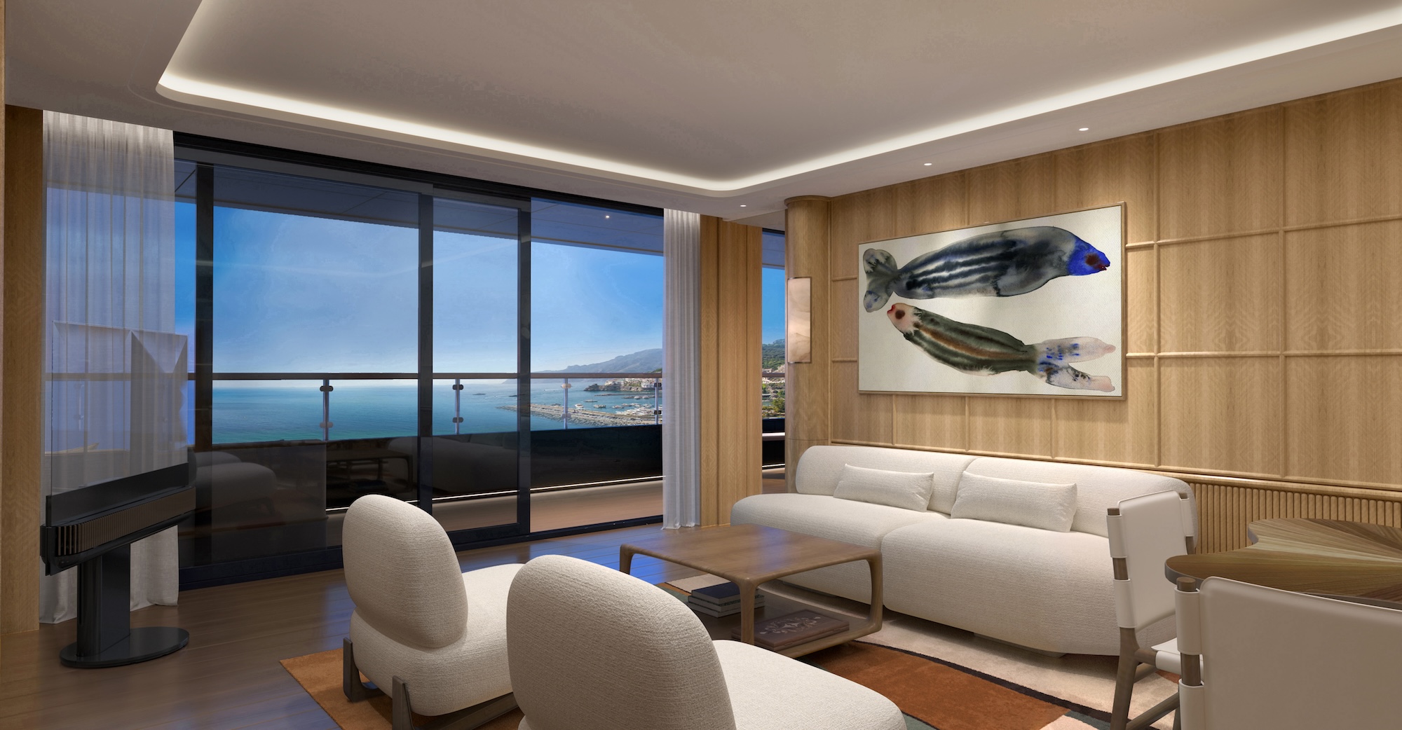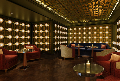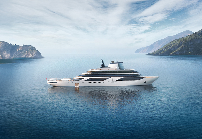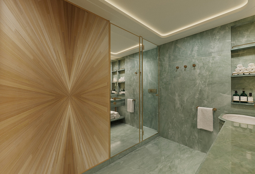 Главный шедевр — четырехуровневый пентхаус Funnel Suite: почти тысяча квадратных метров, изогнутые панорамные окна с обзором на 280°, собственный бассейн и отдельная зона для spa-процедур. Пространство рассчитано всего на шестерых гостей и станет одним из самых больших сьютов в истории морских путешествий.