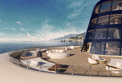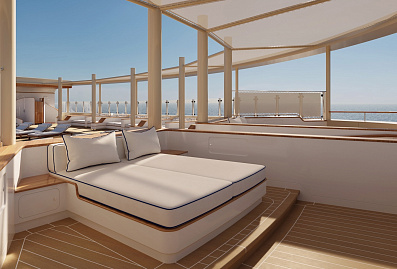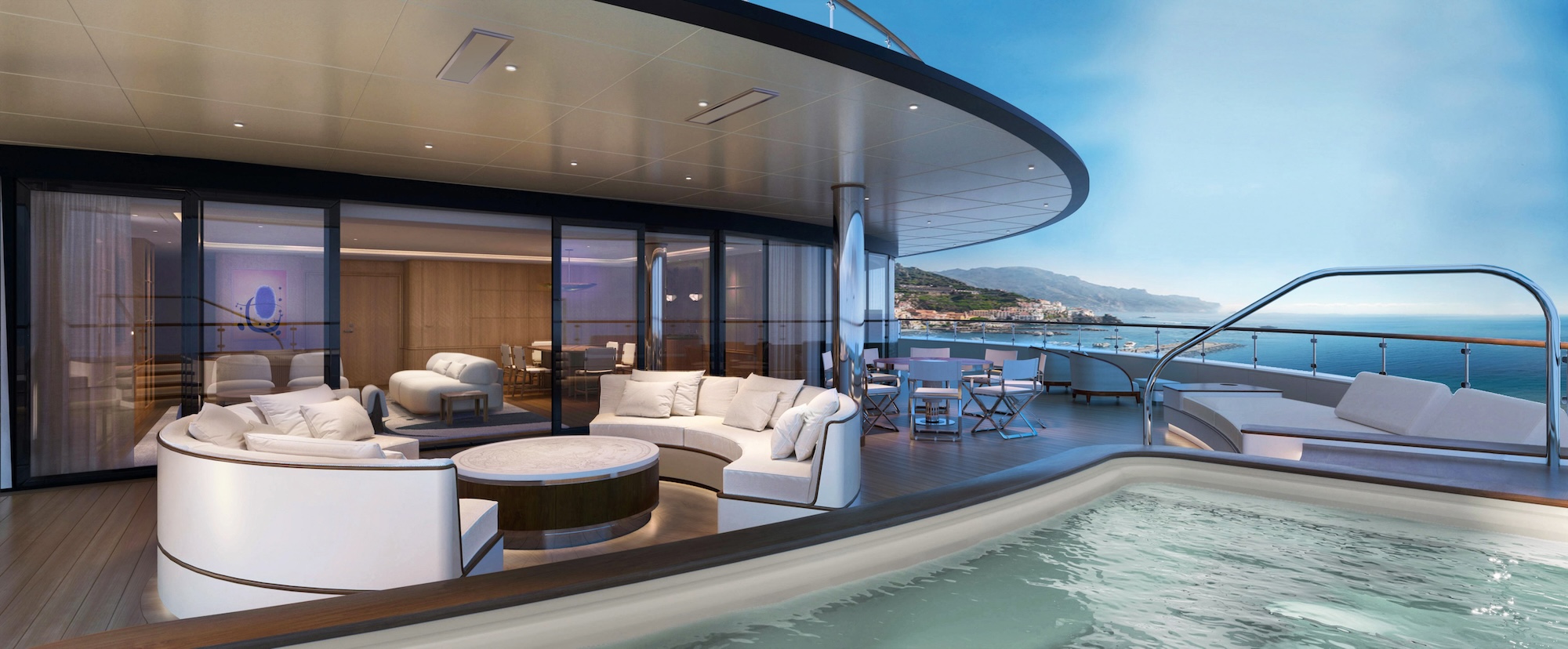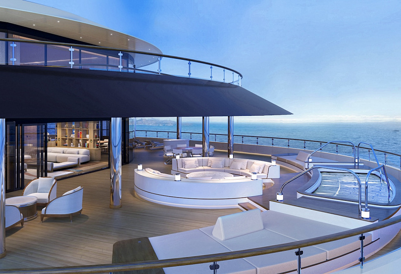 Терраса с водными видами спорта, бассейном и лаунж-зона для тех, кто хочет быть ближе к морю не покидая яхты.