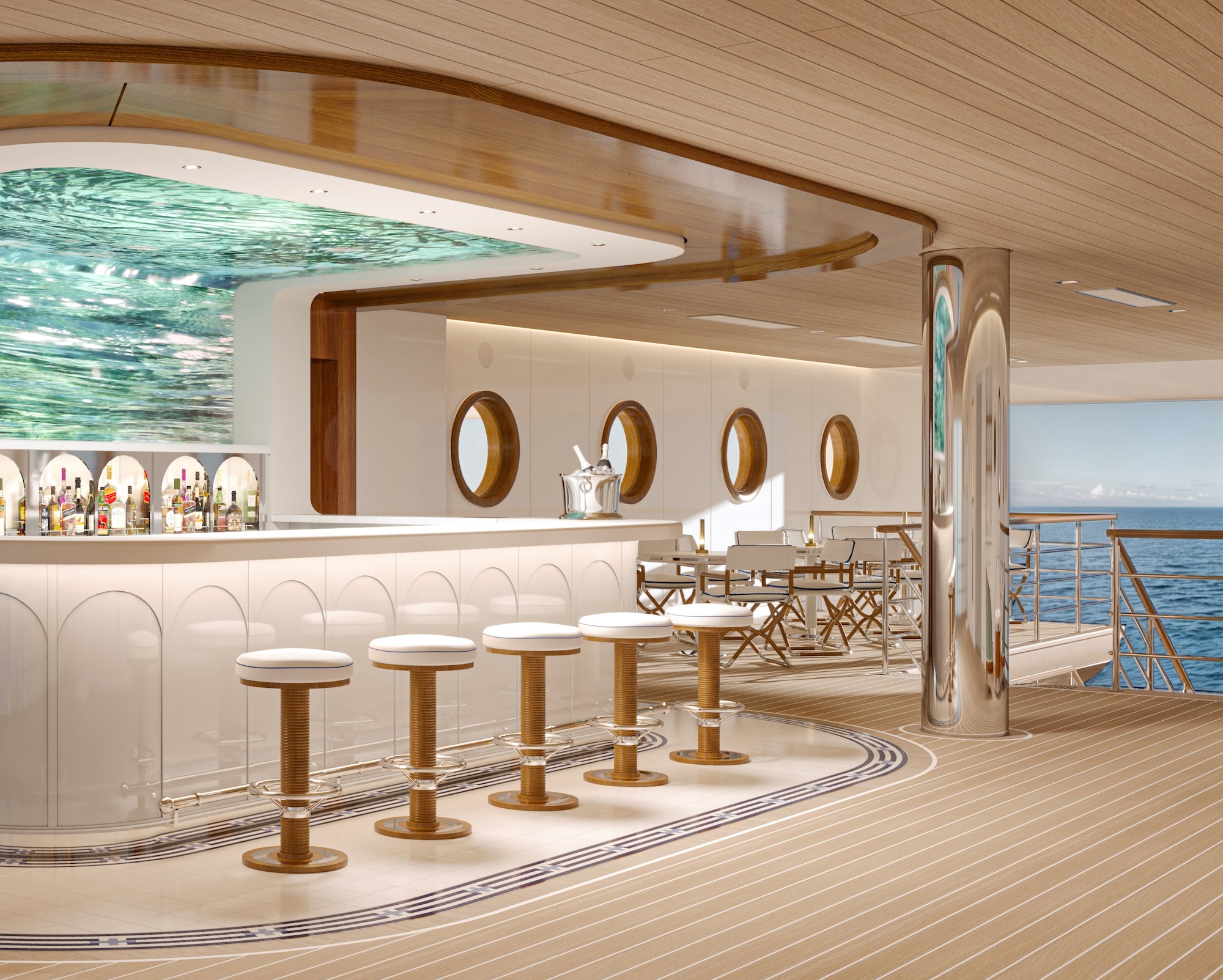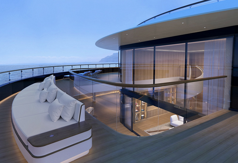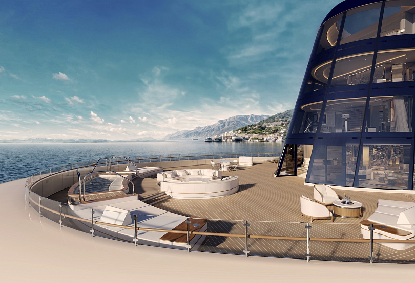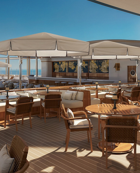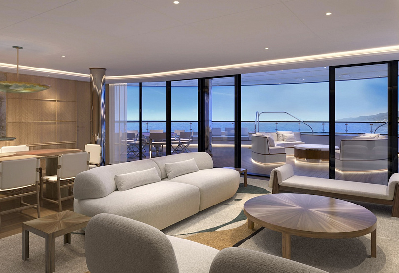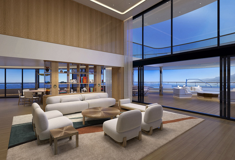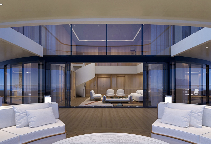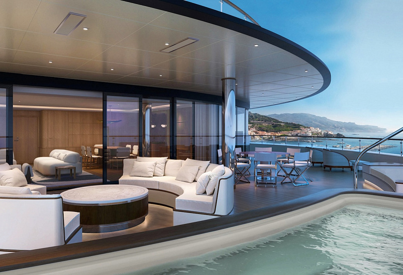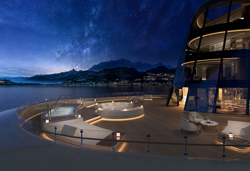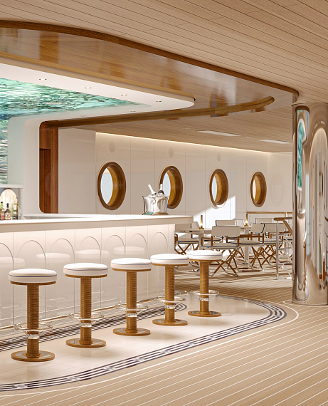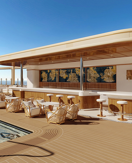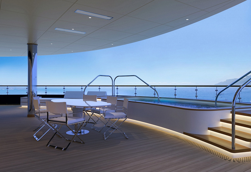 В центре внимания — бассейн длиной 20 метров, вдохновленный легендарной яхтой Аристотеля Онассиса Christina O: его можно быстро наполнить морской водой или осушить, а дно поднять на уровень палубы — тогда бассейн за минуту превращается в площадку для вечеринки под открытым небом.