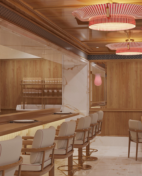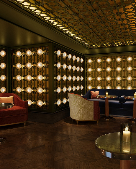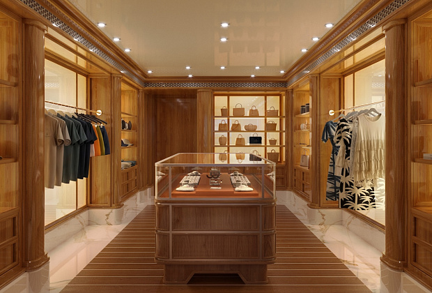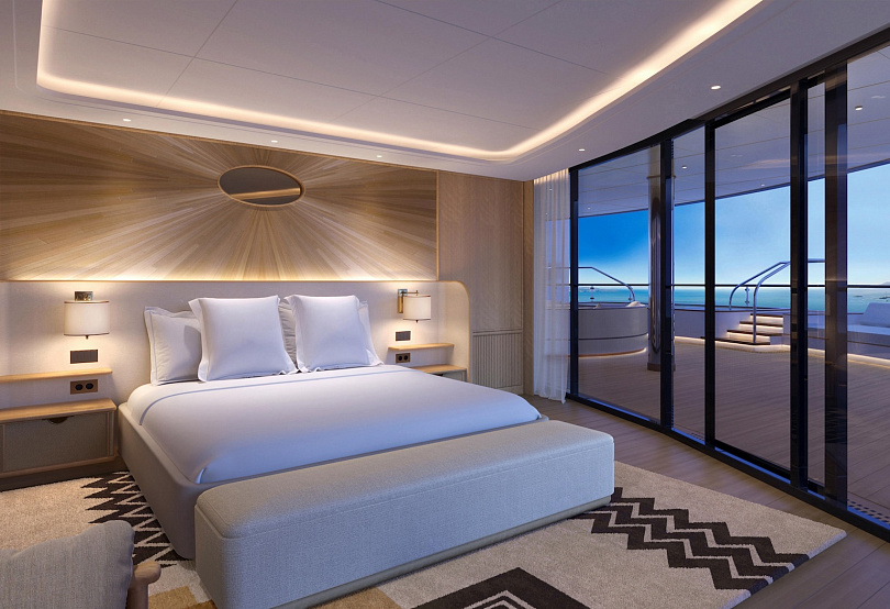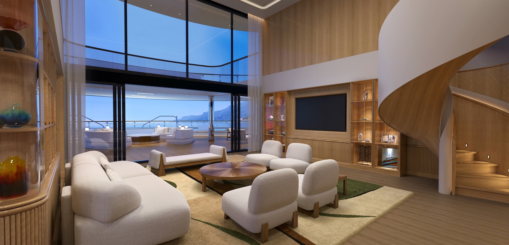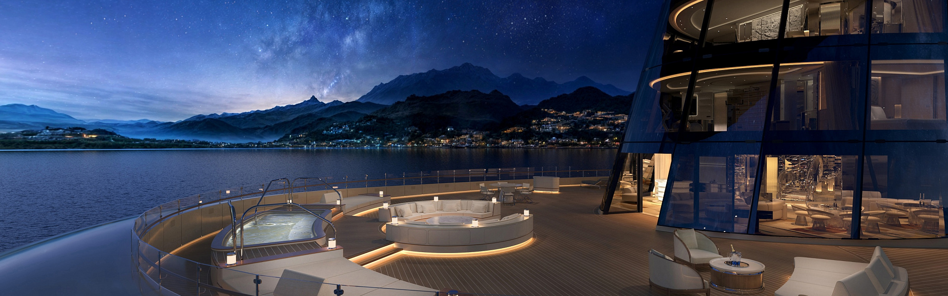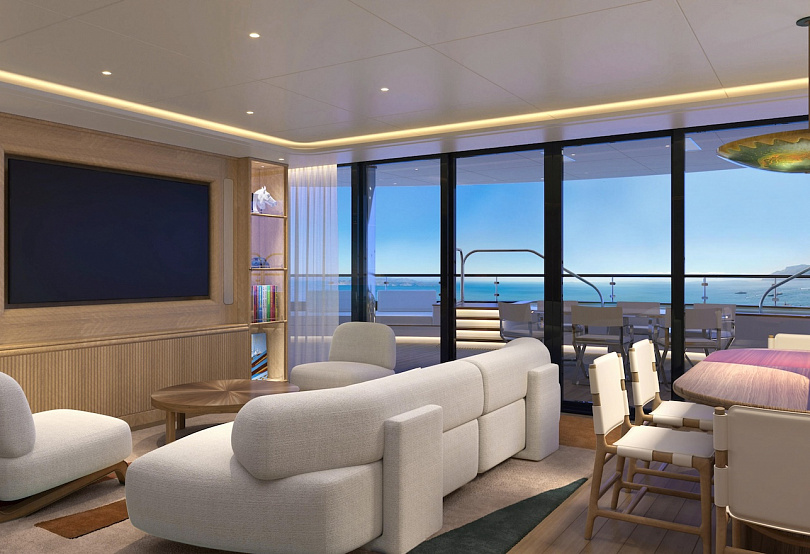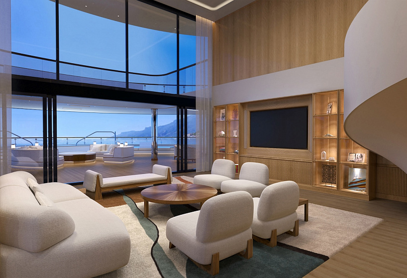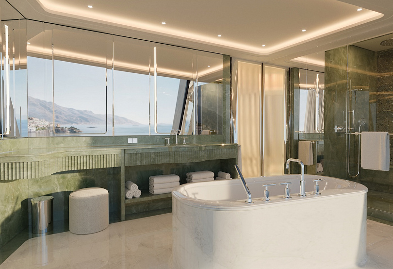 В центре внимания — бассейн длиной 20 метров, вдохновленный легендарной яхтой Аристотеля Онассиса Christina O: его можно быстро наполнить морской водой или осушить, а дно поднять на уровень палубы — тогда бассейн за минуту превращается в площадку для вечеринки под открытым небом.