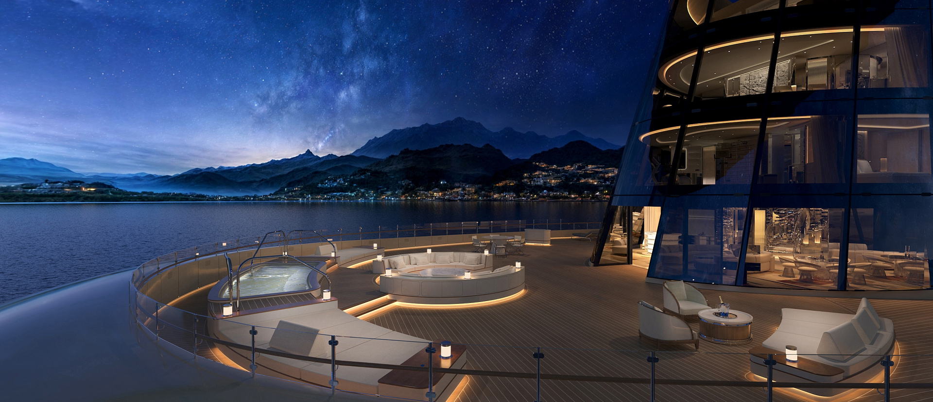 Номер с тремя мастер-спальнями с кроватями king-size. Терраса 457 м² с бассейном, лаунж-зонами и обеденным столом. Гостиная, столовая и тренажерный зал в номере и на открытом воздухе. В номере есть полноценная кухня с отдельными входом для персонала. Доступ к отдельному лифту и лестницам, соединяющим палубы.