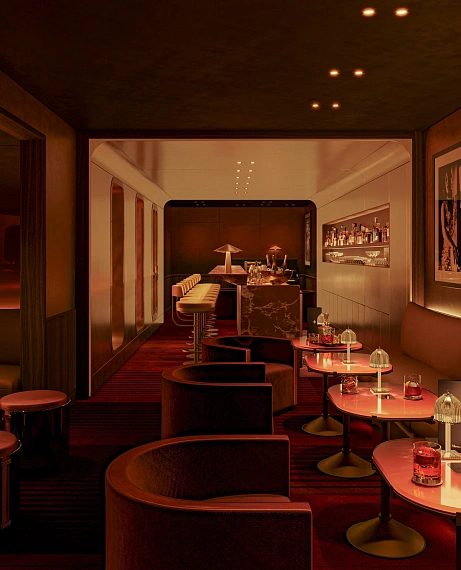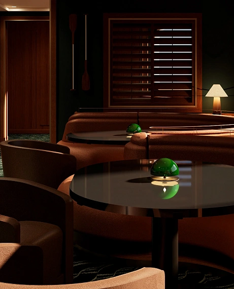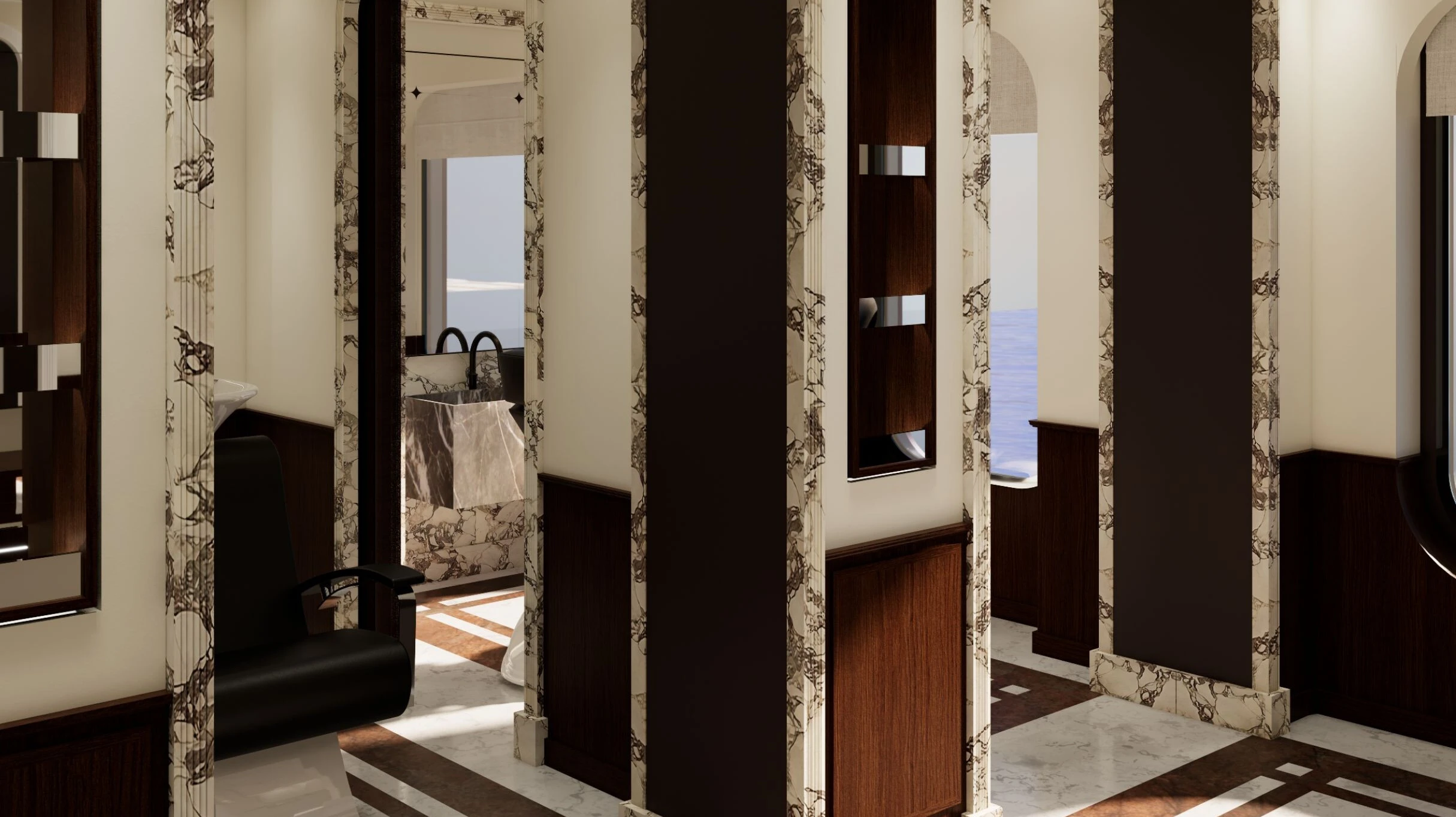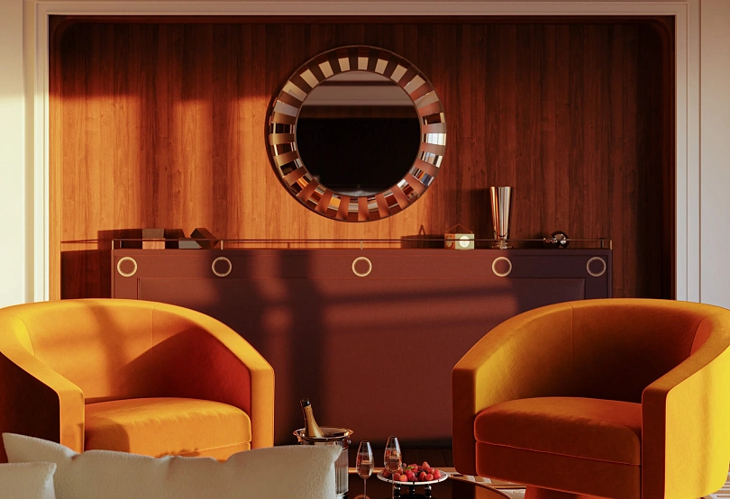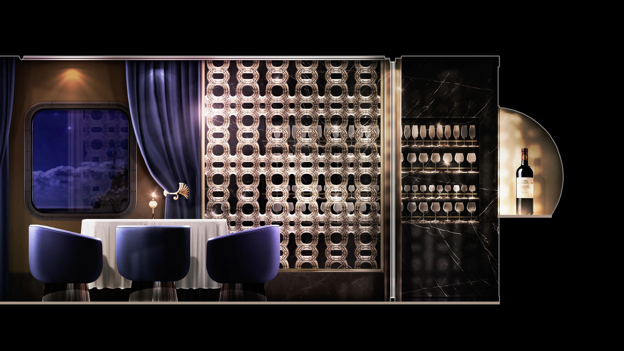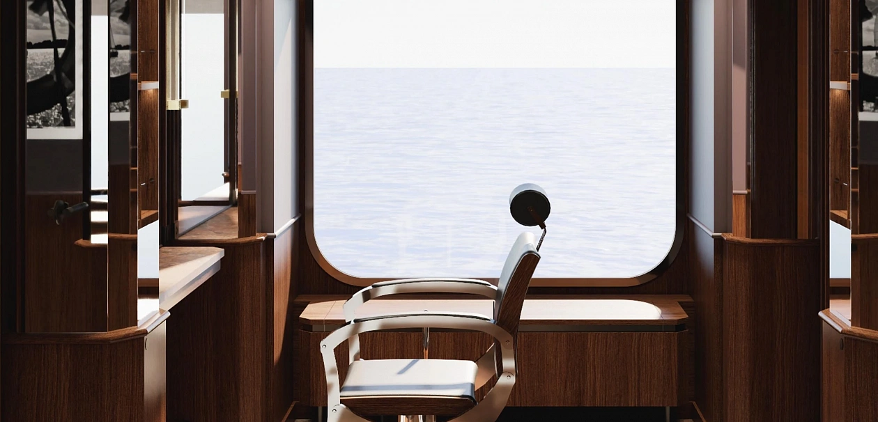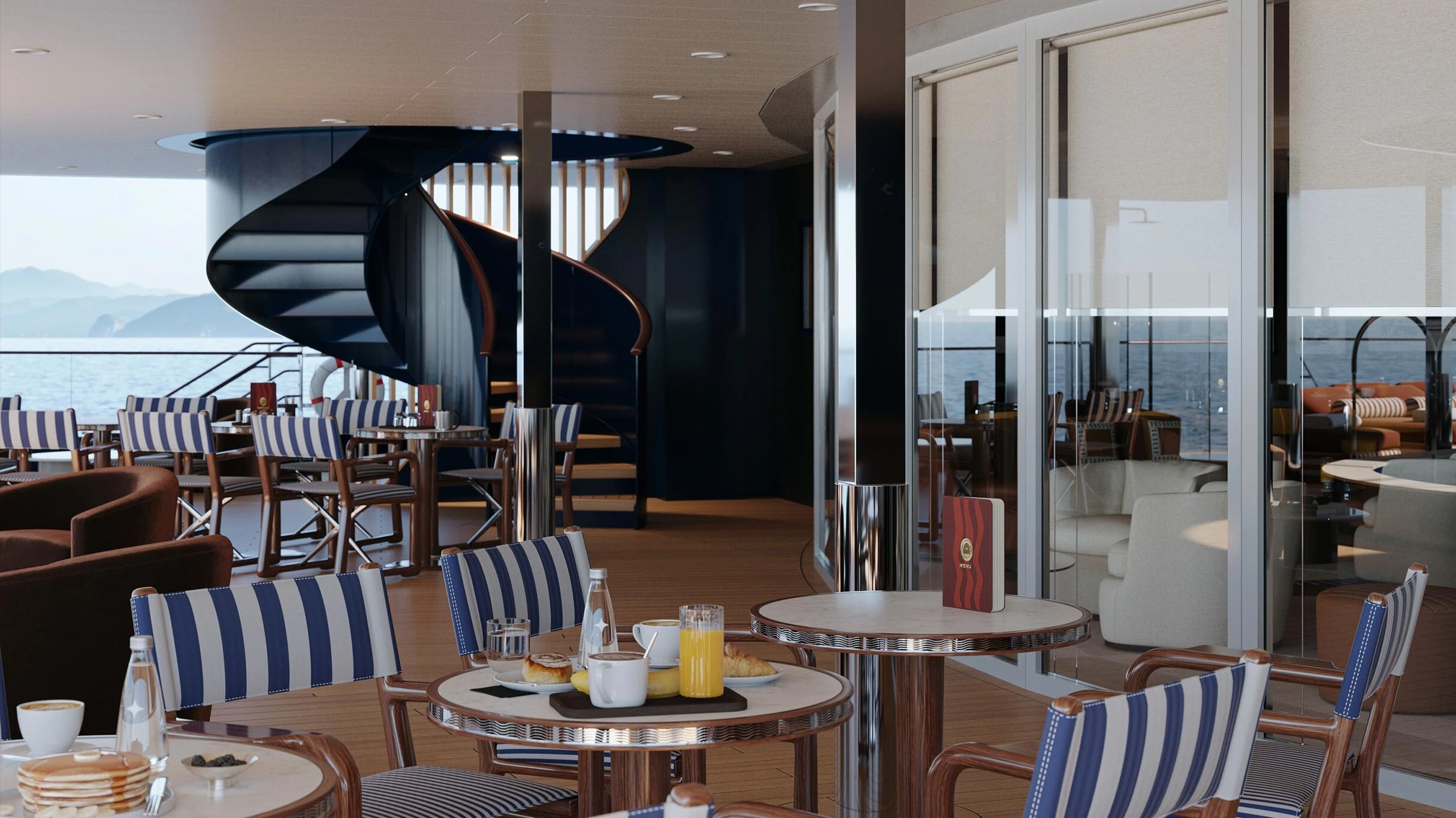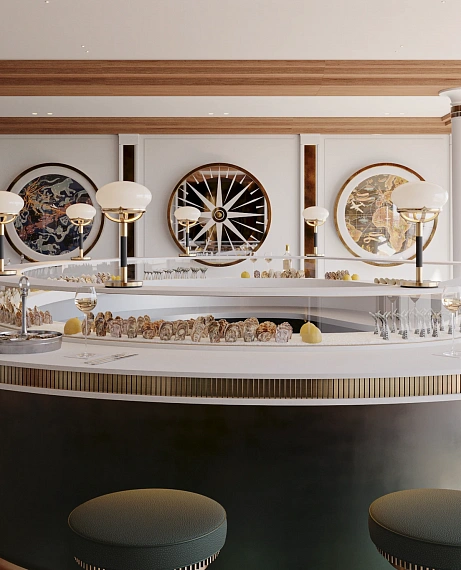 Интерьеры созданы архитектором Максимом д’Анжаком: это ар-деко в его современной интерпретации. Атмосфера вдохновлена Французской Ривьерой 1920–30-х годов, когда Монте-Карло, Сен-Тропе и Кап д’Антиб были пристанищем писателей, художников, актеров и принцесс — тот же легкий блеск беззаботности и joie de vivre, только теперь не на берегу, а под парусами.