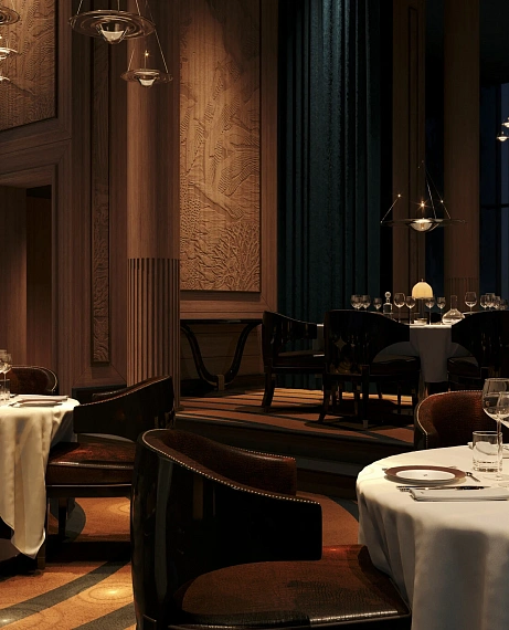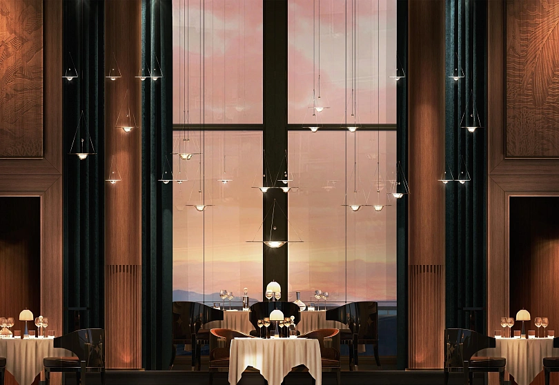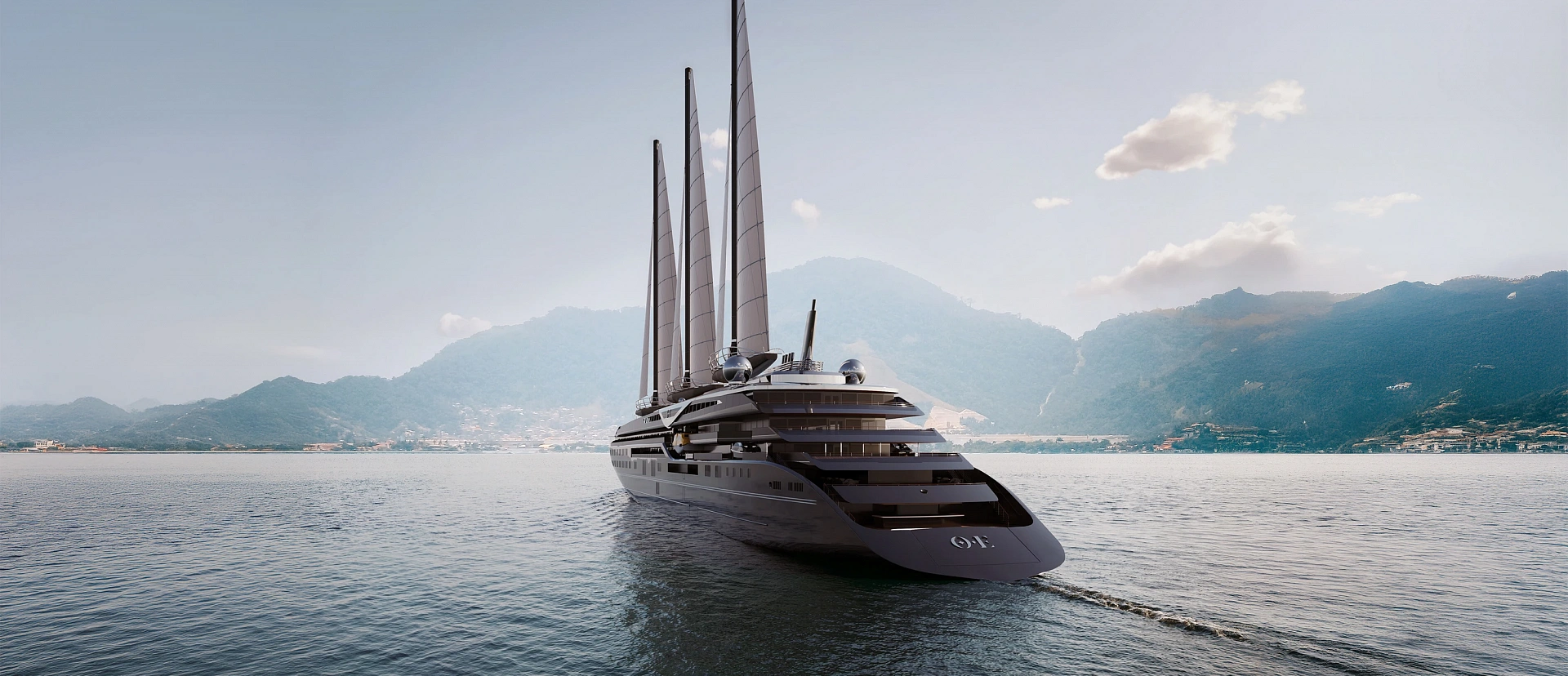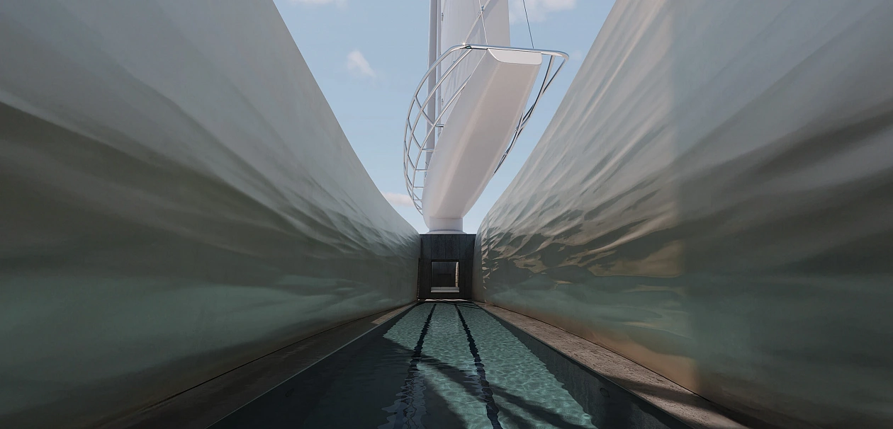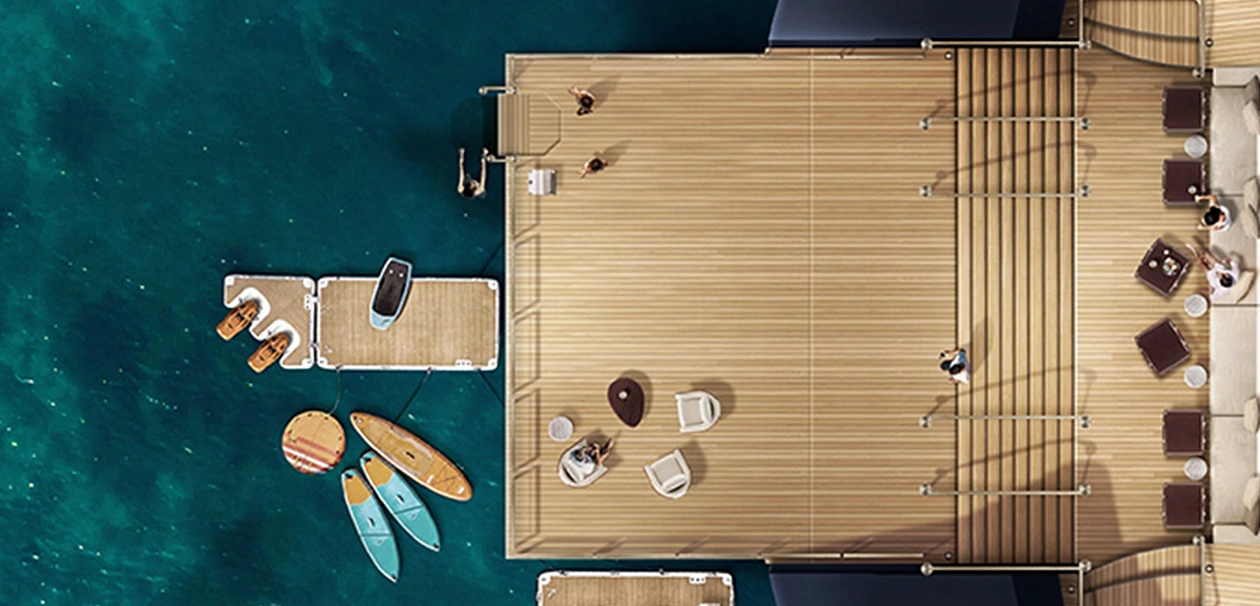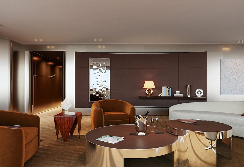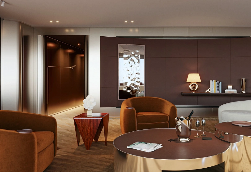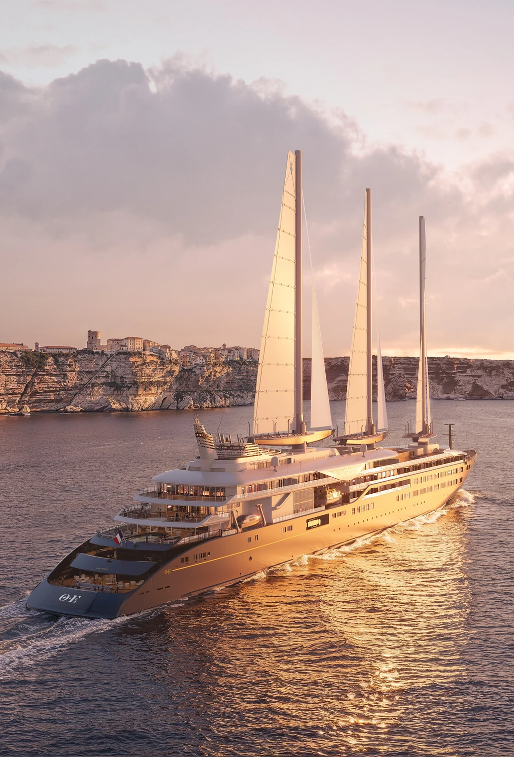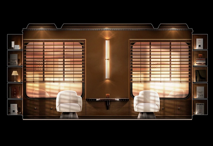 Интерьеры созданы архитектором Максимом д’Анжаком: это ар-деко в его современной интерпретации. Атмосфера вдохновлена Французской Ривьерой 1920–30-х годов, когда Монте-Карло, Сен-Тропе и Кап д’Антиб были пристанищем писателей, художников, актеров и принцесс — тот же легкий блеск беззаботности и joie de vivre, только теперь не на берегу, а под парусами.
