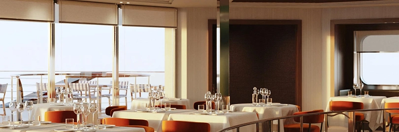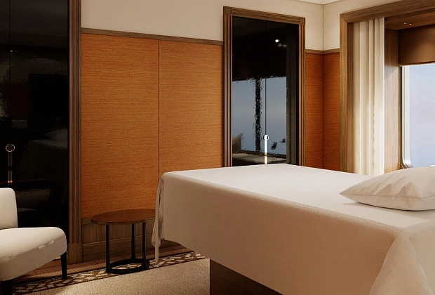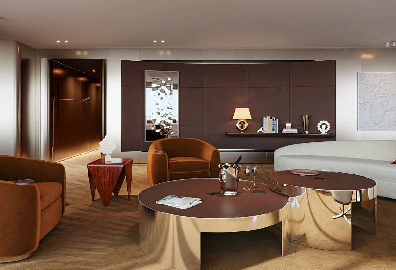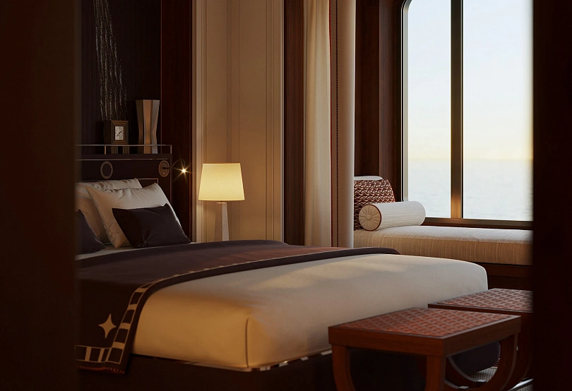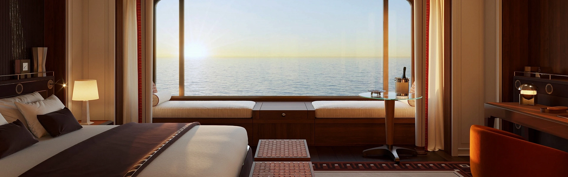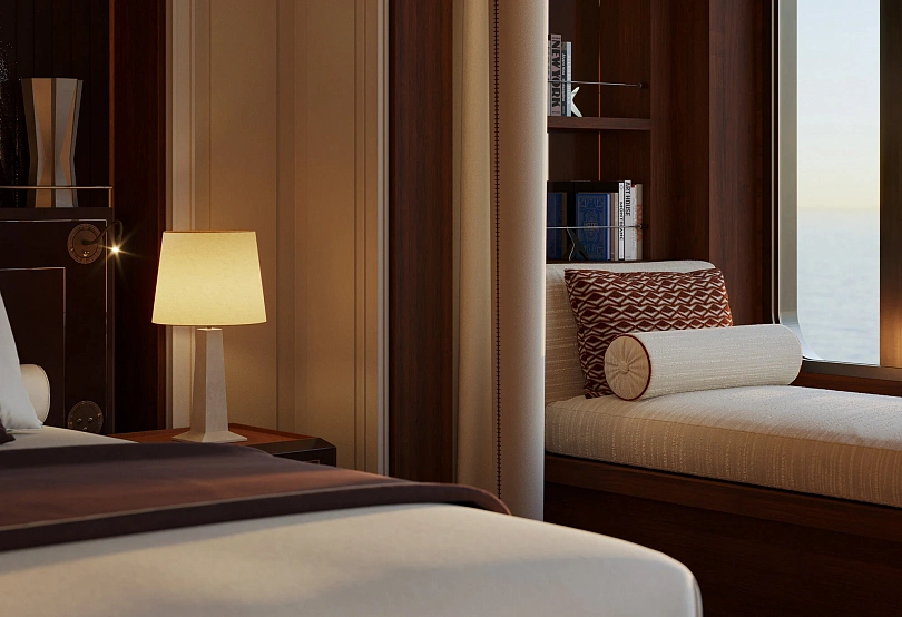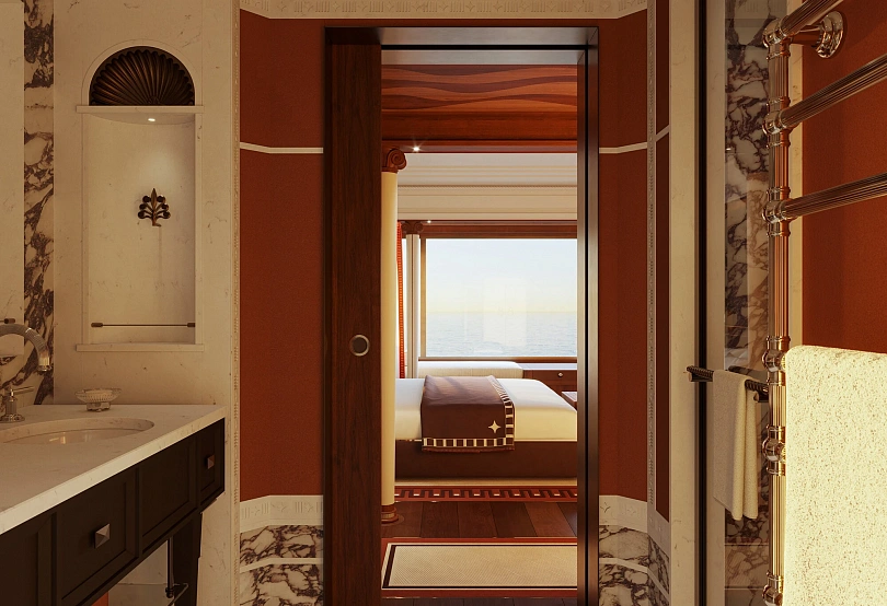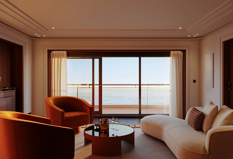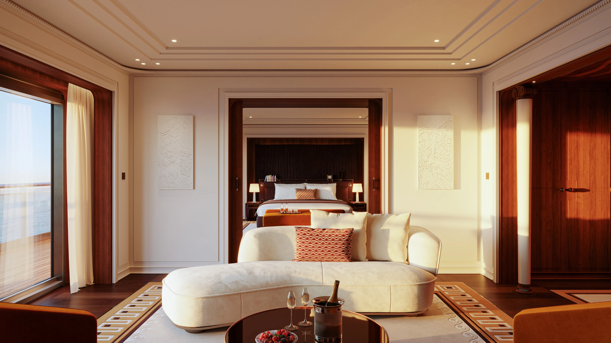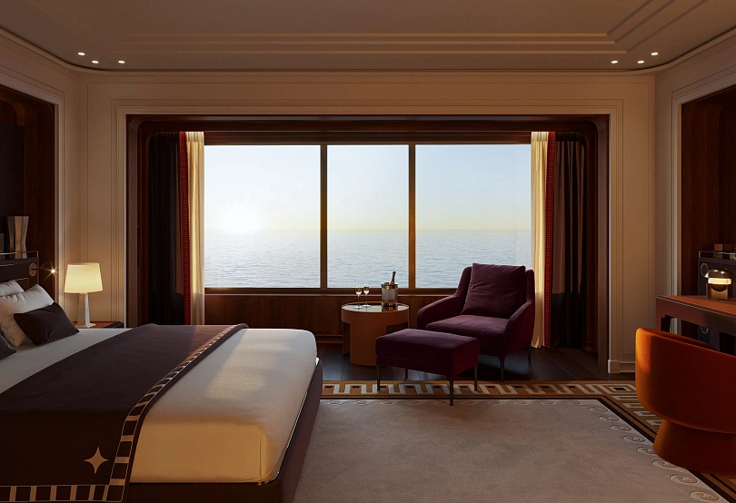 На борту — всего 54 люкса для 120 гостей, каждый площадью около 70 м². Венец коллекции — Президентский сьют площадью 1415 м² с террасой 530 м² — один из самых больших в истории. Помимо него: два бассейна, включая спортивный, два ресторана, спикизи-бар, амфитеатр-кабаре и даже студия звукозаписи — для тех, кто хочет увезти с собой собственный саундтрек путешествия.