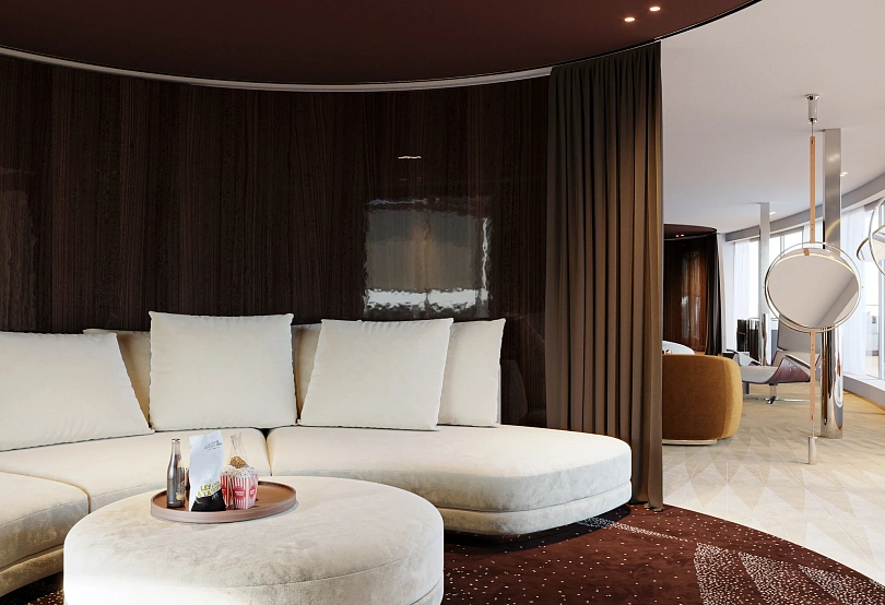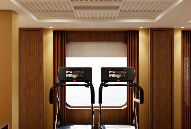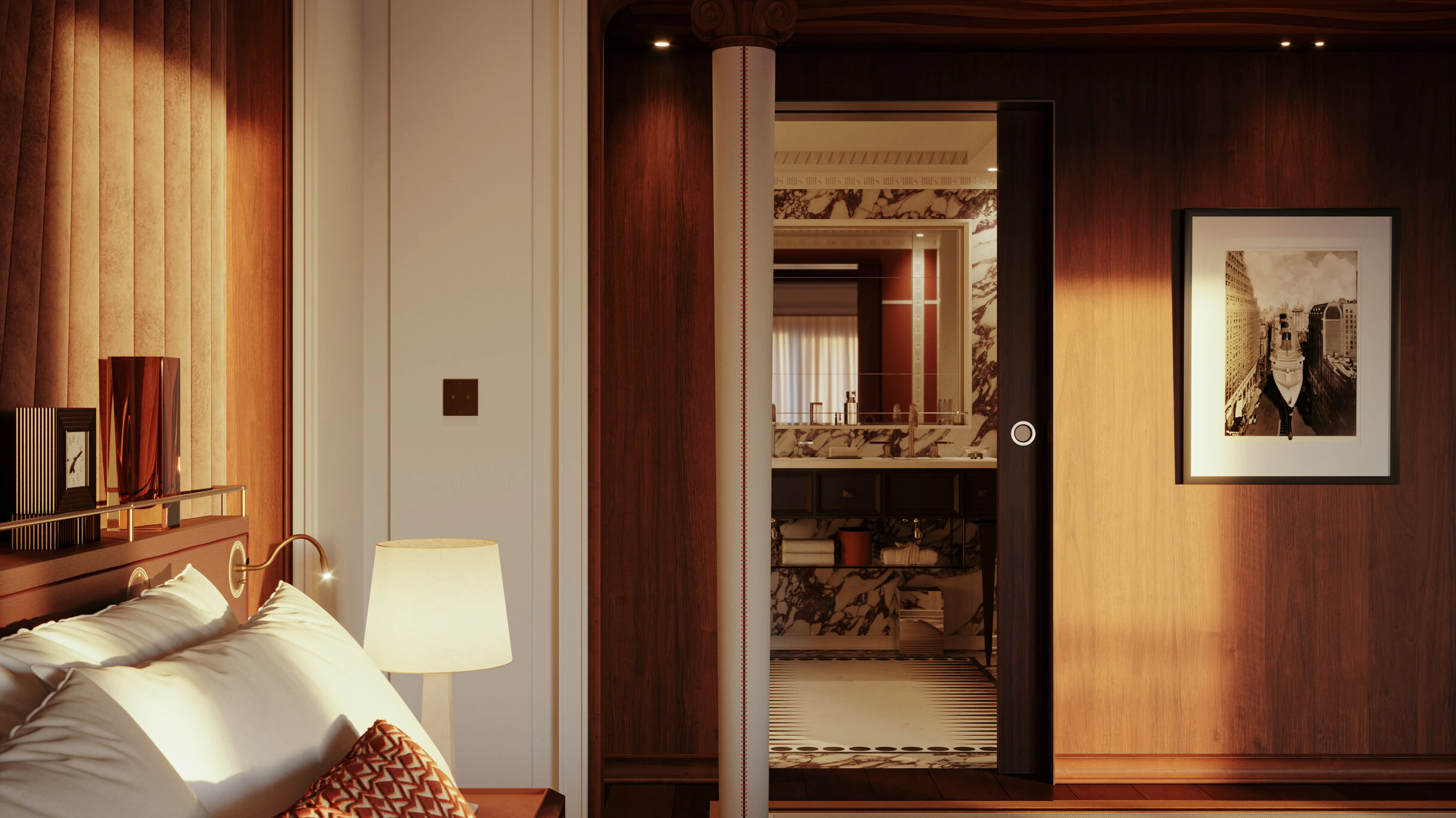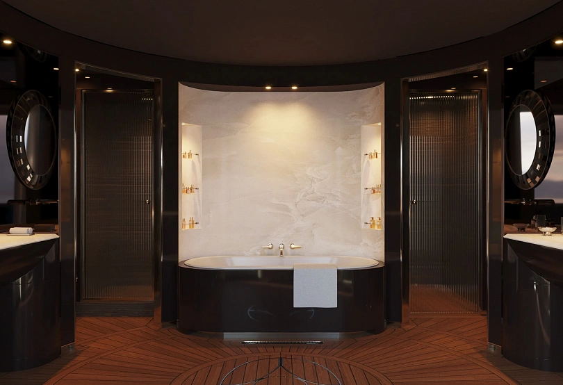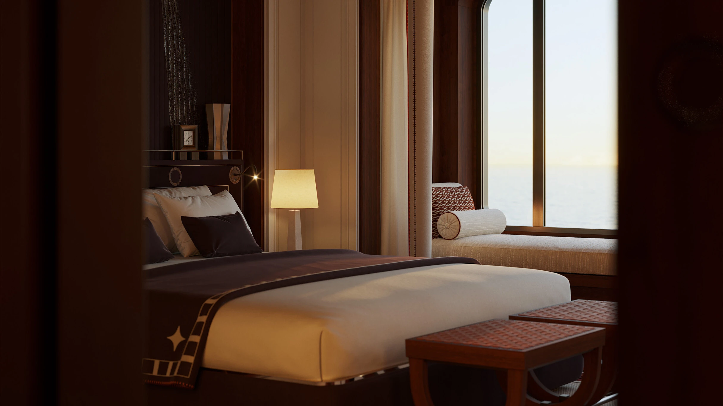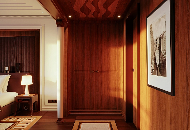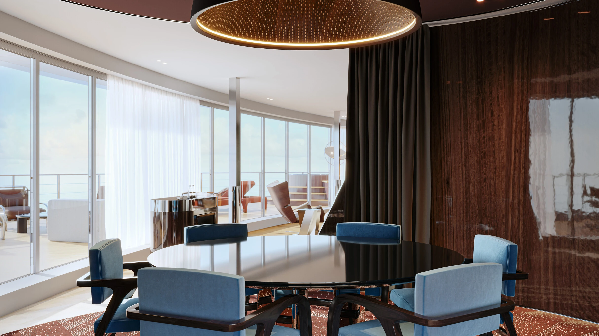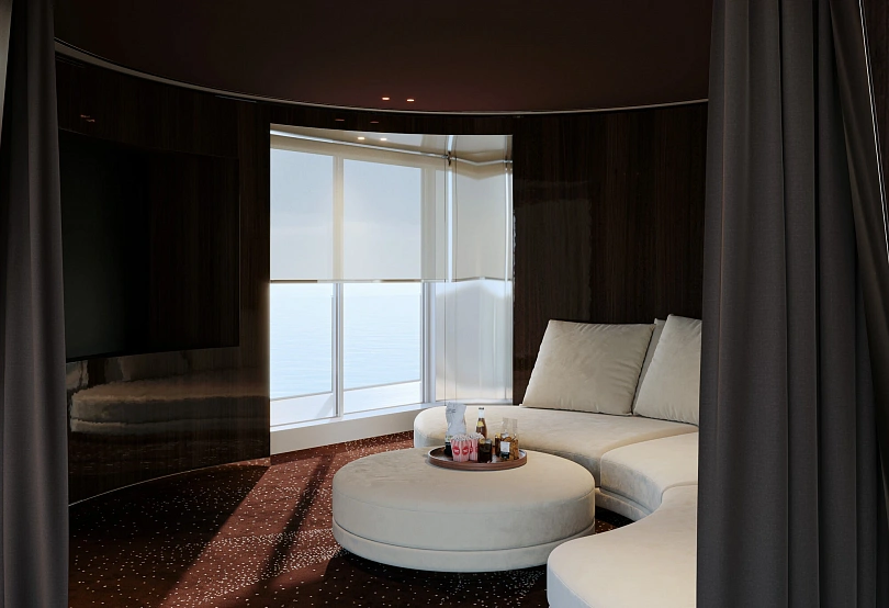 На борту — всего 54 люкса для 120 гостей, каждый площадью около 70 м². Венец коллекции — Президентский сьют площадью 1415 м² с террасой 530 м² — один из самых больших в истории. Помимо него: два бассейна, включая спортивный, два ресторана, спикизи-бар, амфитеатр-кабаре и даже студия звукозаписи — для тех, кто хочет увезти с собой собственный саундтрек путешествия.