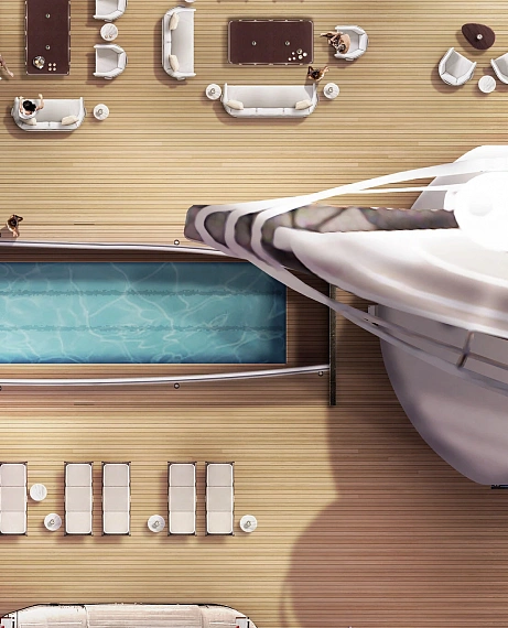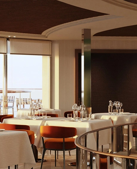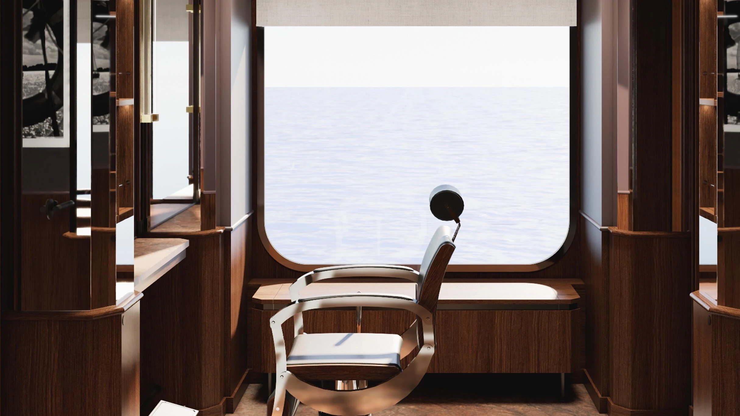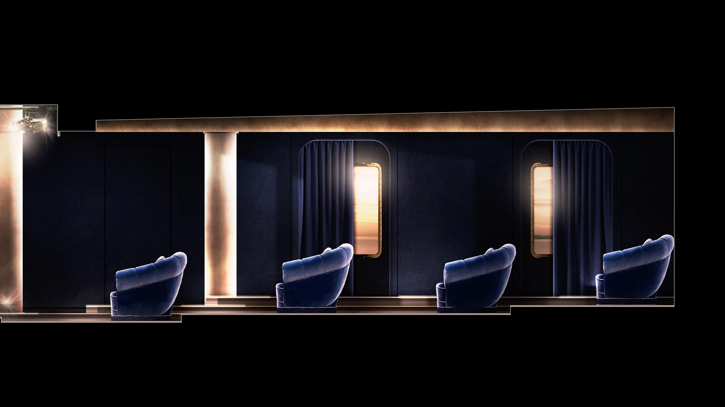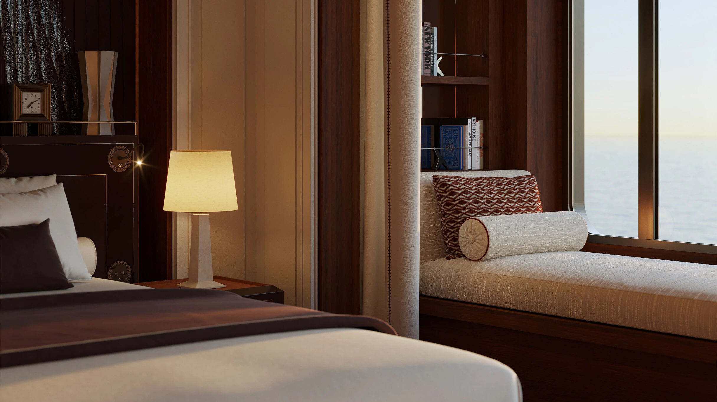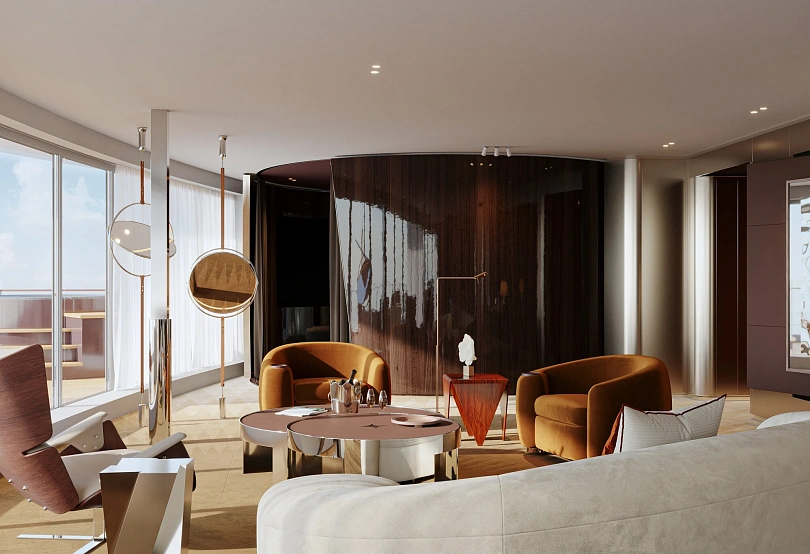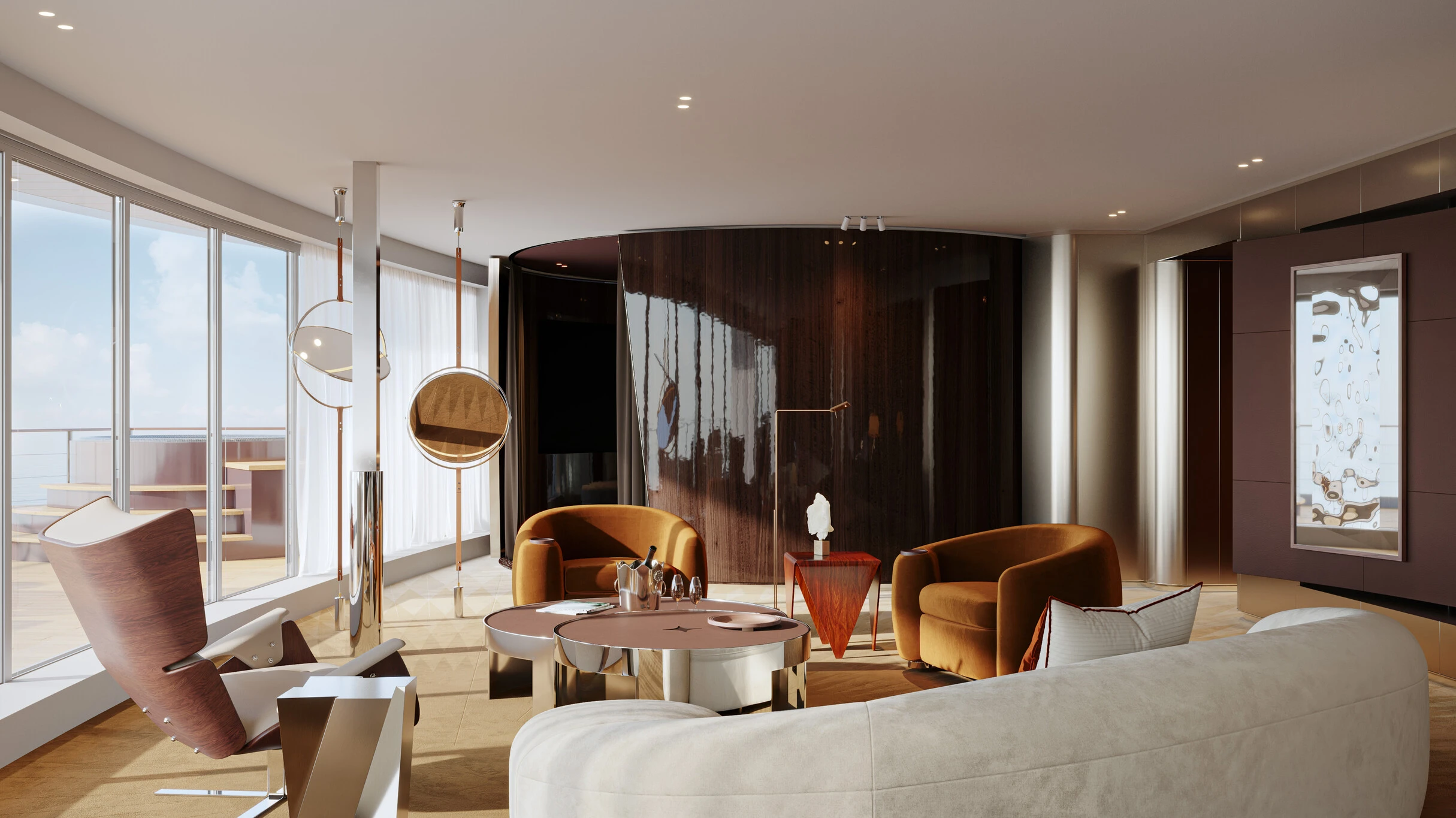 На борту — всего 54 люкса для 120 гостей, каждый площадью около 70 м². Венец коллекции — Президентский сьют площадью 1415 м² с террасой 530 м² — один из самых больших в истории. Помимо него: два бассейна, включая спортивный, два ресторана, спикизи-бар, амфитеатр-кабаре и даже студия звукозаписи — для тех, кто хочет увезти с собой собственный саундтрек путешествия.