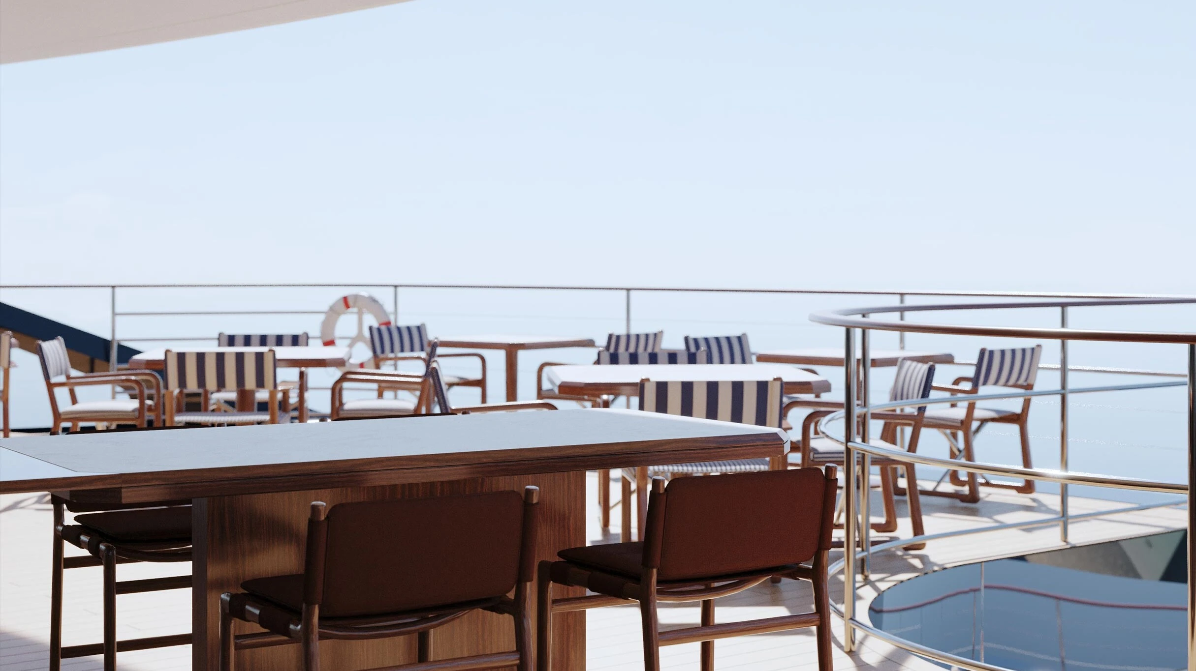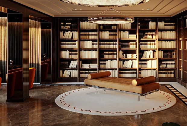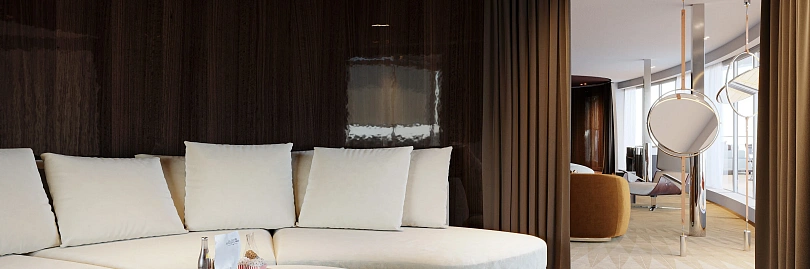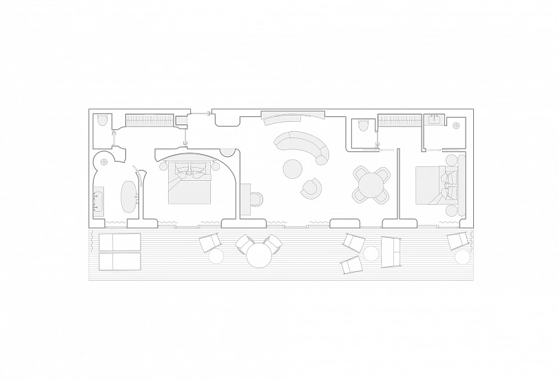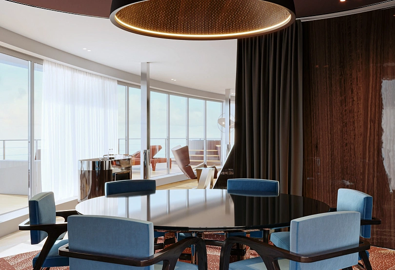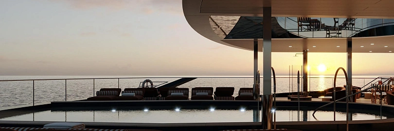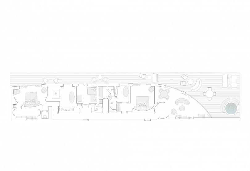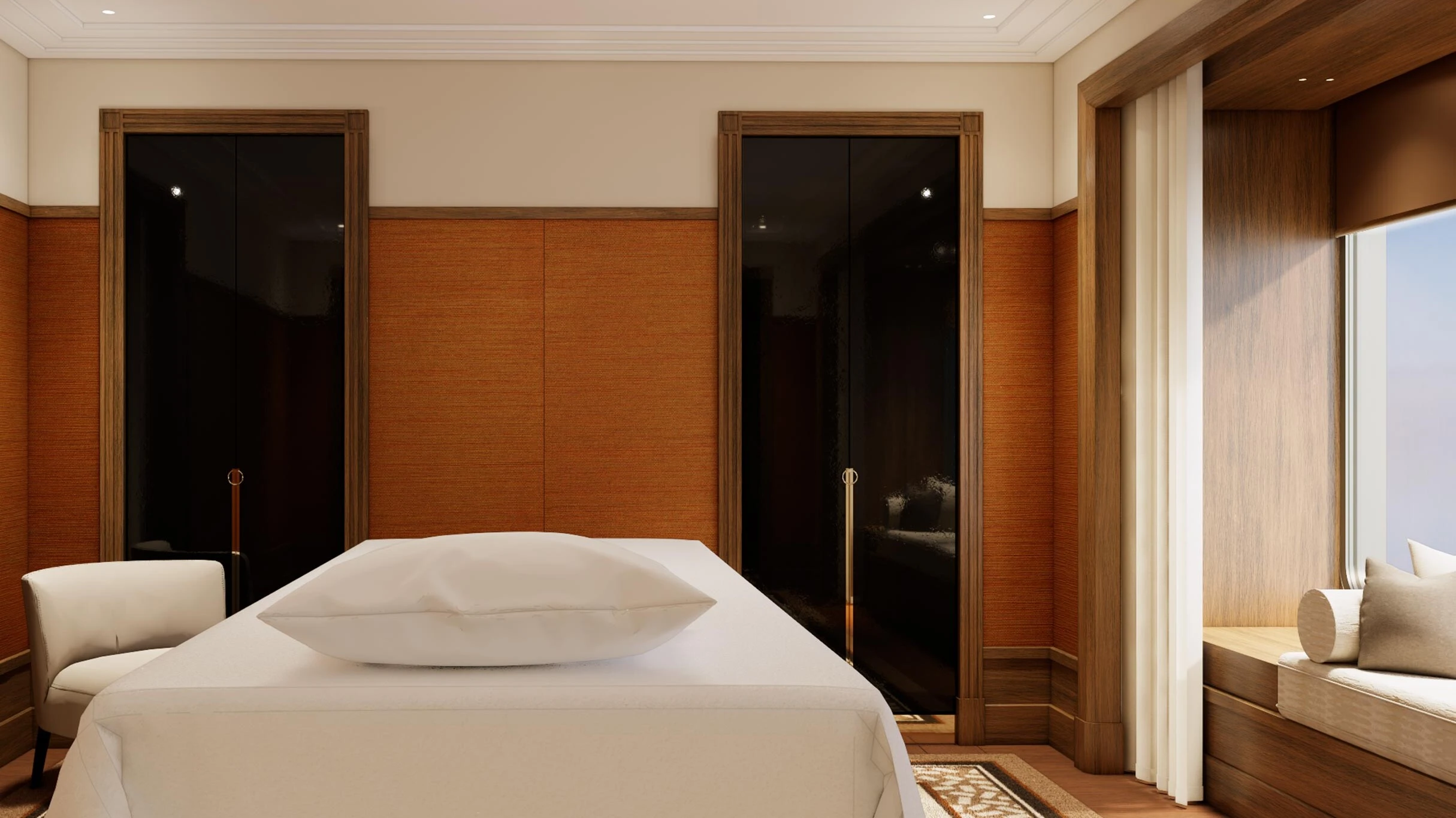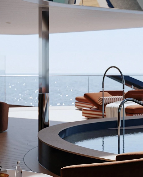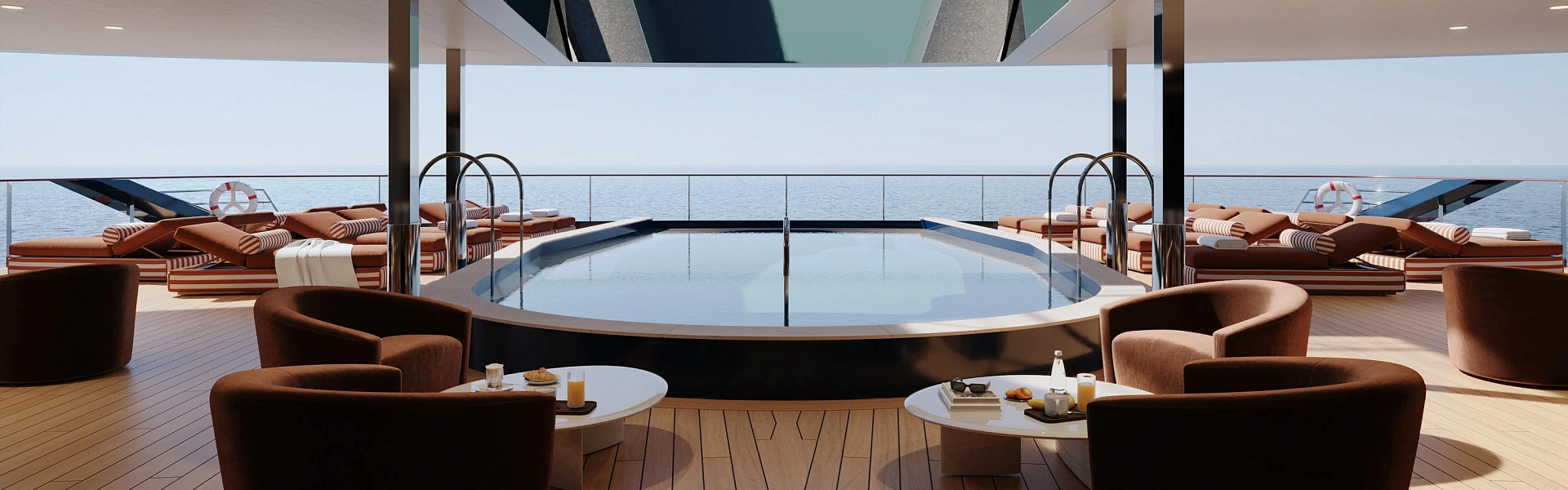 На борту — всего 54 люкса для 120 гостей, каждый площадью около 70 м². Венец коллекции — Президентский сьют площадью 1415 м² с террасой 530 м² — один из самых больших в истории. Помимо него: два бассейна, включая спортивный, два ресторана, спикизи-бар, амфитеатр-кабаре и даже студия звукозаписи — для тех, кто хочет увезти с собой собственный саундтрек путешествия.
