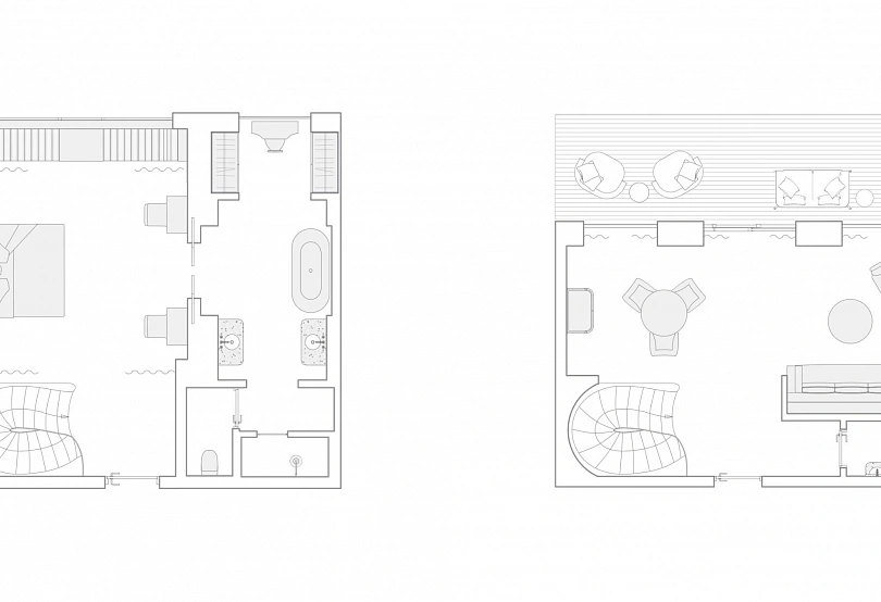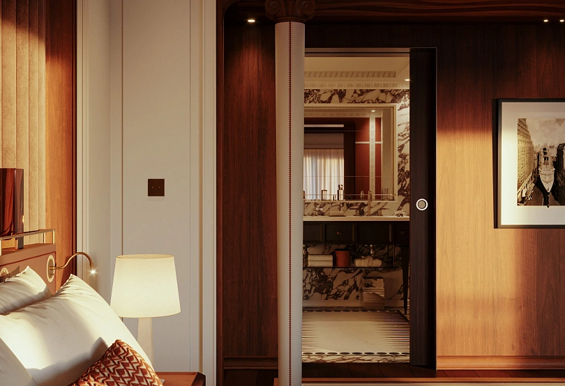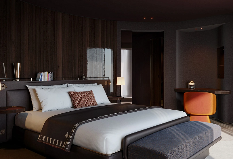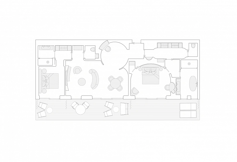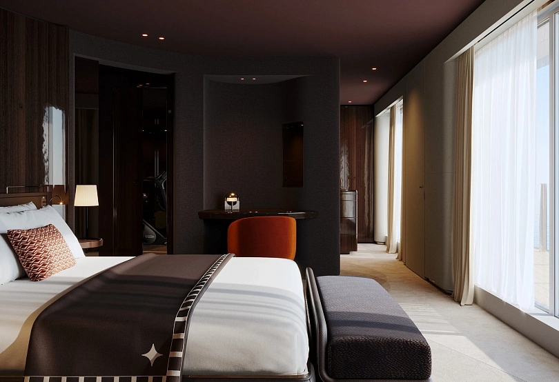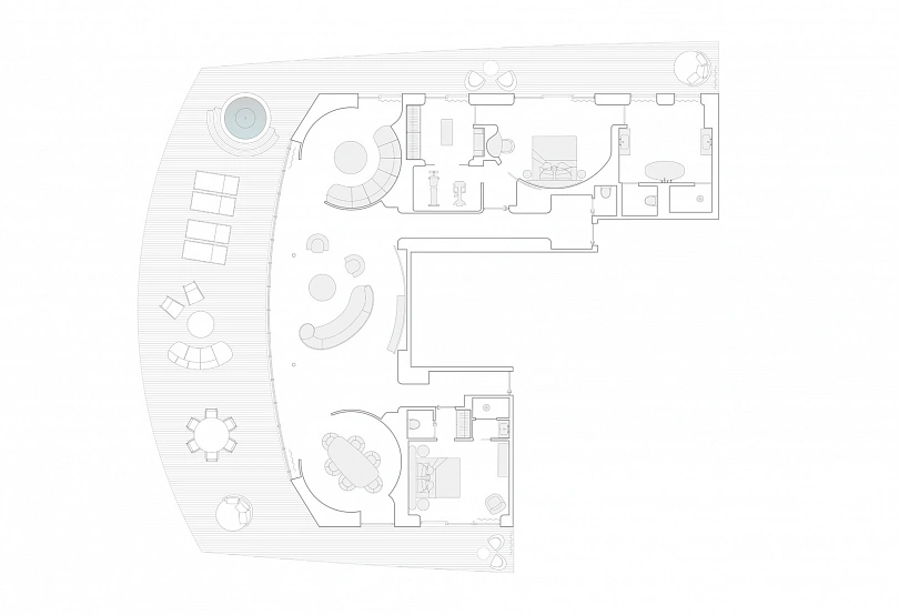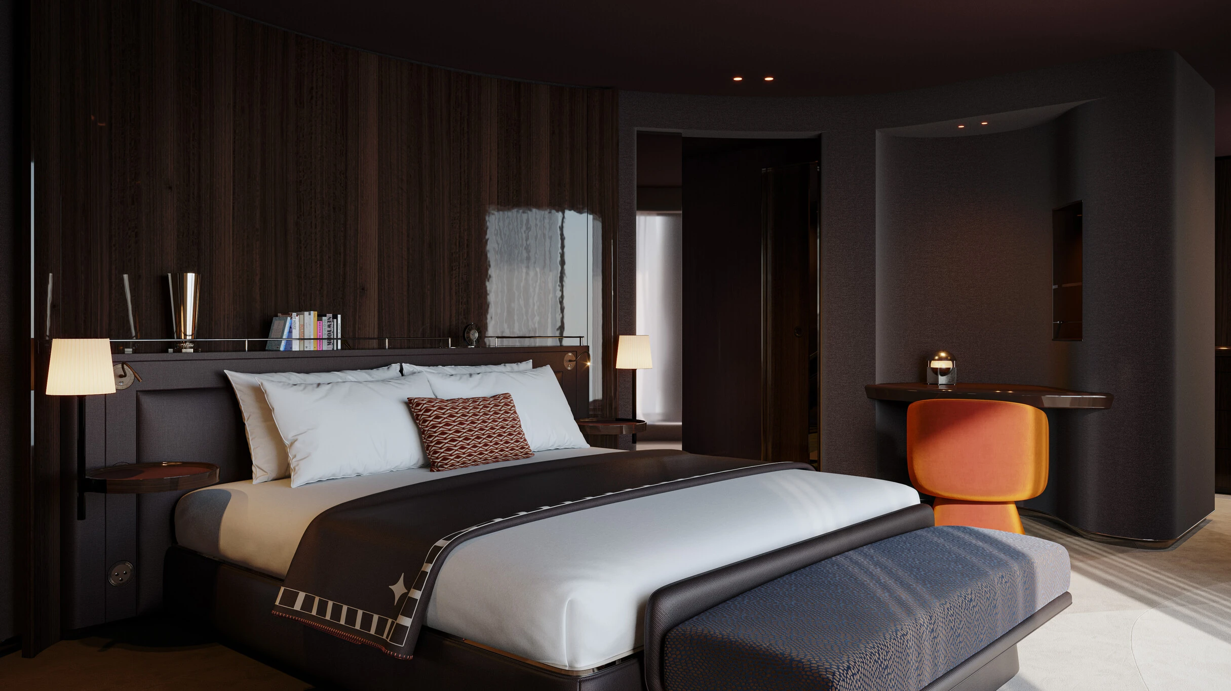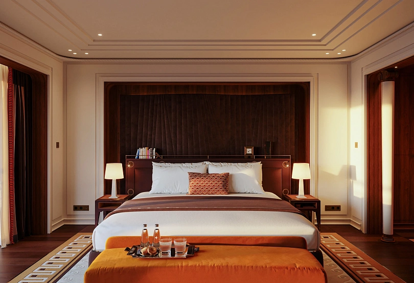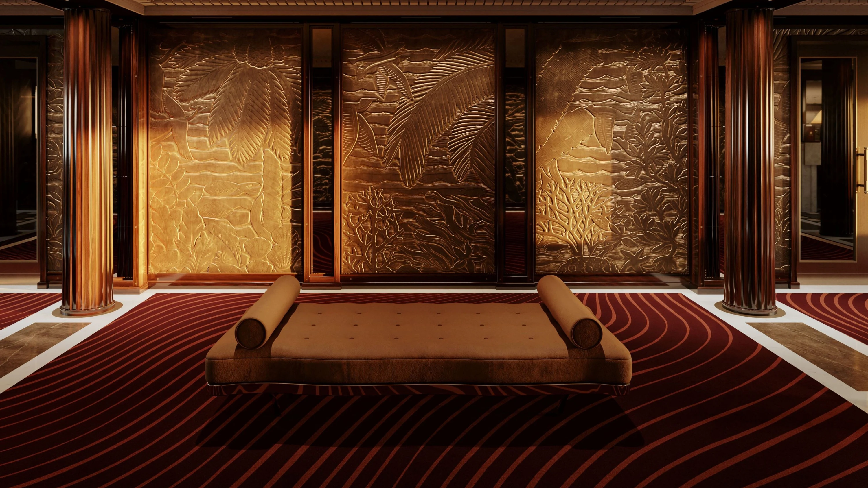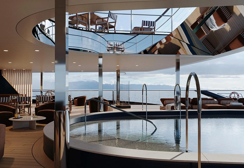 На борту — всего 54 люкса для 120 гостей, каждый площадью около 70 м². Венец коллекции — Президентский сьют площадью 1415 м² с террасой 530 м² — один из самых больших в истории. Помимо него: два бассейна, включая спортивный, два ресторана, спикизи-бар, амфитеатр-кабаре и даже студия звукозаписи — для тех, кто хочет увезти с собой собственный саундтрек путешествия.