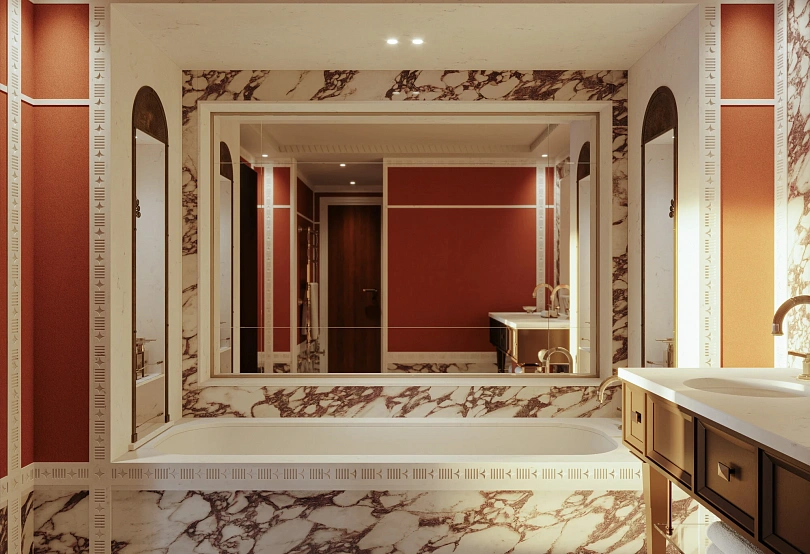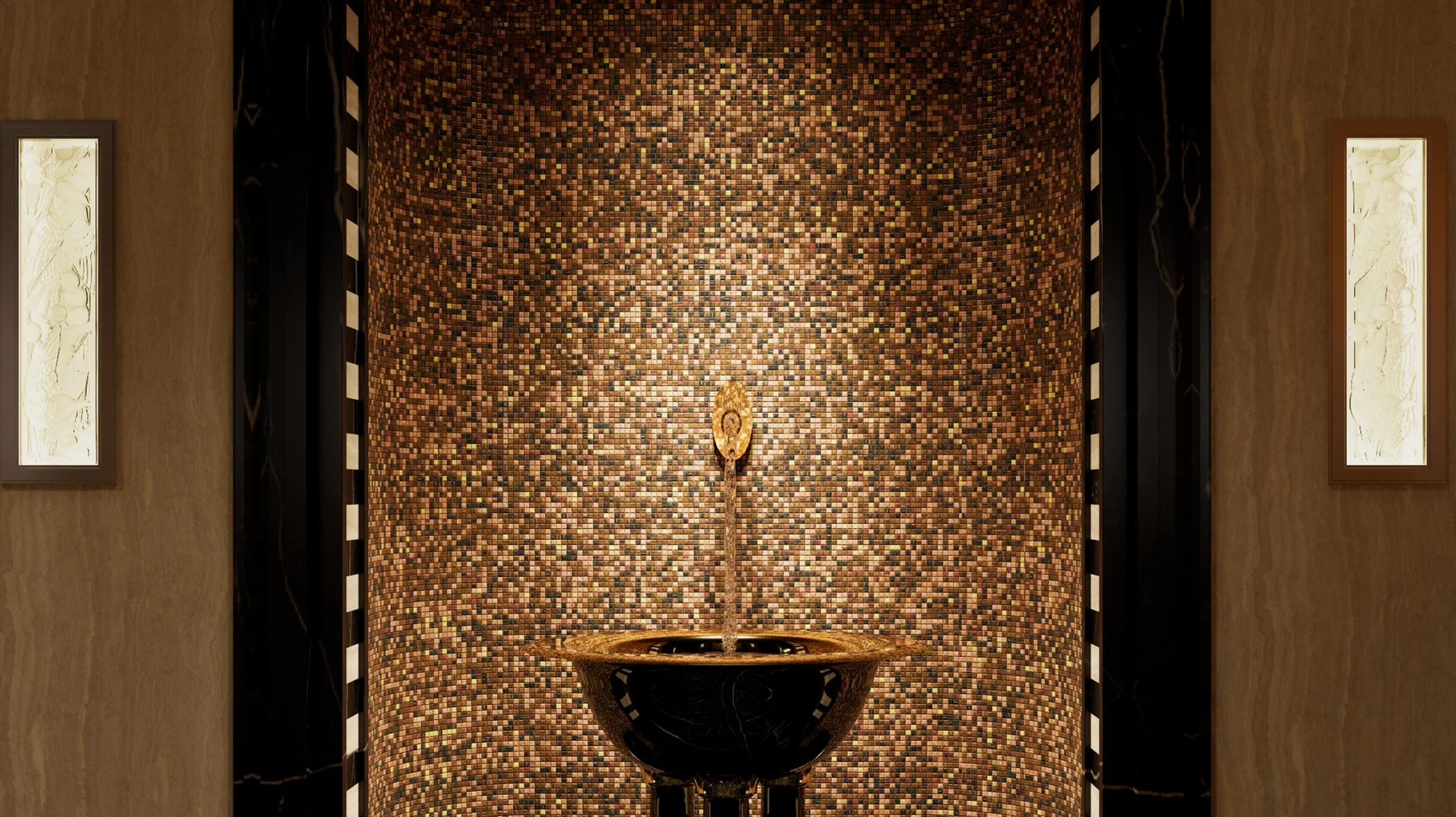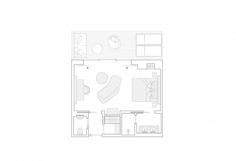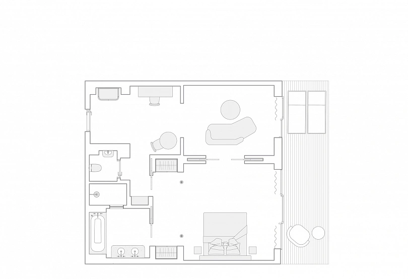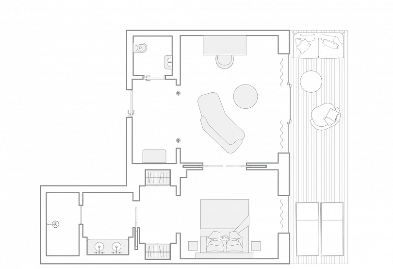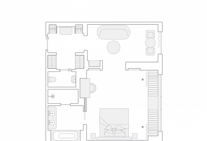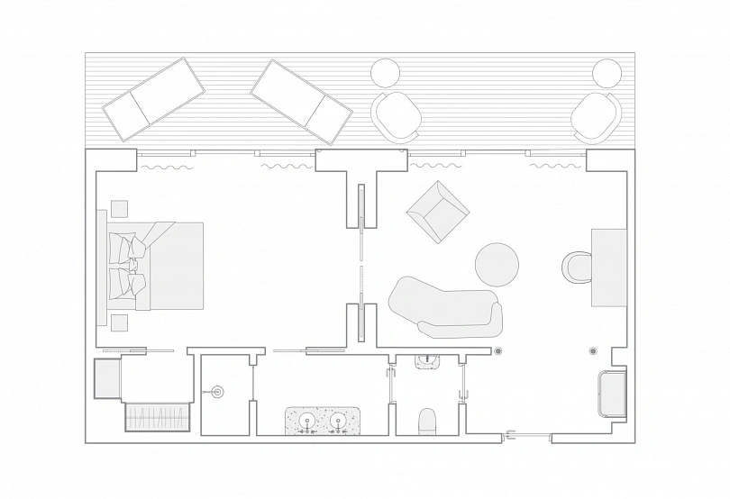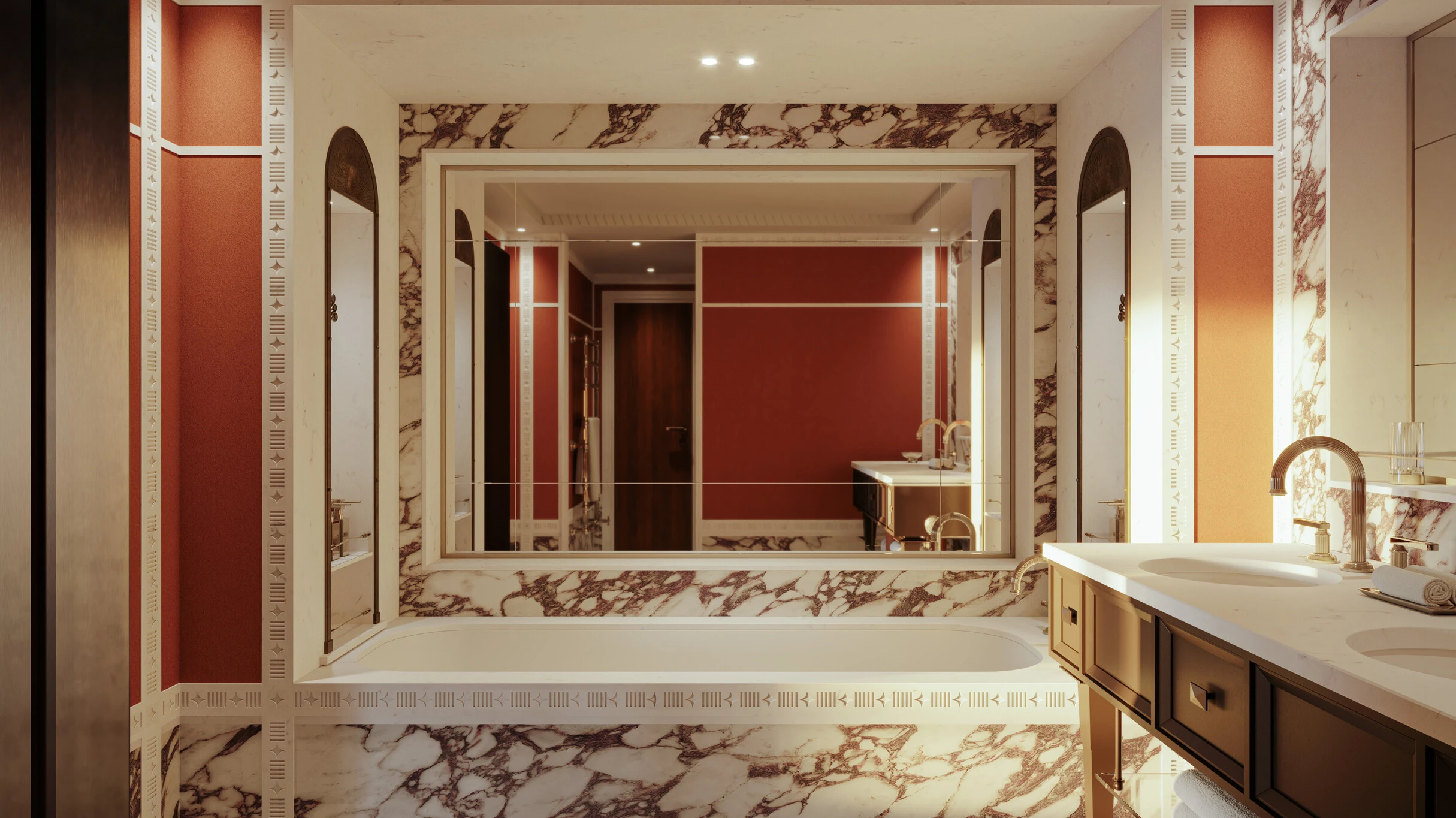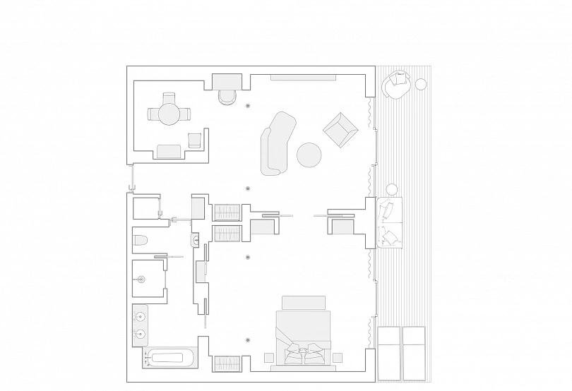 На борту — всего 54 люкса для 120 гостей, каждый площадью около 70 м². Венец коллекции — Президентский сьют площадью 1415 м² с террасой 530 м² — один из самых больших в истории. Помимо него: два бассейна, включая спортивный, два ресторана, спикизи-бар, амфитеатр-кабаре и даже студия звукозаписи — для тех, кто хочет увезти с собой собственный саундтрек путешествия.