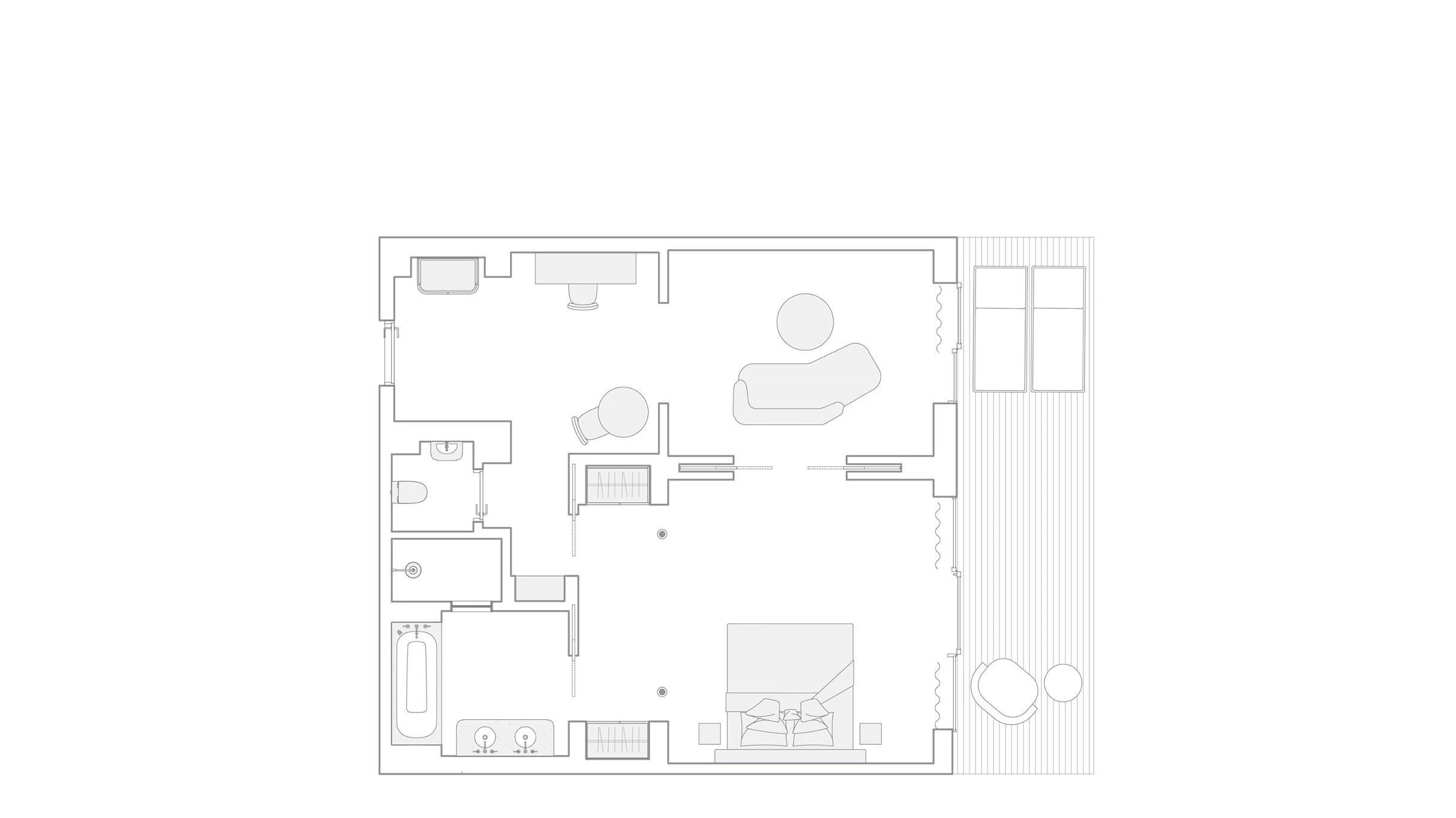 Просторный номер с отдельной гостиной, террасой, отделанной мрамором ванной и джакузи.
