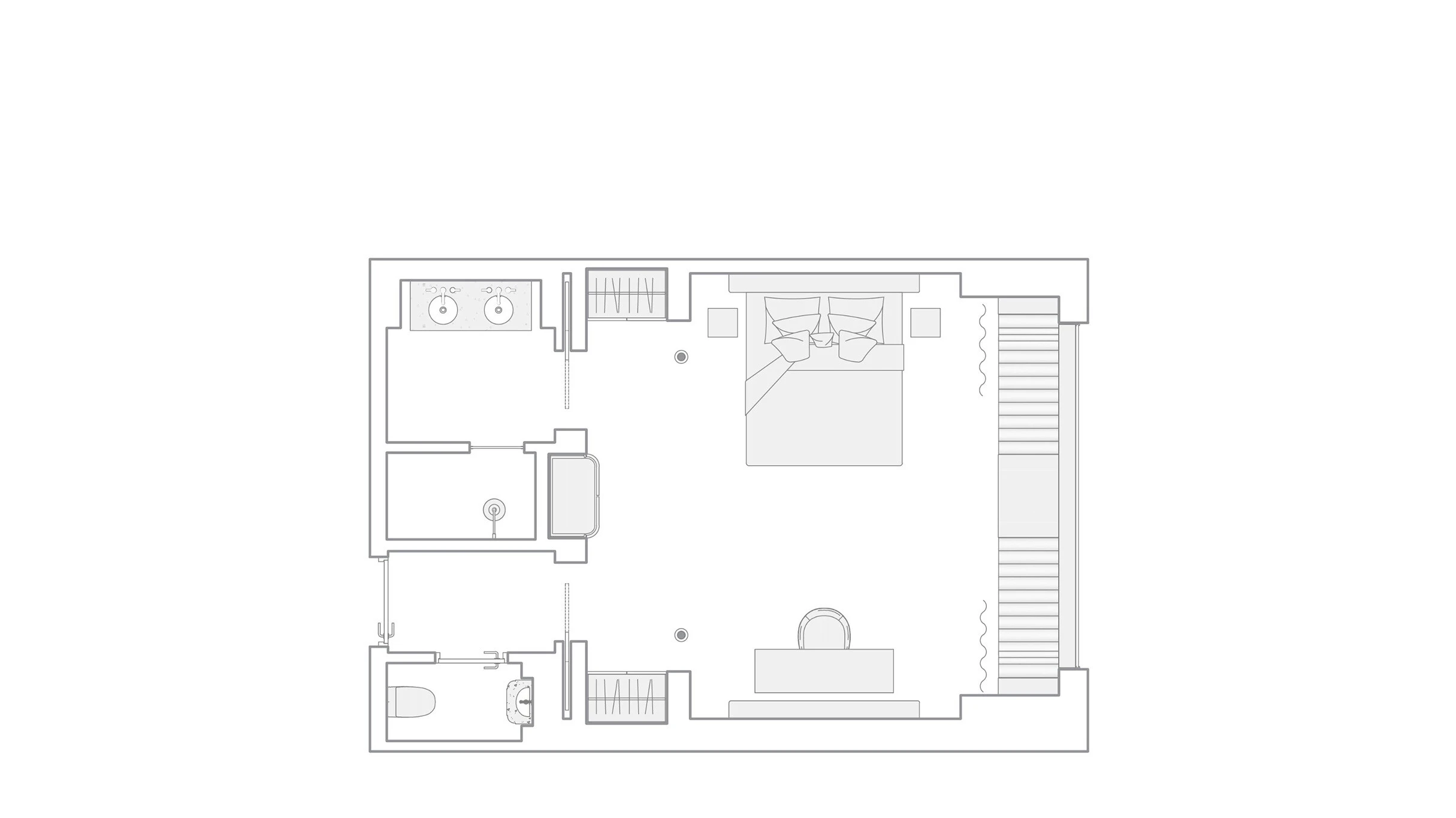 Номер с высокими потолками и панорамными окнами для бескрайних видов. Две раковины и душевая кабина в ванной комнате.