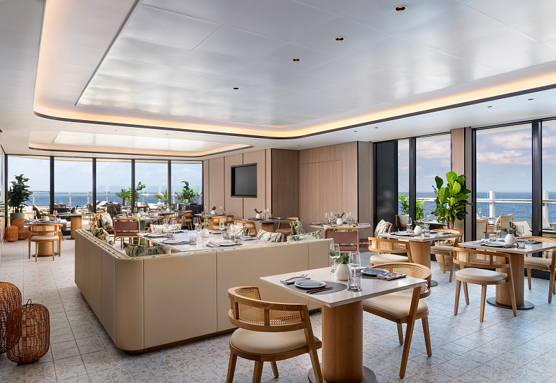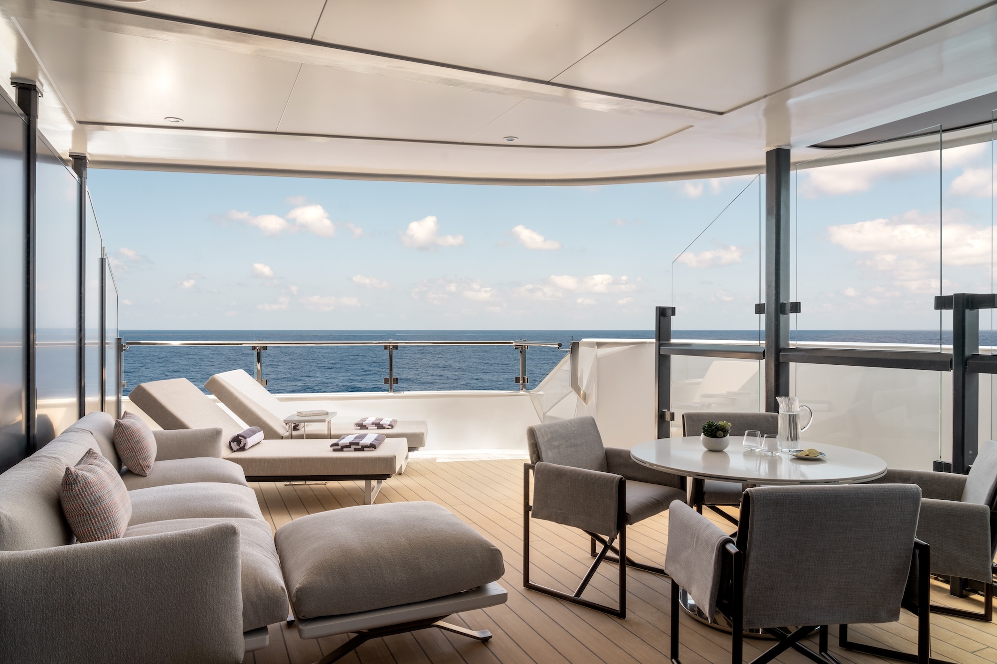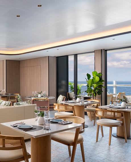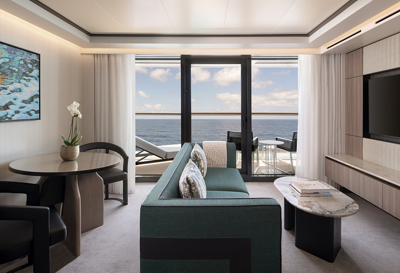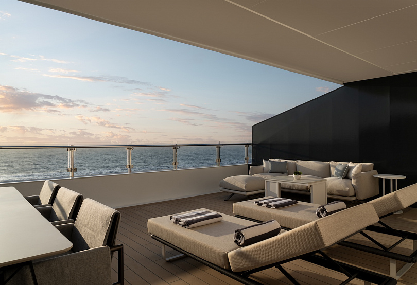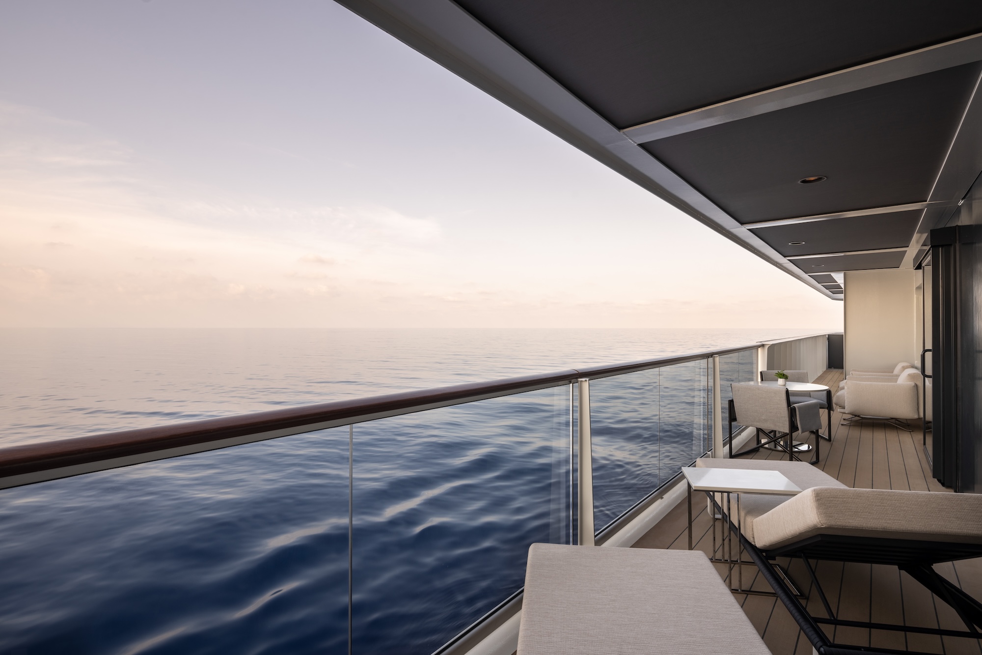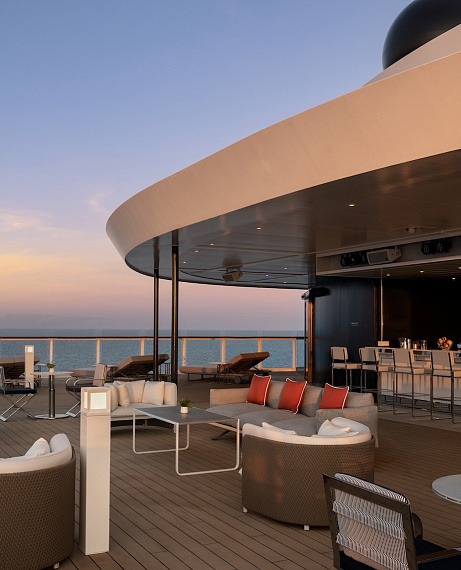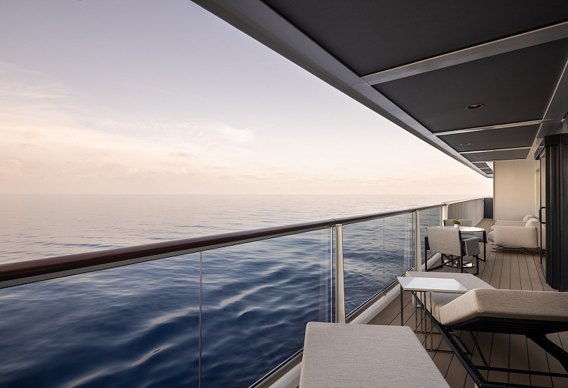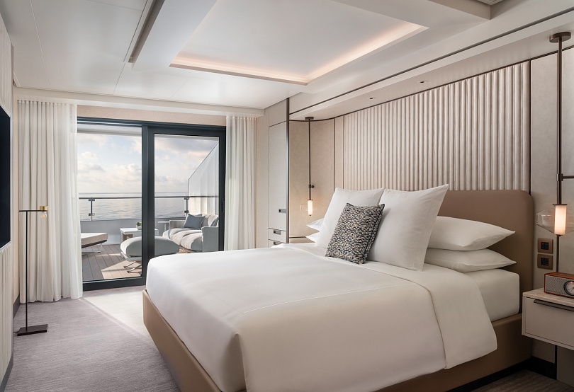 На борту 224 сьюта, каждый с приватной террасой и панорамными окнами. Пространство спроектировано так, чтобы море было частью интерьера: открытые лаундж-зоны и марина у самой воды создают ощущение частного курорта, а не круизного лайнера.