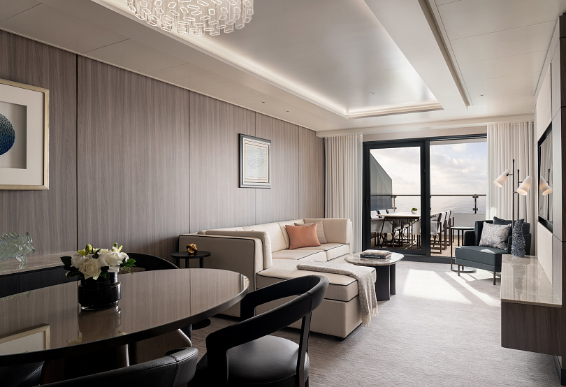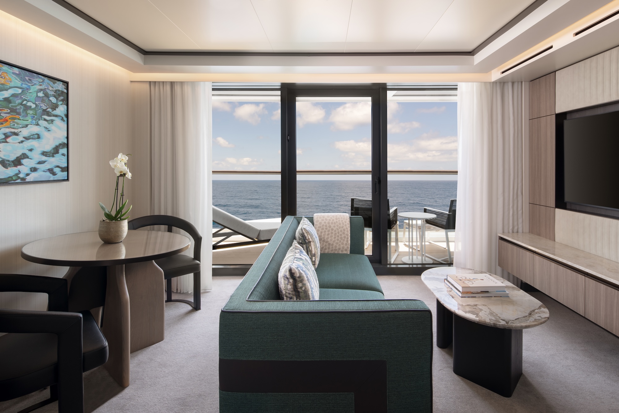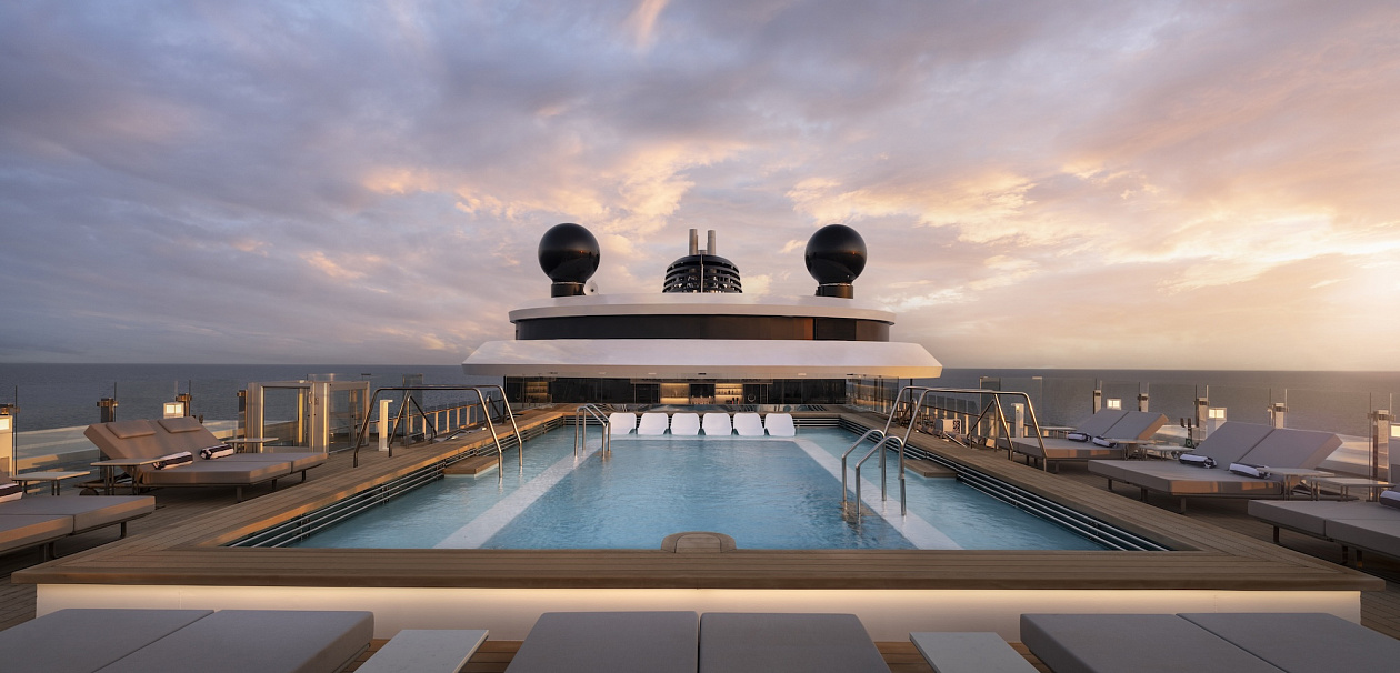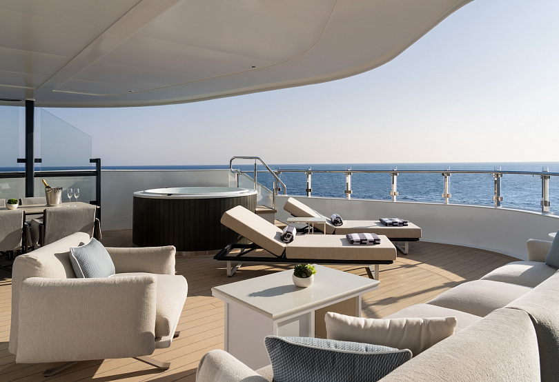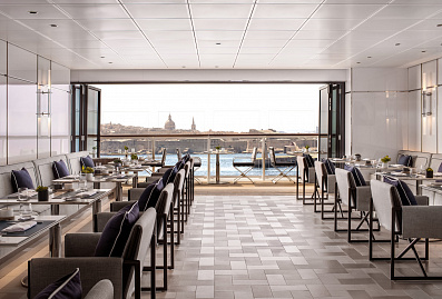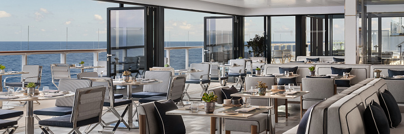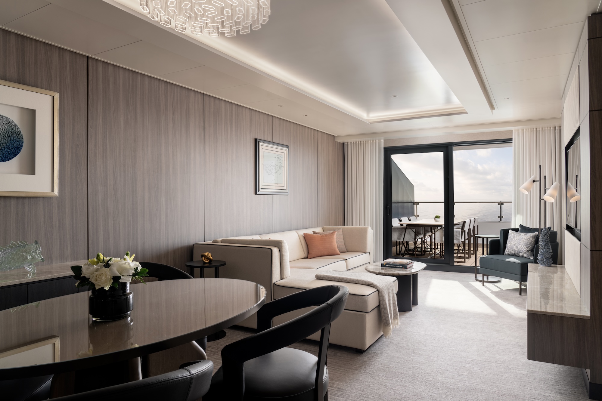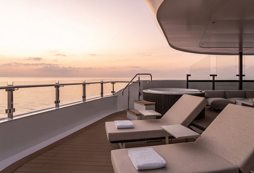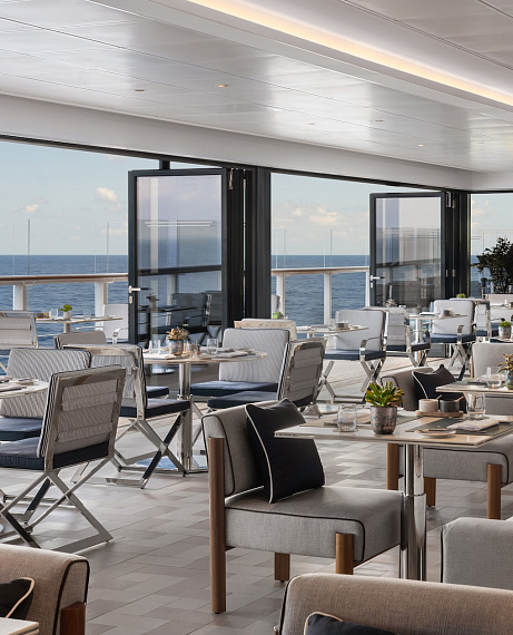На борту 224 сьюта, каждый с приватной террасой и панорамными окнами. Пространство спроектировано так, чтобы море было частью интерьера: открытые лаундж-зоны и марина у самой воды создают ощущение частного курорта, а не круизного лайнера.