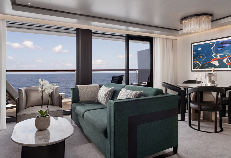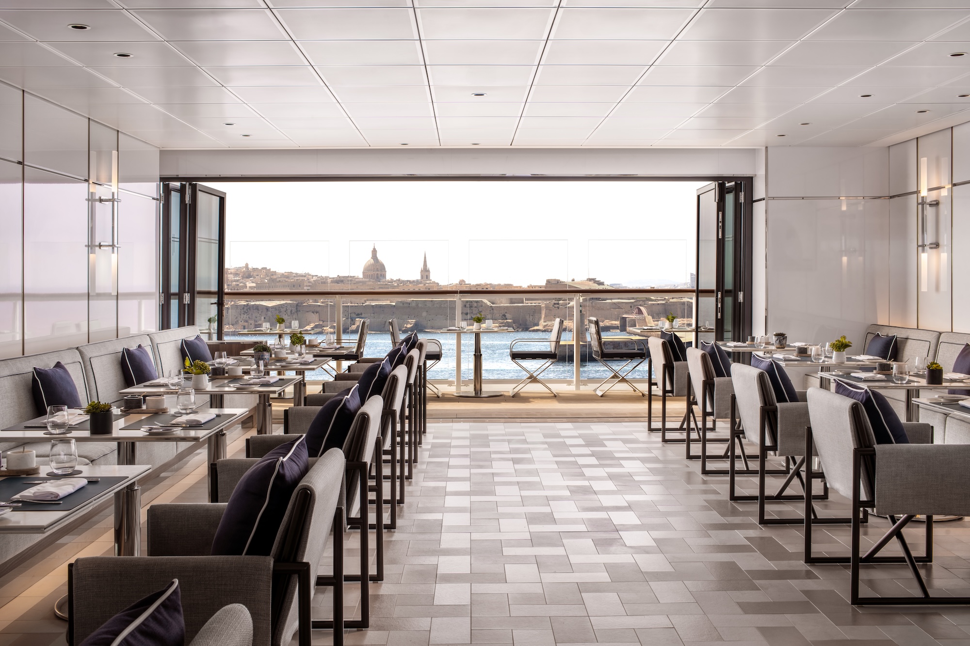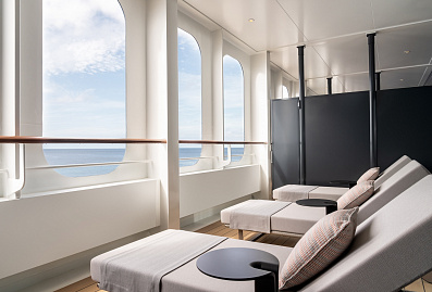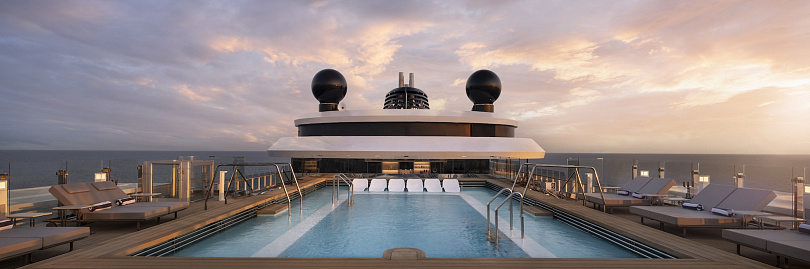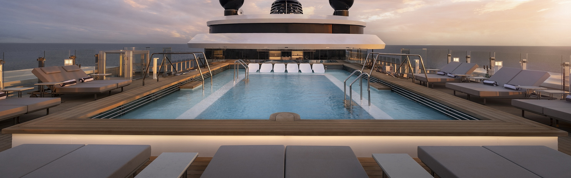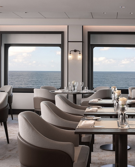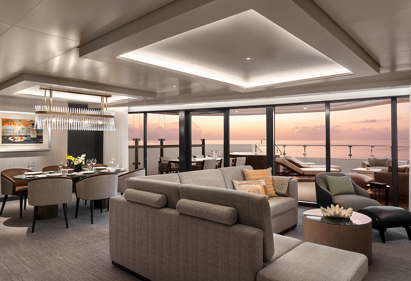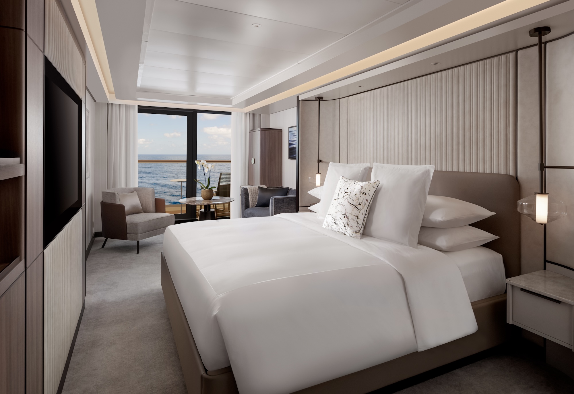 На борту 224 сьюта, каждый с приватной террасой и панорамными окнами. Пространство спроектировано так, чтобы море было частью интерьера: открытые лаундж-зоны и марина у самой воды создают ощущение частного курорта, а не круизного лайнера.