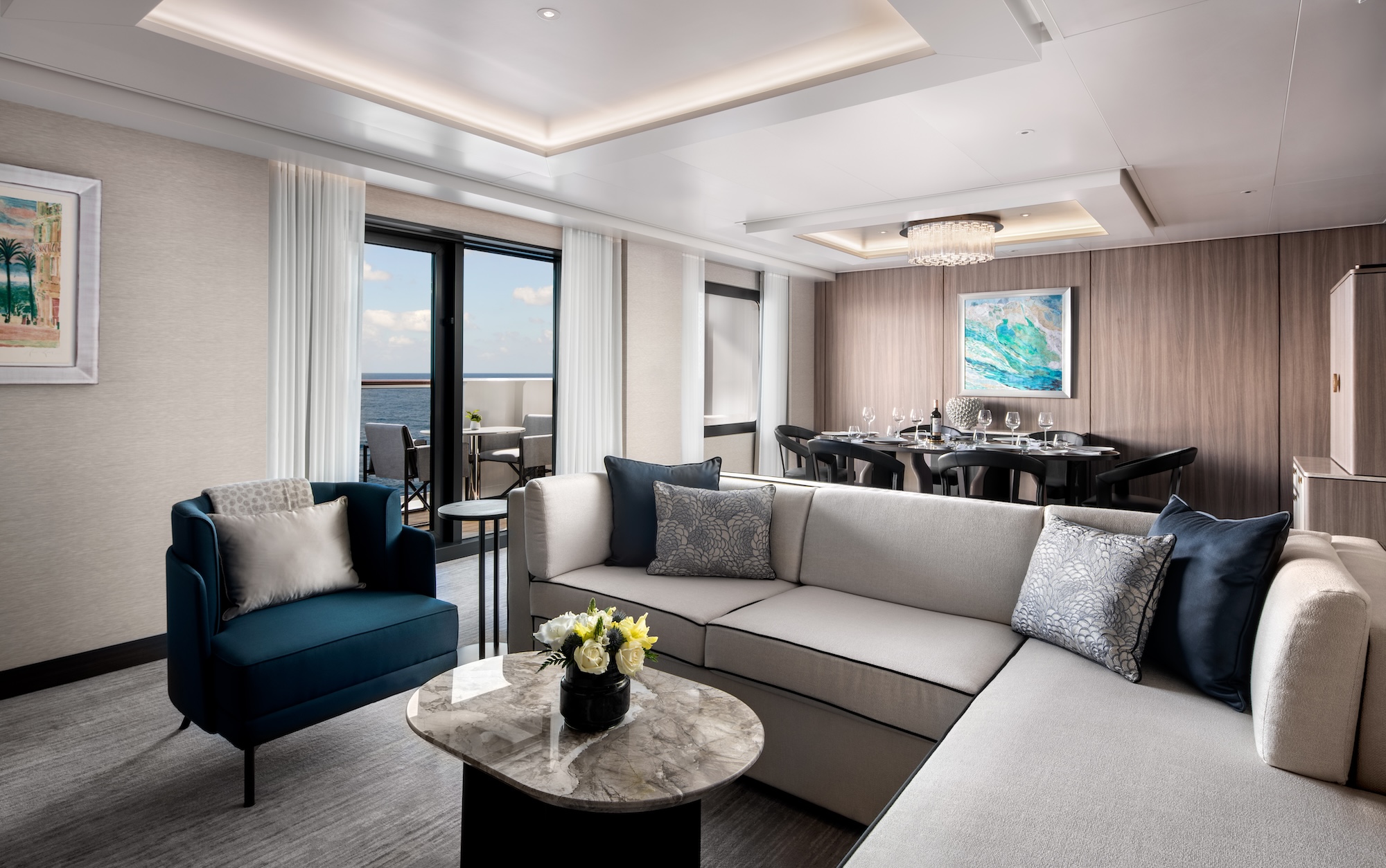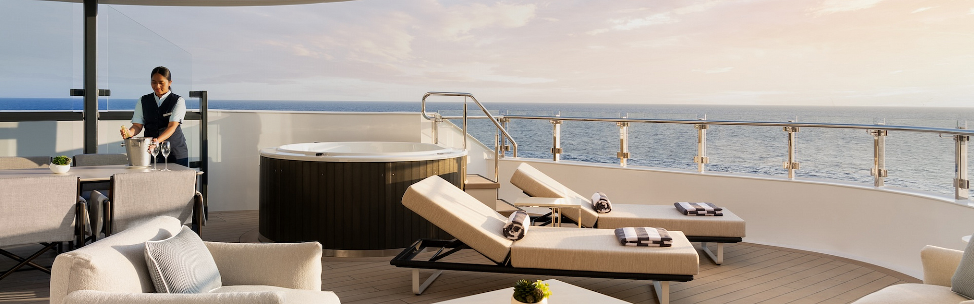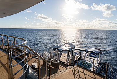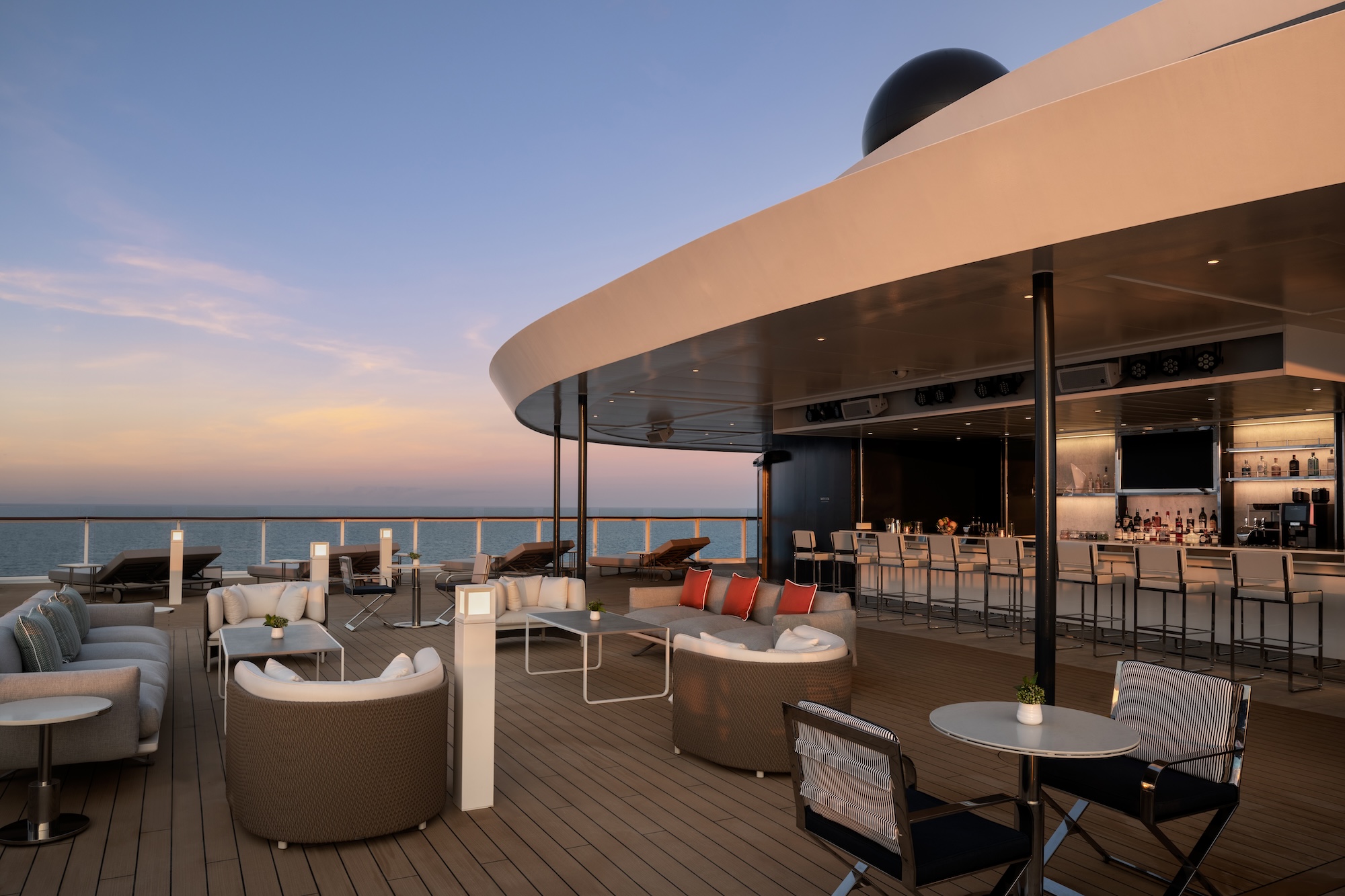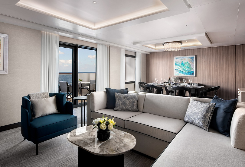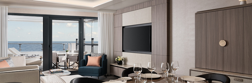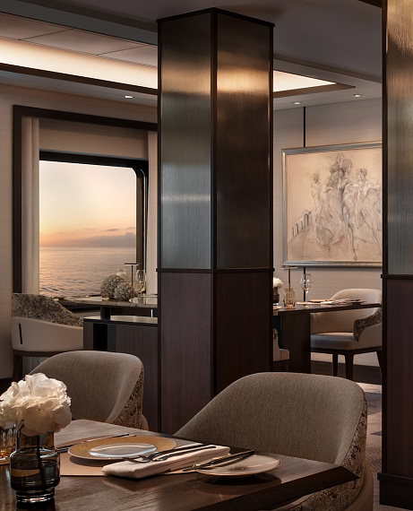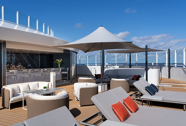 На борту 224 сьюта, каждый с приватной террасой и панорамными окнами. Пространство спроектировано так, чтобы море было частью интерьера: открытые лаундж-зоны и марина у самой воды создают ощущение частного курорта, а не круизного лайнера.